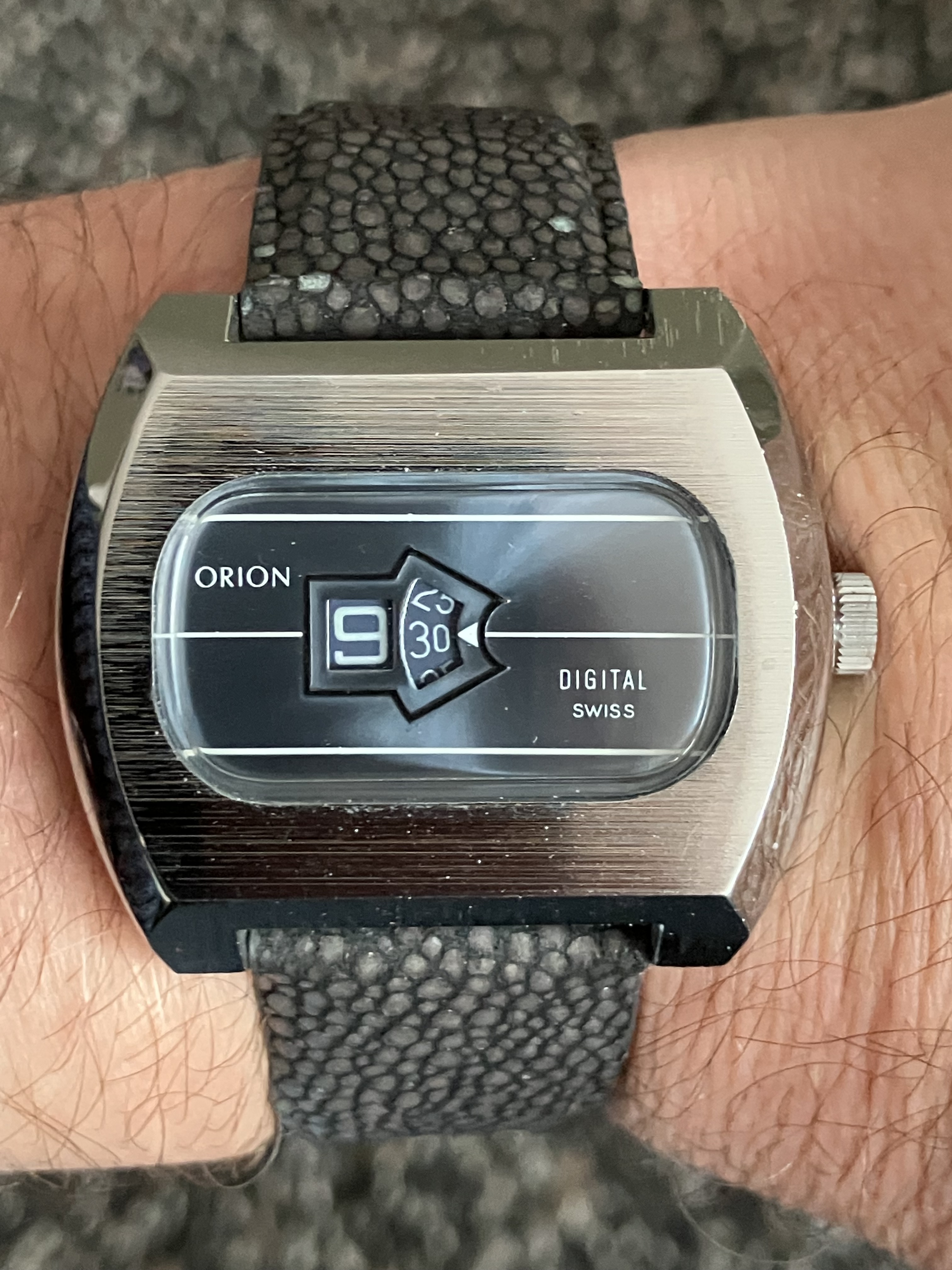 28 mm groot. RVS kastje, military style met zwarte numerieke wijzerplaat. Zoiets zou ik graag een millimetertje of 6 groter zien, maar het is niet anders als zo. Of liever gezegd: in de jaren 40 waren ze meestal niet veel groter.