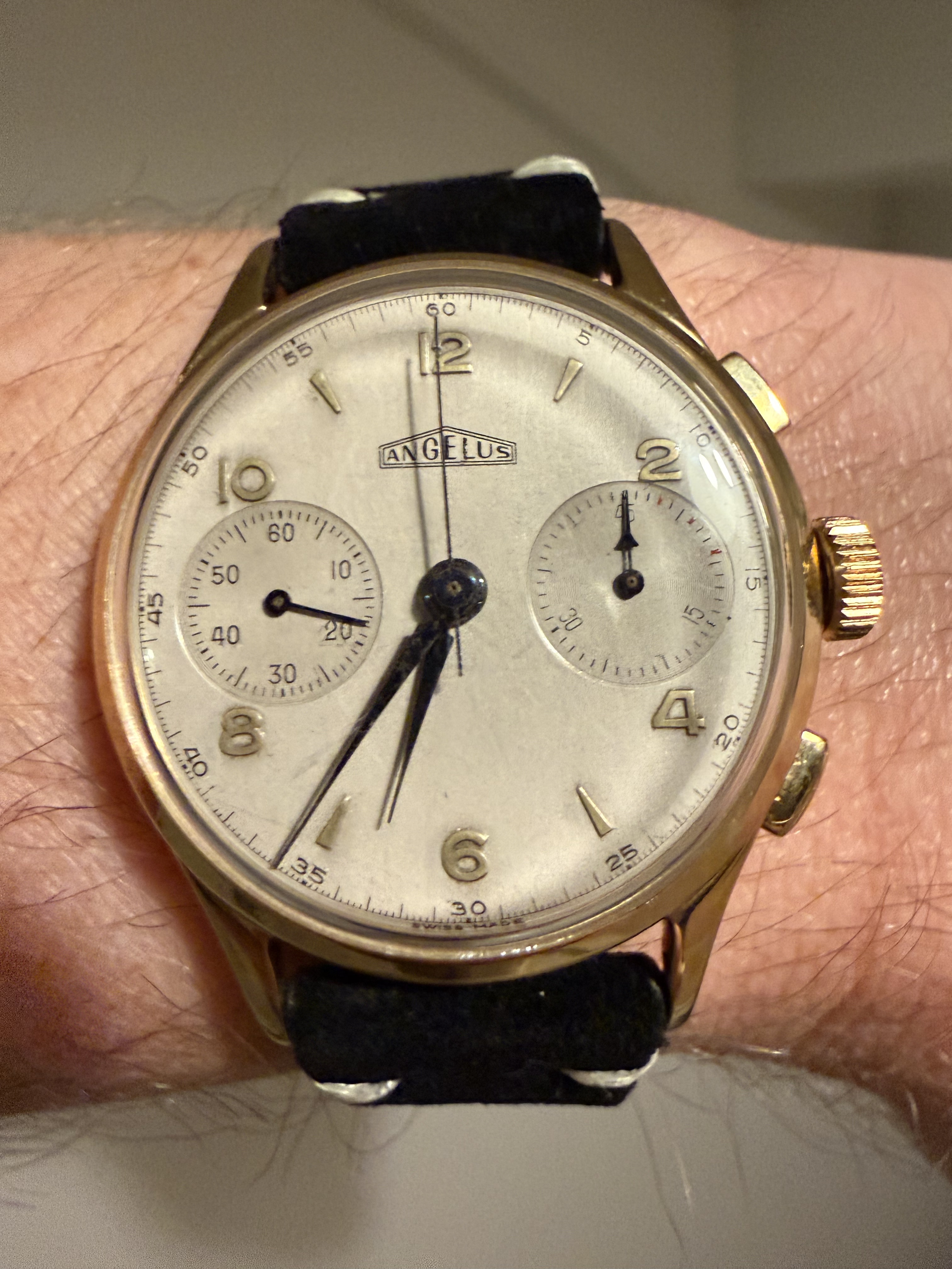Vandaag binnen gekregen deze Angelus Chrono waarschijnlijk eind jaren ‘40 met kaliber 215. Volledig opgeknapt, staat een korte video van op Insta via chron0graphie voor de liefhebber.
