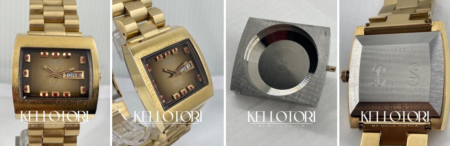 Maar het wordt nog aardiger. Het vierkante horloge van de Firma Kellotori komt me wel héél bekend voor. Ik heb er namelijk zelf ook één! Alleen staat daar geen Granlund Vaasa op, maar Leijona. Heel toevallig óók een Fins merk. Toeval bestaat niet roep ik al jaren, maar kennelijk waren er wel twee Finse horlogeboeren die allebei hetzelfde model horloge in Zwitserland lieten maken. Kijk zelf en ervaar wat leuk het is om onbekende horlogemerken te verzamelen.