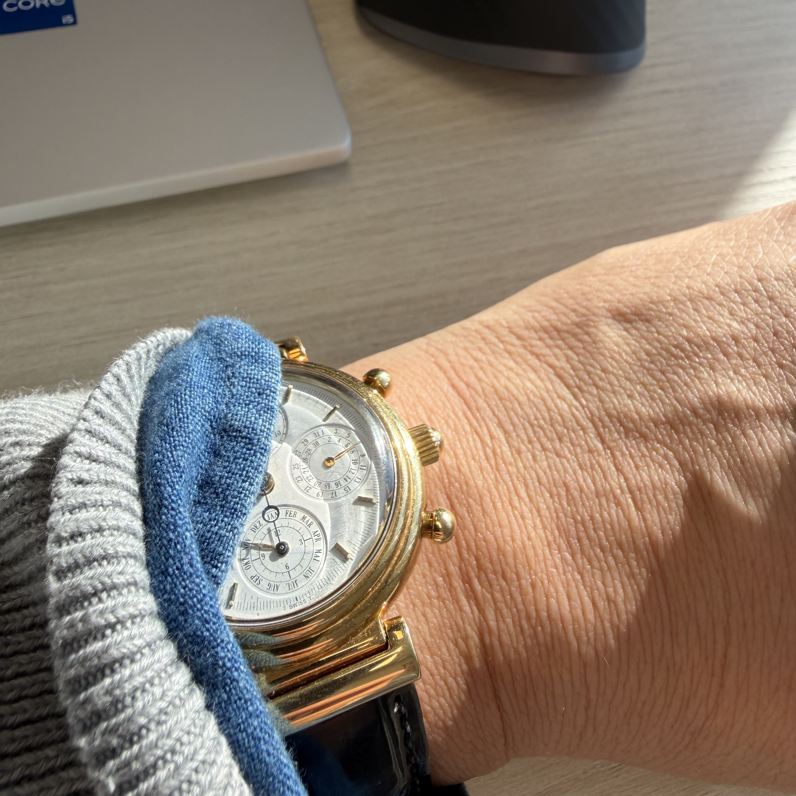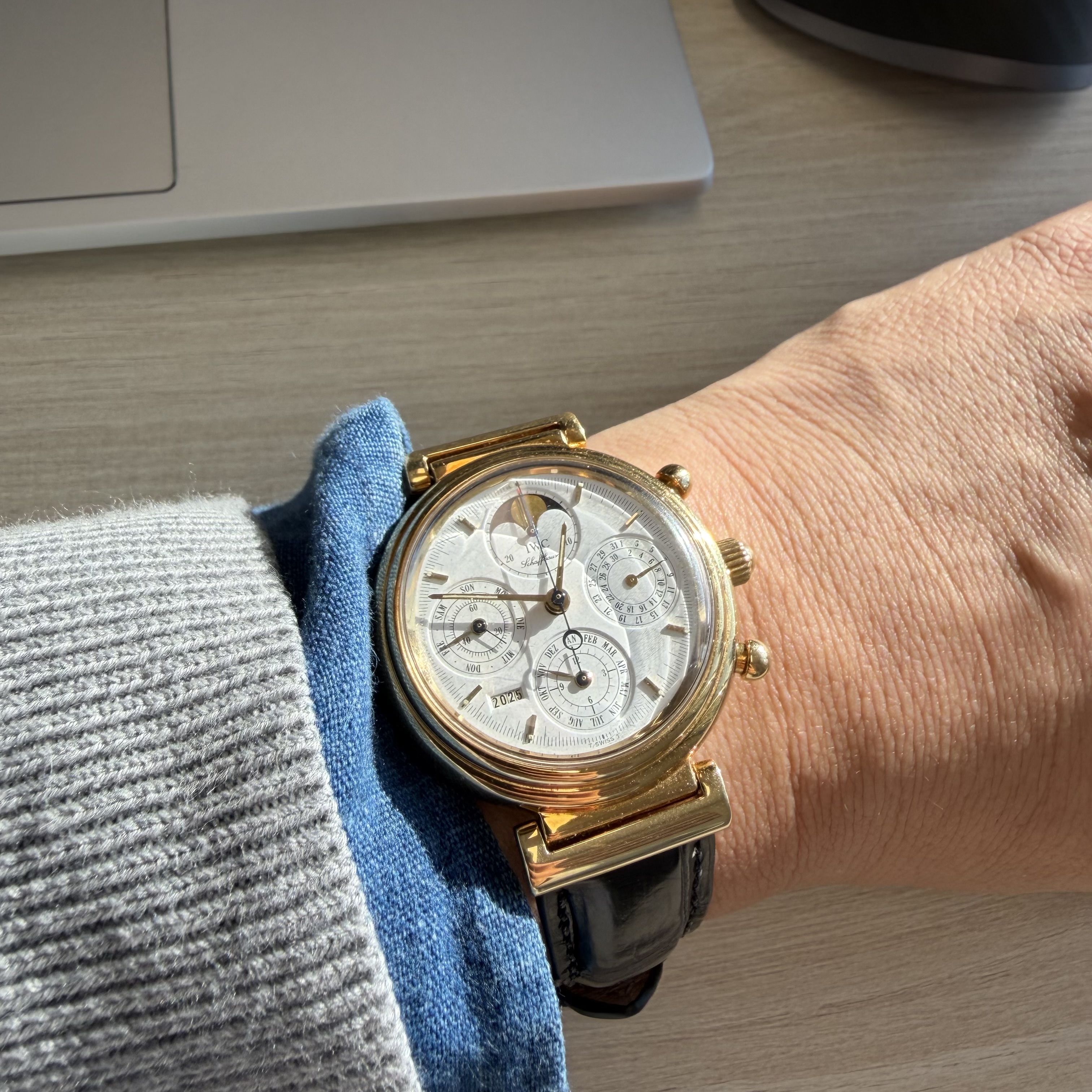 Een eeuwige kalender met jaaraanduiding is toch wel cool. De kalendermodule is wel gevoelig, vooral als je hem lang niet gedragen hebt: wanneer je lang met de kroon moet doordraaien, heb je de kans dat je doorslipt en dan moet je naar een horlogemaker om het weer goed te laten zetten. Daarom regelmatig dragen is het advies, en dat is geen straf