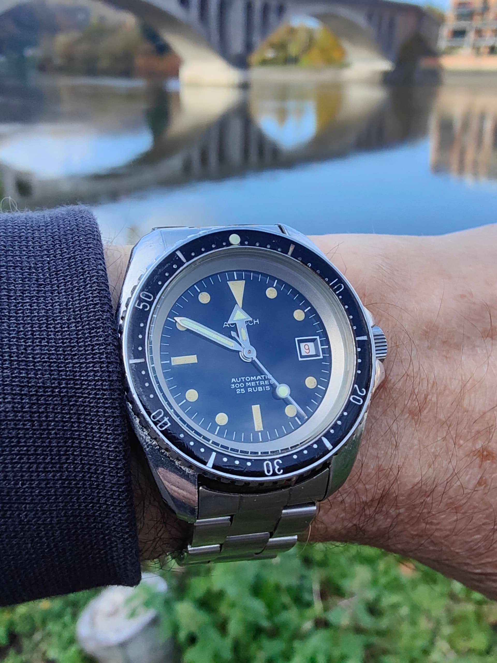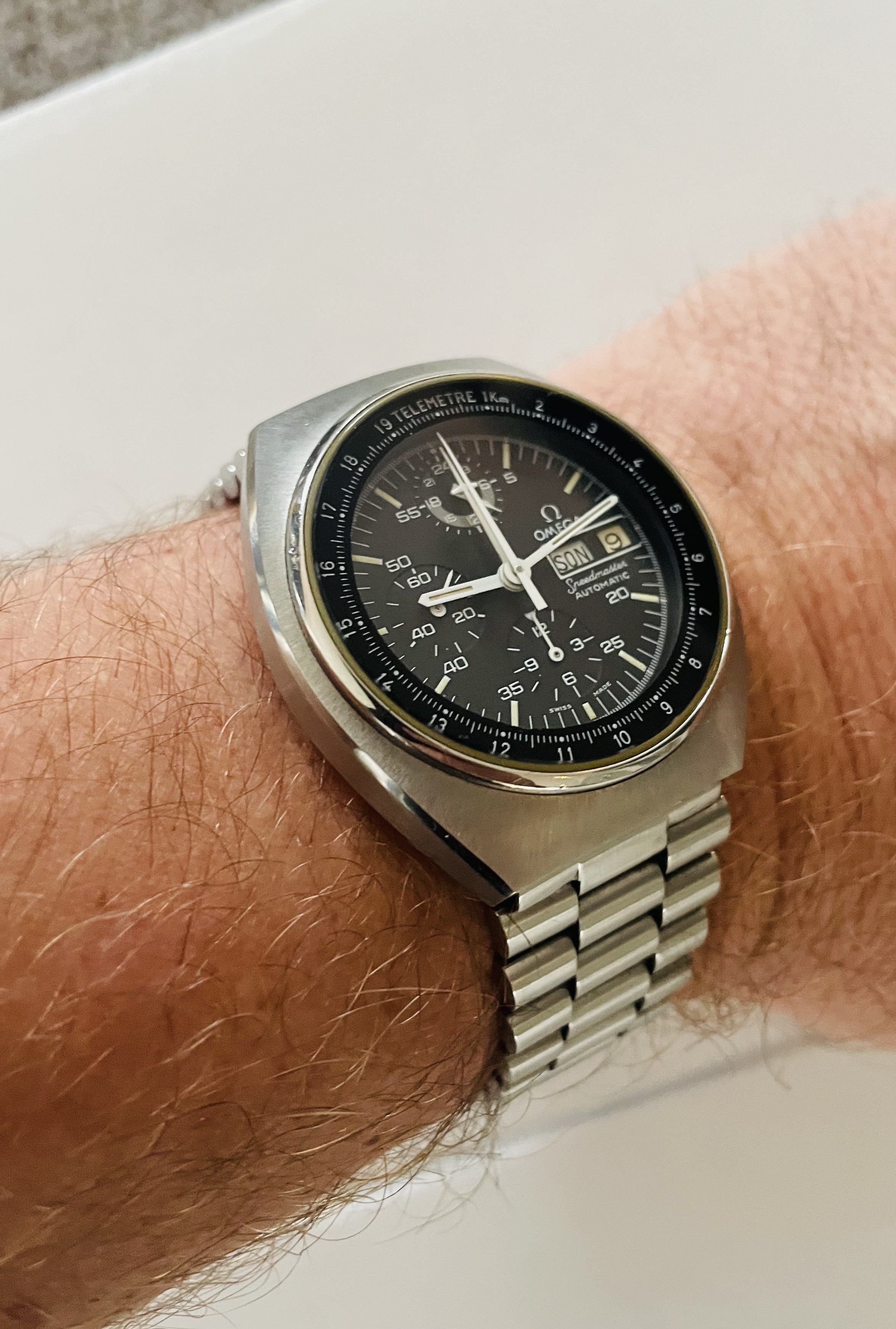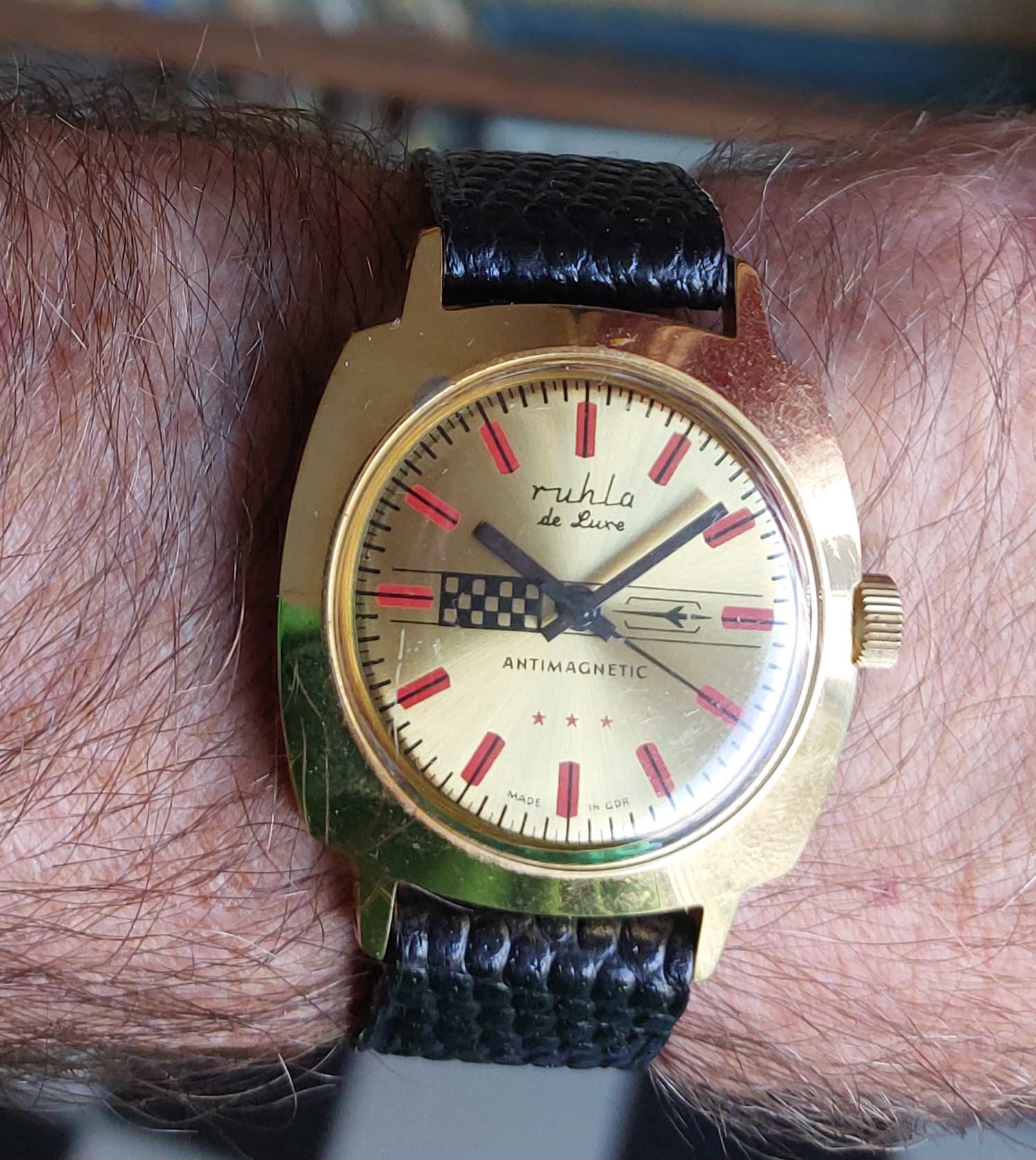 Ik vind vooral de combinatie van de donkere wijzerplaat met roségouden indexen en wijzers erg geslaagd, rustig maar met een chique uitstraling. Leuk detail is het kleine merkteken op de rechter bovenlug; vermoedelijk een oud invoerstempel dat aangeeft dat er destijds netjes invoerrechten zijn betaald.