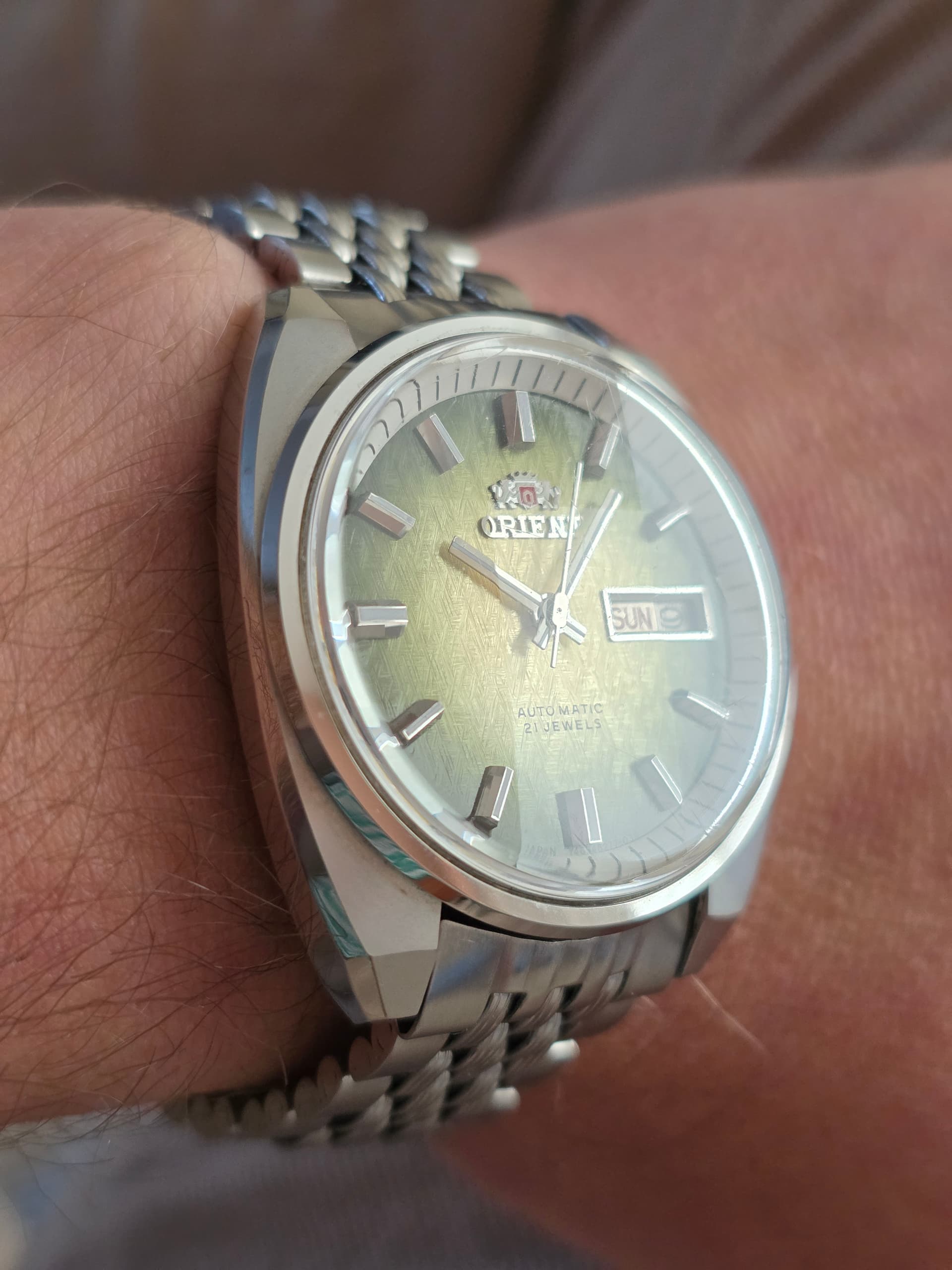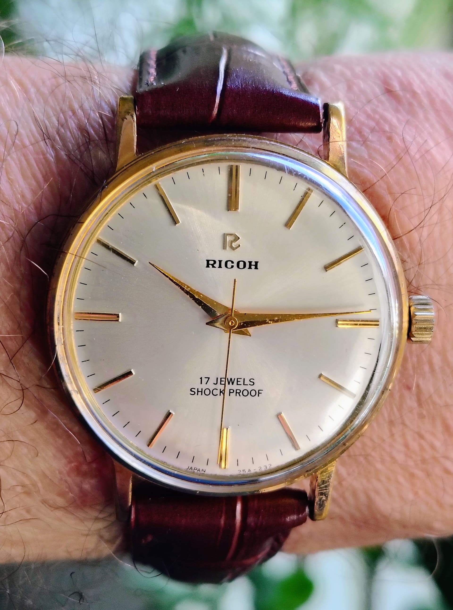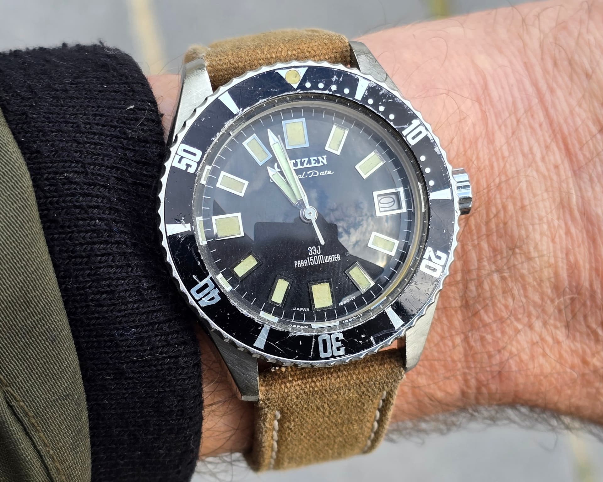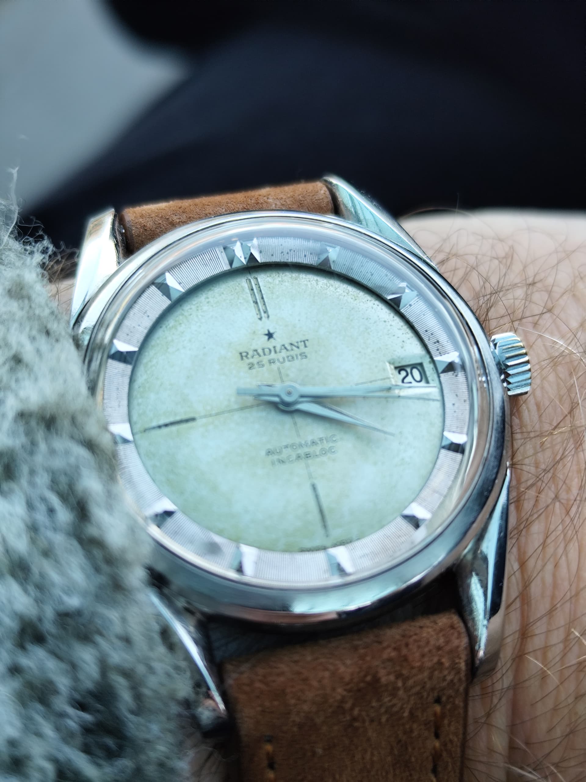 Ik vind vooral de combinatie van de donkere wijzerplaat met roségouden indexen en wijzers erg geslaagd, rustig maar met een chique uitstraling. Leuk detail is het kleine merkteken op de rechter bovenlug; vermoedelijk een oud invoerstempel dat aangeeft dat er destijds netjes invoerrechten zijn betaald.