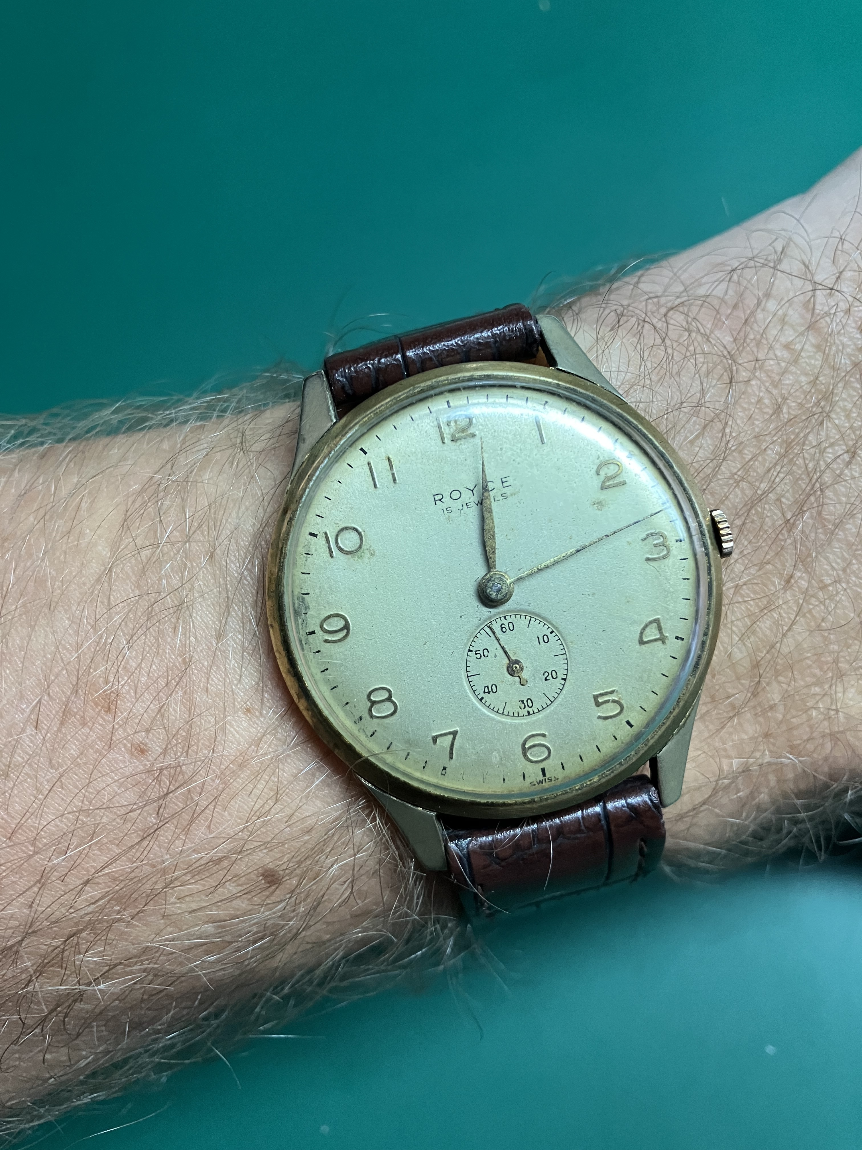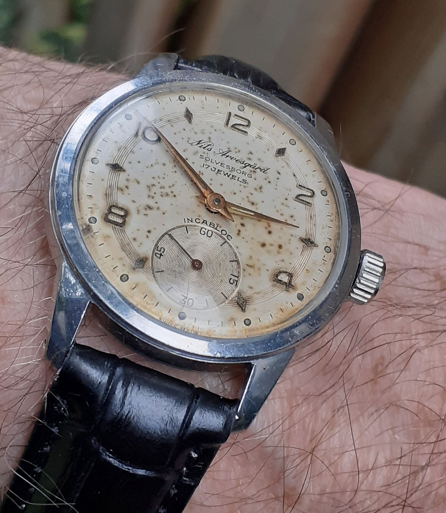 Vandaag draag ik deze charmante Nils Arvesgård uit Sölvesborg, Zweden. Een bescheiden maar bijzondere vondst — ik heb hem ooit op een veiling gewonnen voor slechts €14. Binnenin tikt een betrouwbaar AS 1130-kaliber met 17 jewels.
