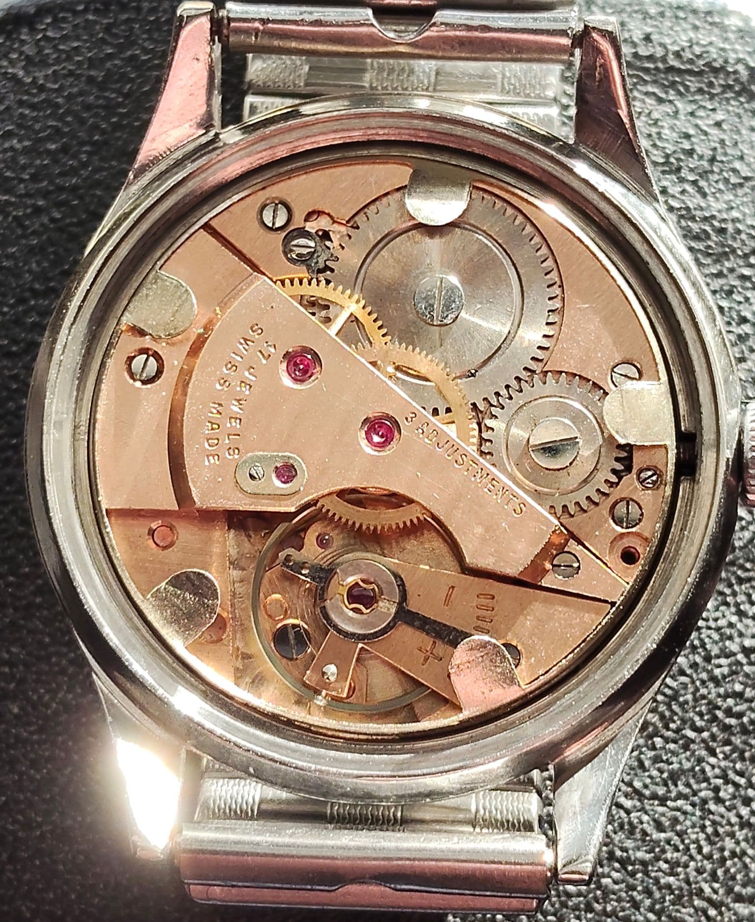 Het horloge heeft een mooie tweekleurige wijzerplaat met blauwe sectorring en goudkleurige cijfers die nog steeds prachtig oplichten. Binnenin tikt het betrouwbare AS 1604/31-kaliber.