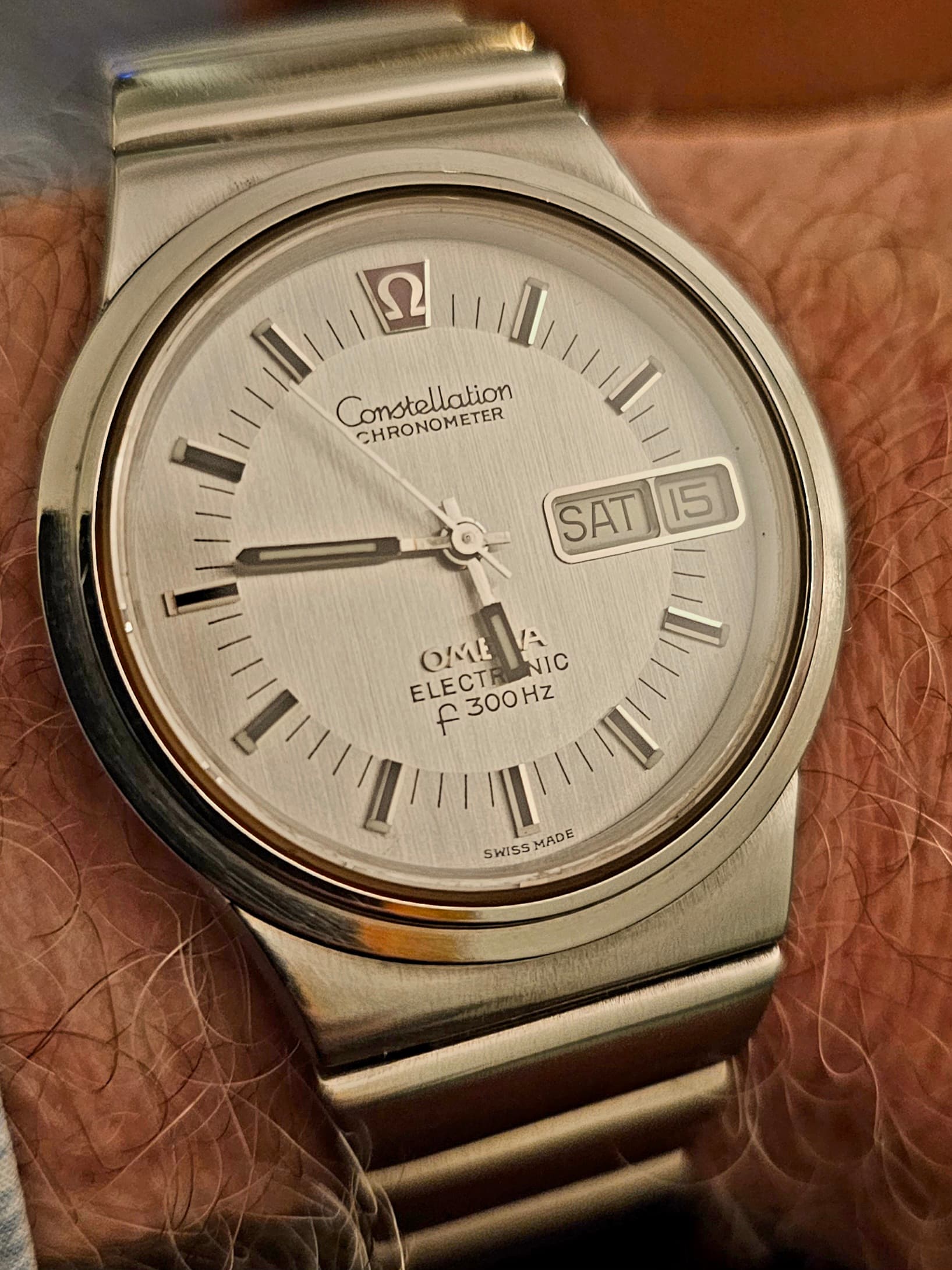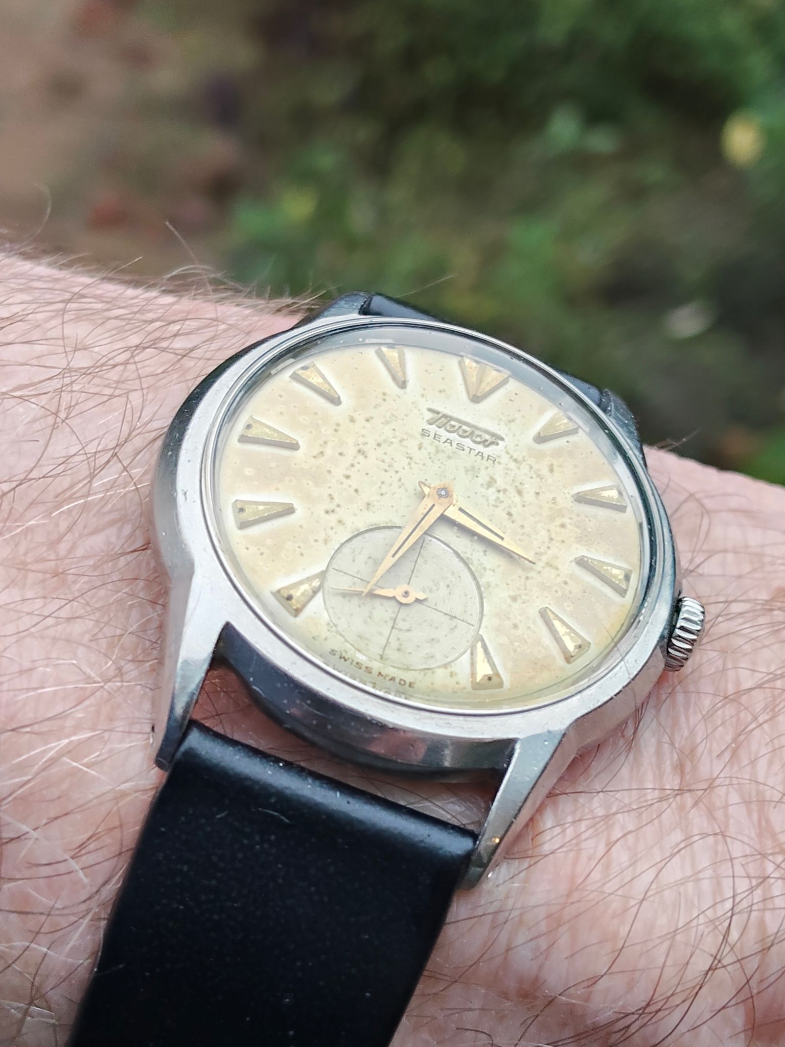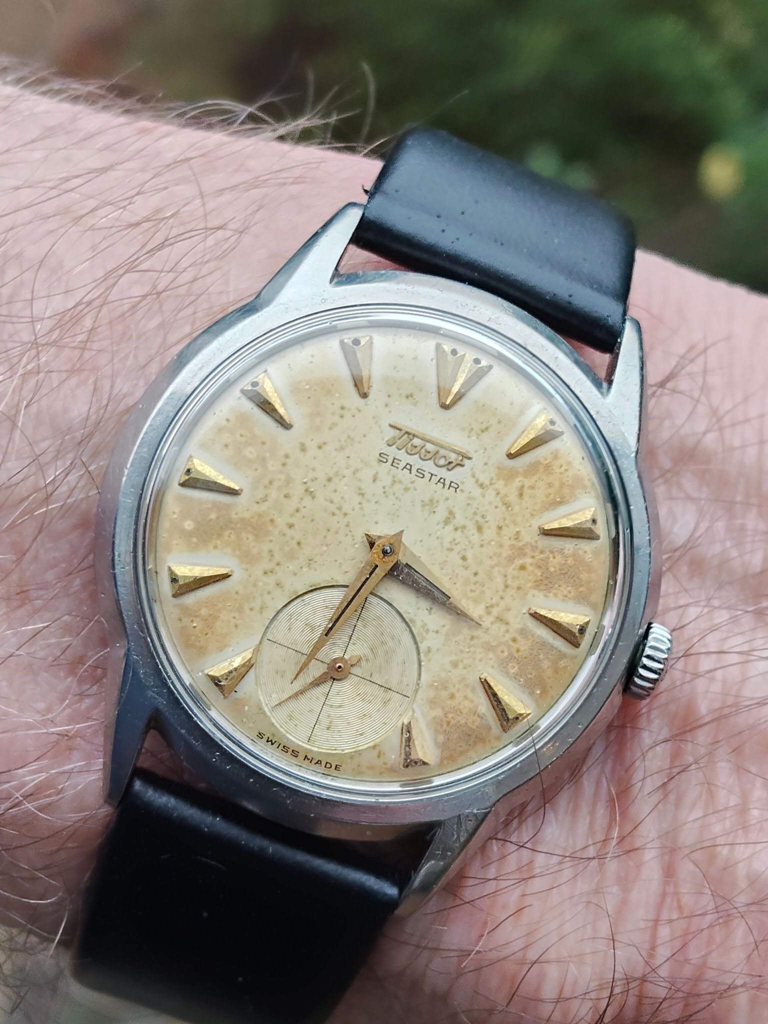 Vandaag draag ik deze Tissot Seastar uit 1959, met kleine seconde boven de zes. De wijzerplaat heeft in de loop der jaren een flinke “sproeten-patina” gekregen, maar juist dat geeft het horloge voor mij veel charme. Binnenin tikt het handopwind-kaliber 27B, dat nog netjes zijn werk doet.