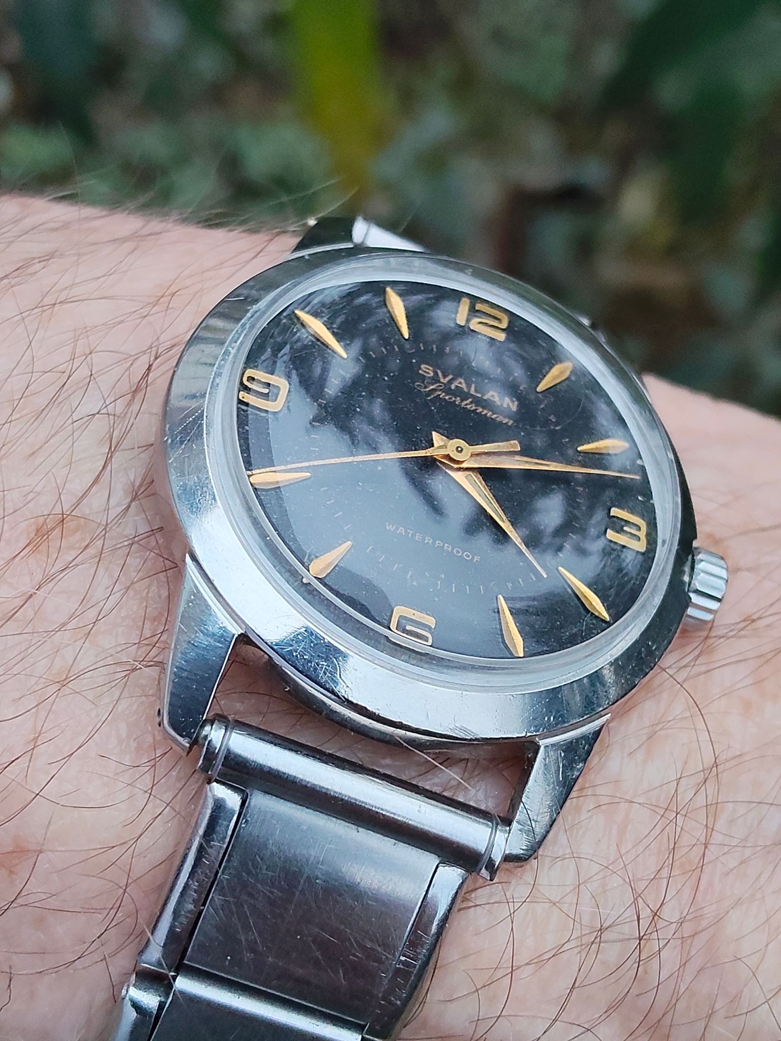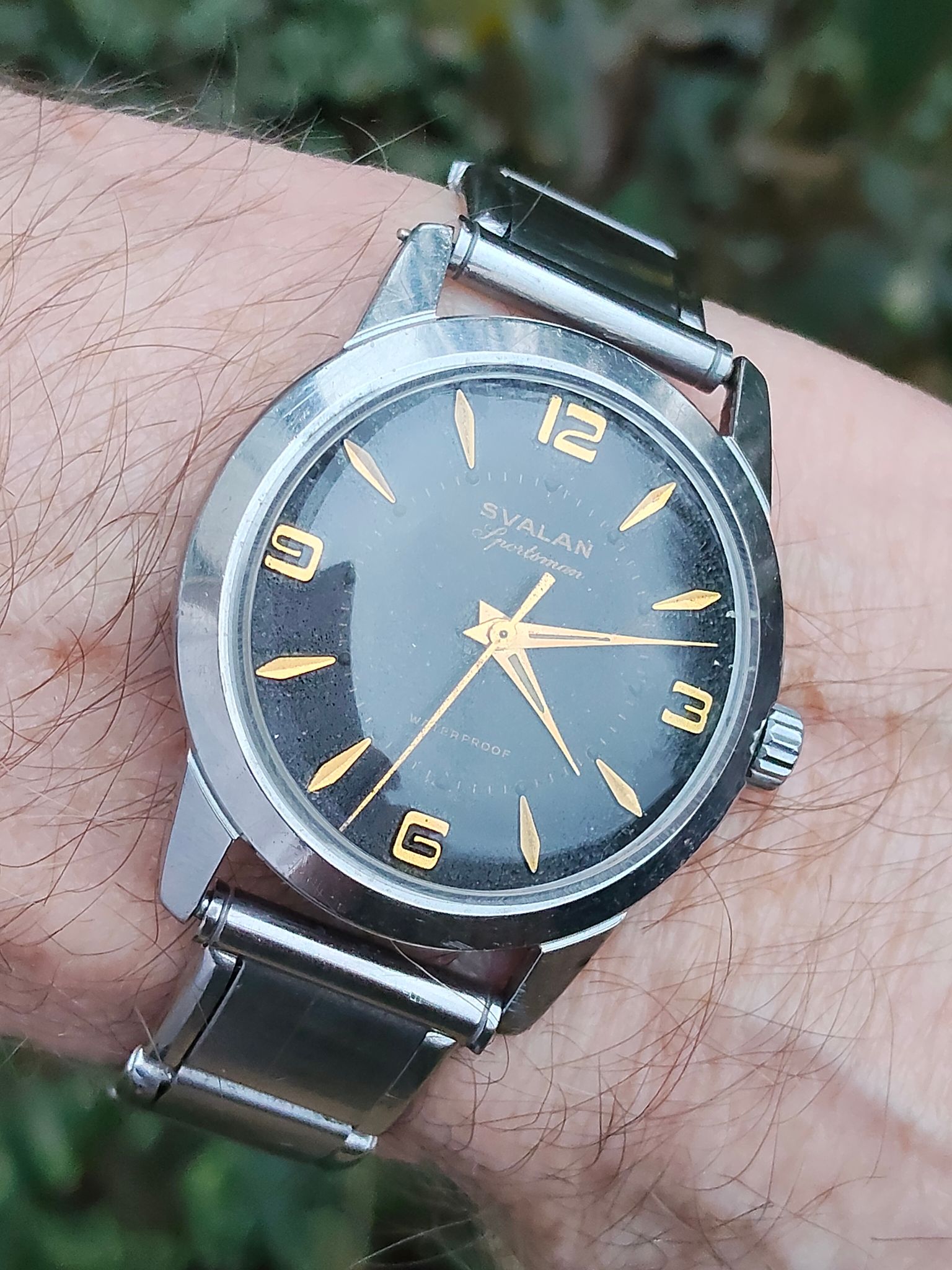 Vandaag draag ik een Svalan Sportsman. Deze heeft een mooie zwarte wijzerplaat met goudkleurige indexen en cijfers, die samen toch wel een klassieke uitstraling geven.
