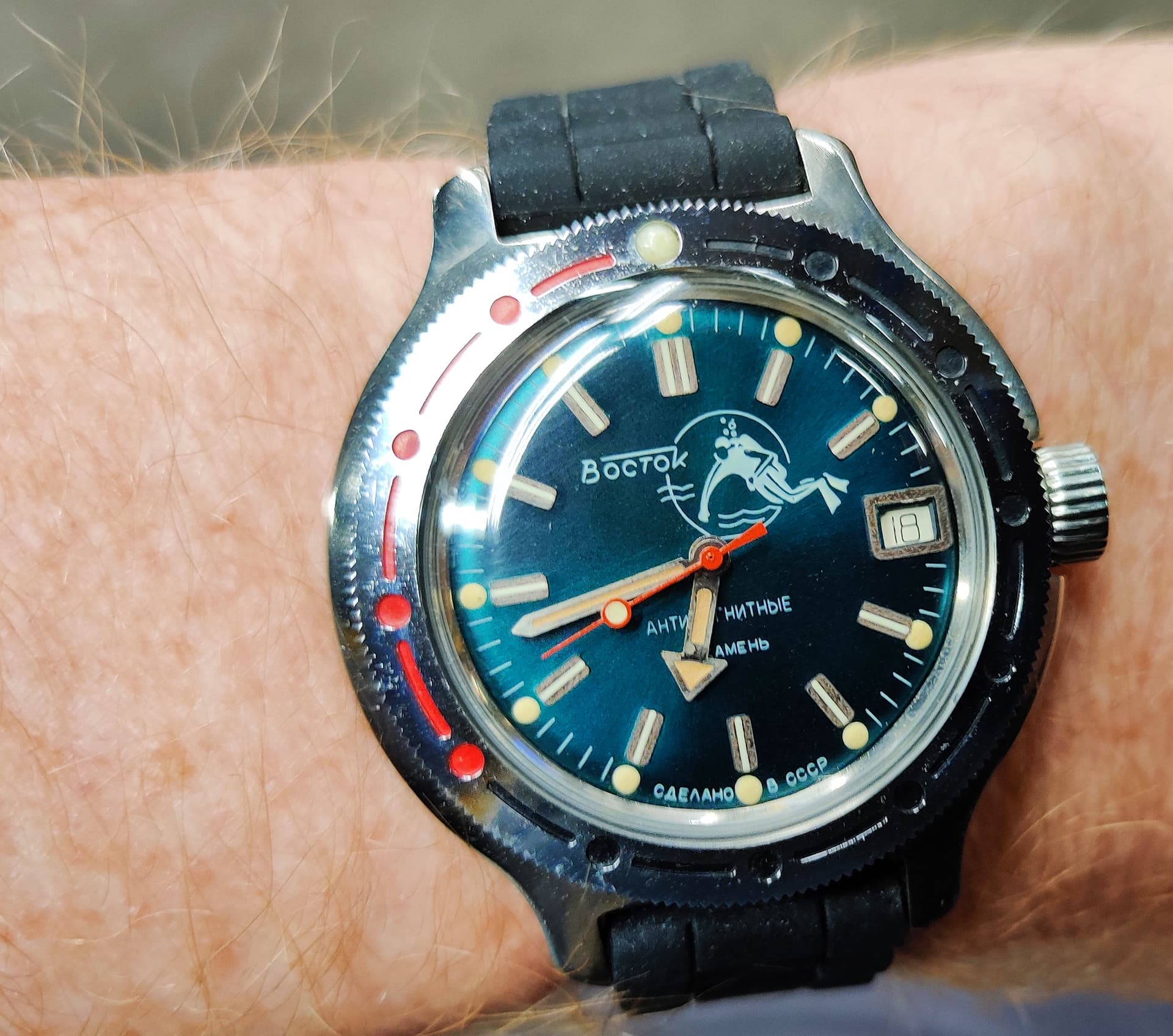 Vostok Amphibia die niet liep omdat het schroefje van de veerton op de balans lag. Deze is een new old stock. Gekocht van een Duitse standhouder die, omdat het horloge niet liep, flink wat van de prijs af deed. Soms zit het mee…