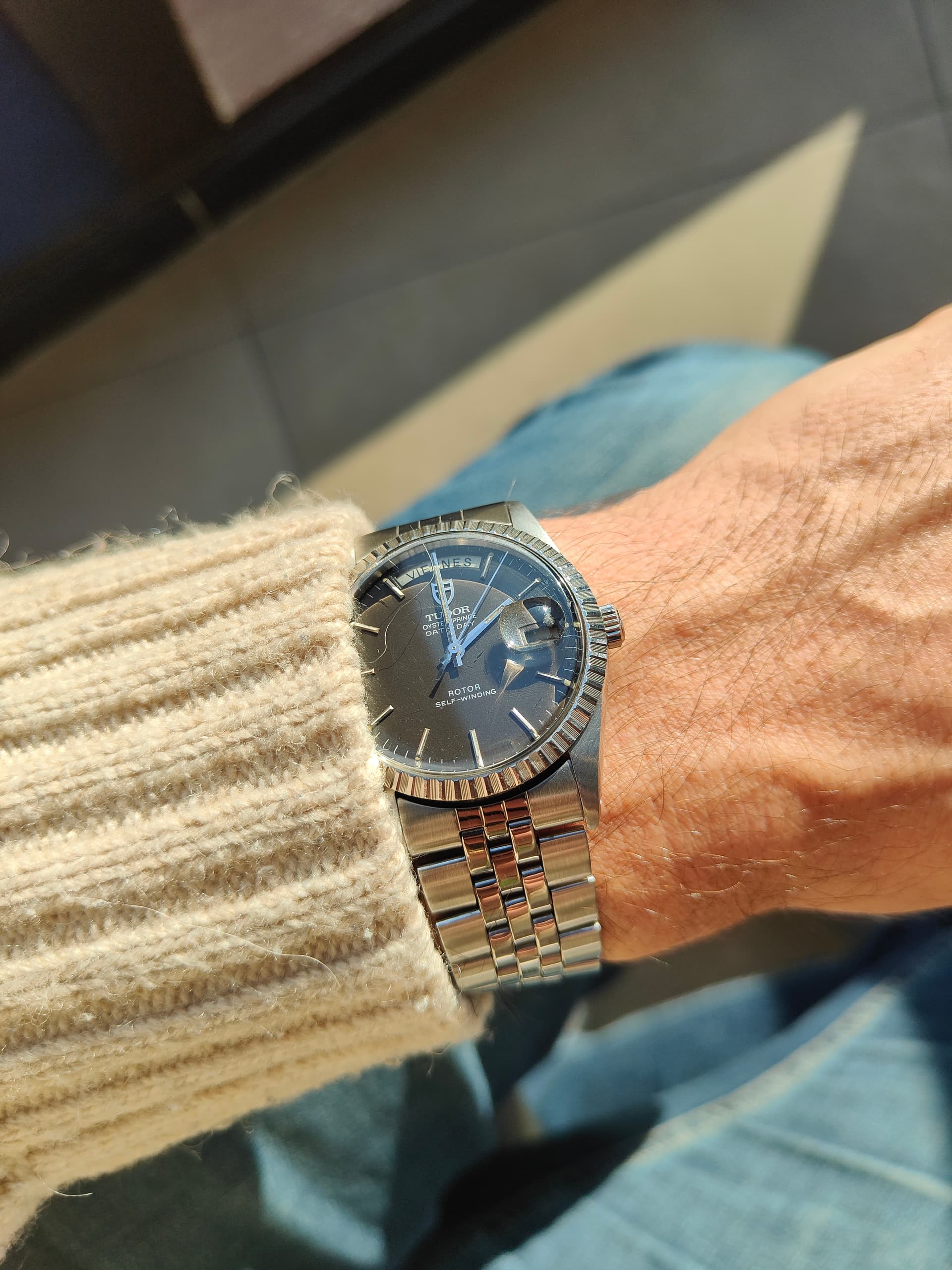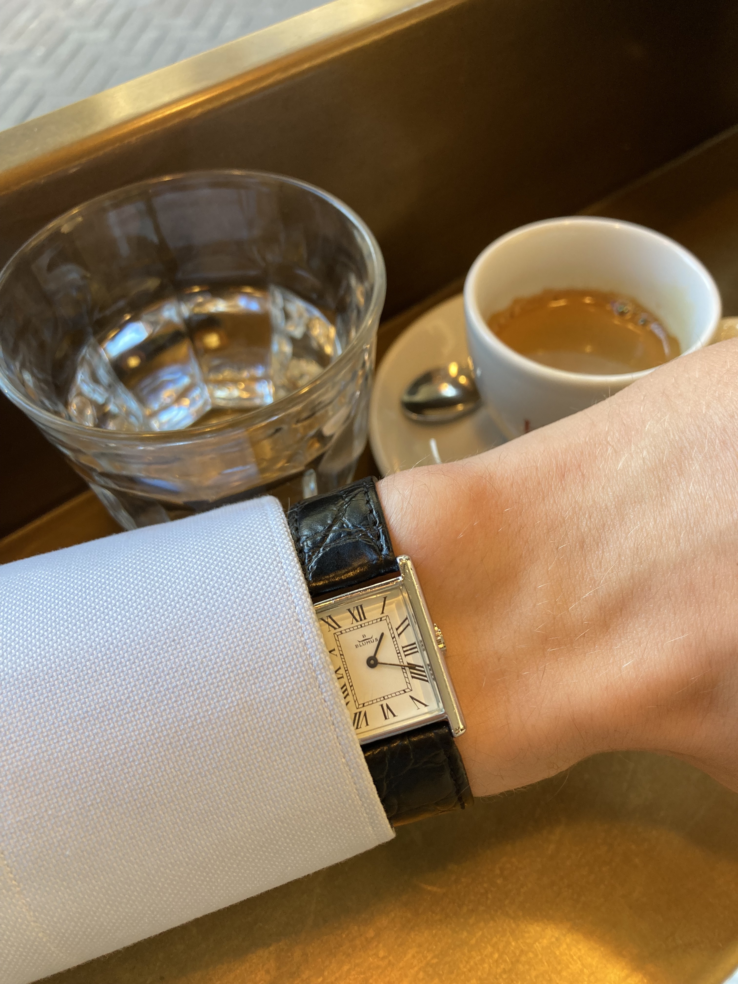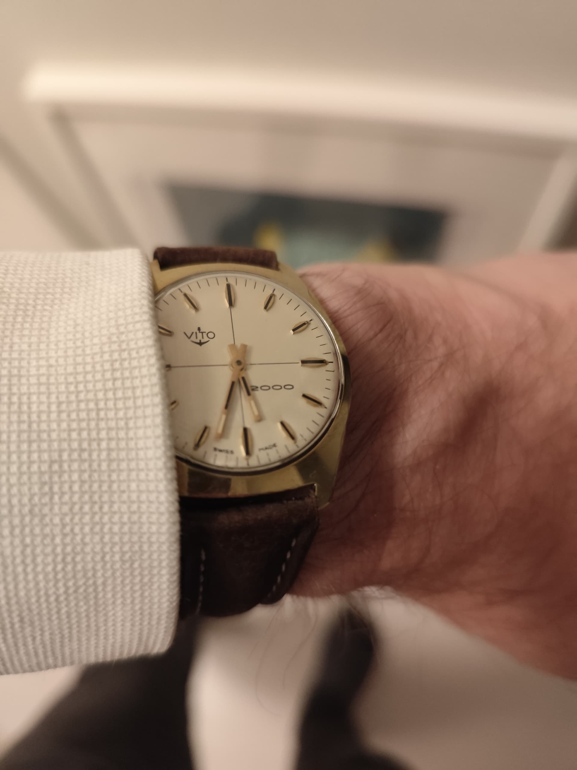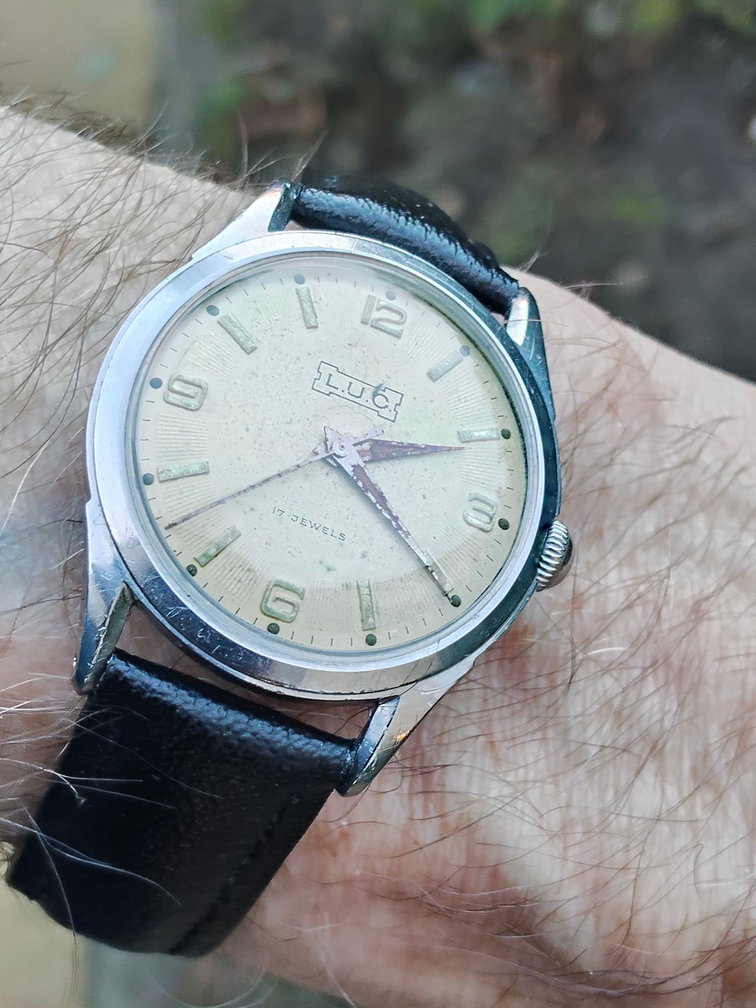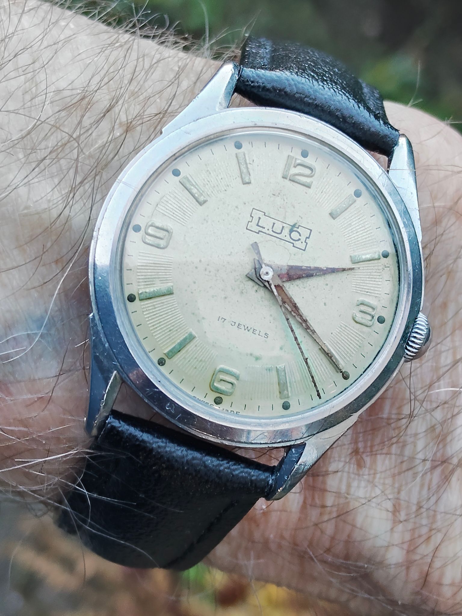 Vandaag draag ik een mooie L.U.C. uit de jaren ’50. In de kast tikt het FHF 74-kaliber. De wijzers kunnen nog wat aandacht gebruiken, maar verder loopt het horloge prima en heeft het die typische charme van de jaren vijftig.