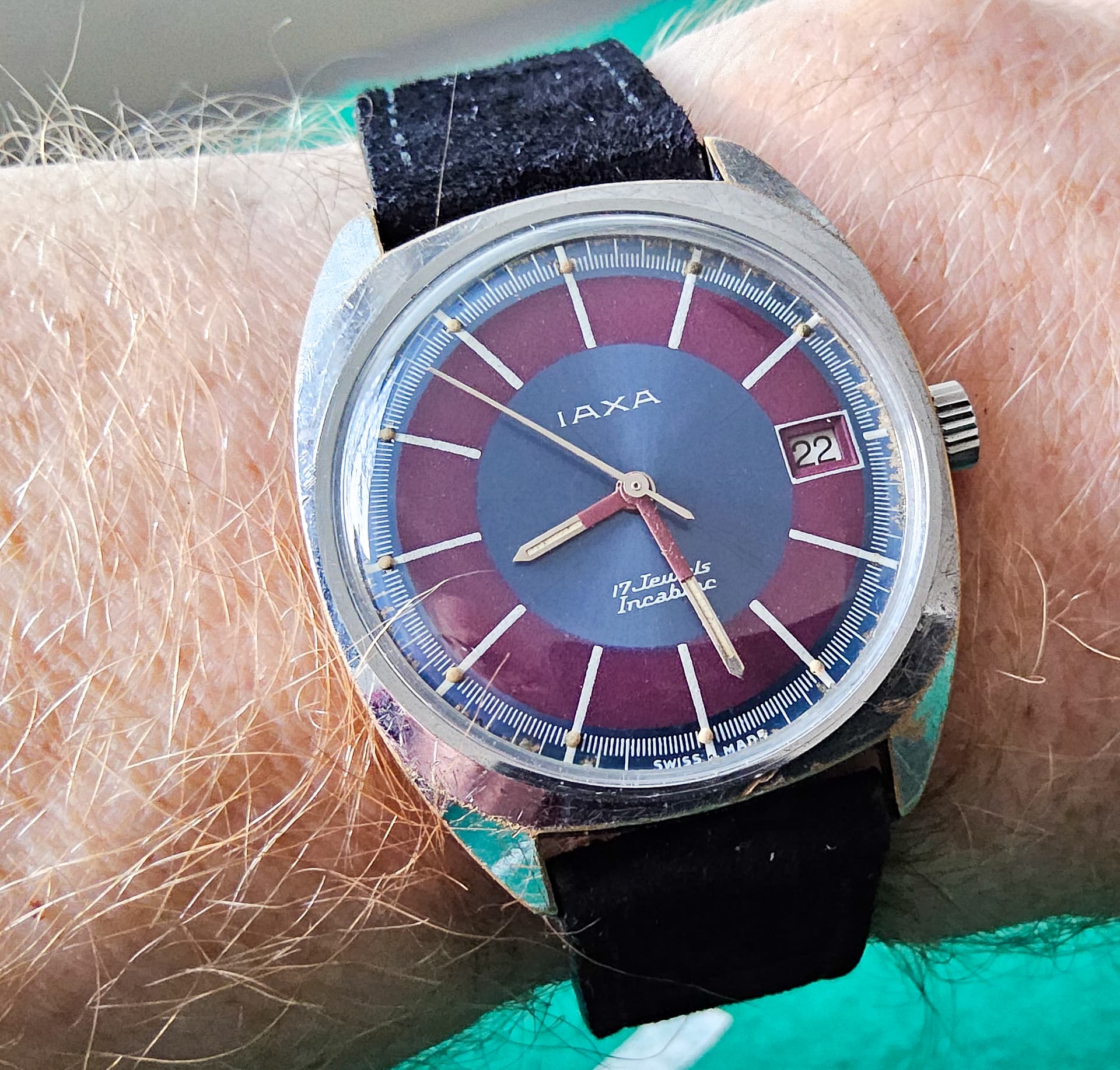 Vandaag een Iaxa die ik op de rikketik heb gevonden uit een grabbelbak. Het mooie AS uurwerk heb ik gisteren geserviced en loopt goed. Wel een tijdje zitten klooien voordat ik de datumverstelling goed voor elkaar had.