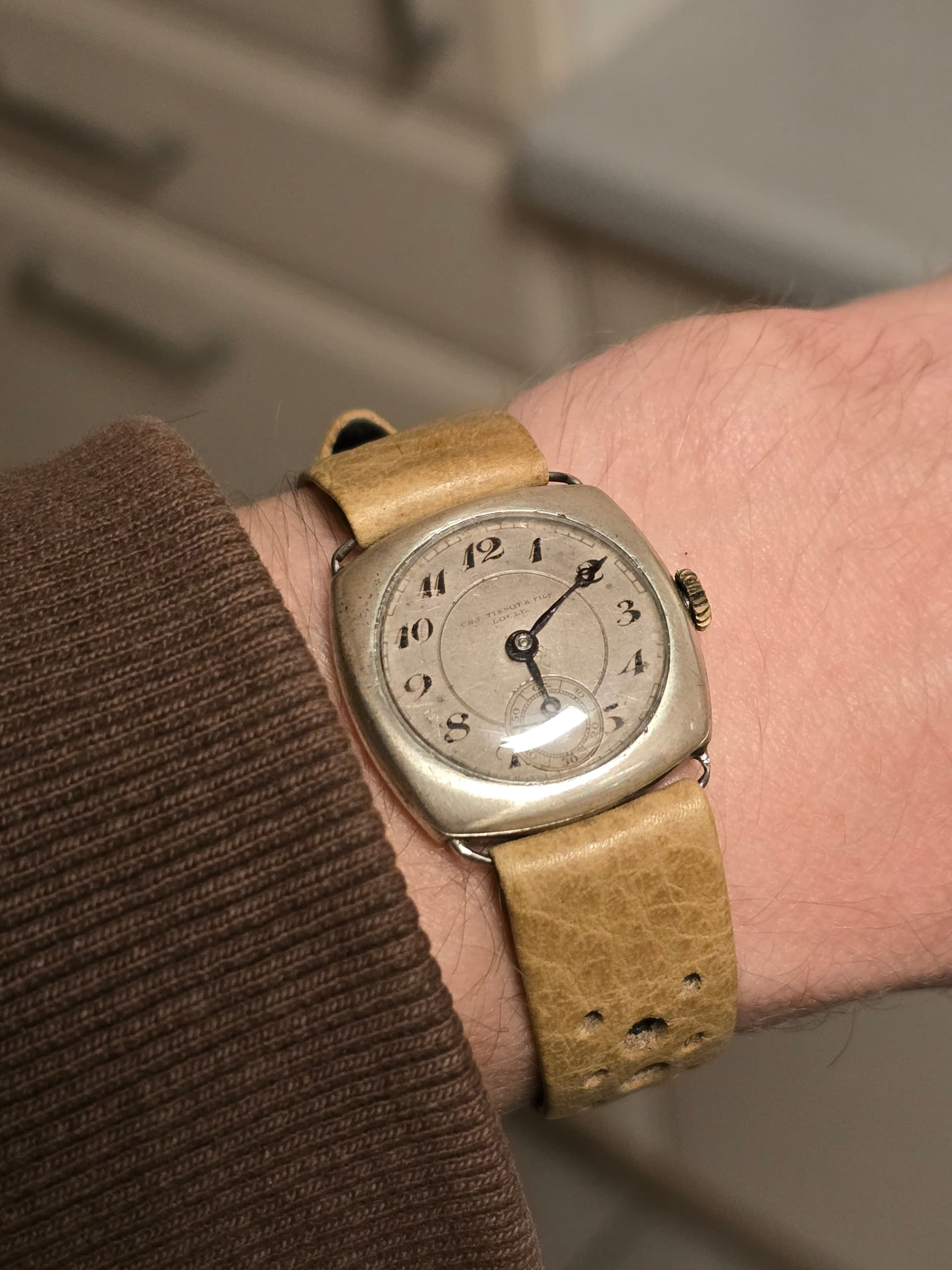 Volgende in het 1920’s zilver thema, 10.5 ligne kussenkast. Vermoedelijk iets ouder dan de andere twee, want draagt nog het oude “Ch Tissot & Fils” logo.