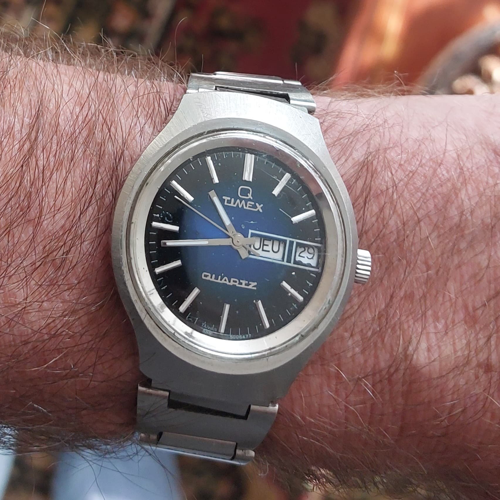 Nog steeds deze om de pols. Minutenpijpje “reparatie” van gisteren heeft geholpen. Loopt strak op tijdje. Blij mee ![]()