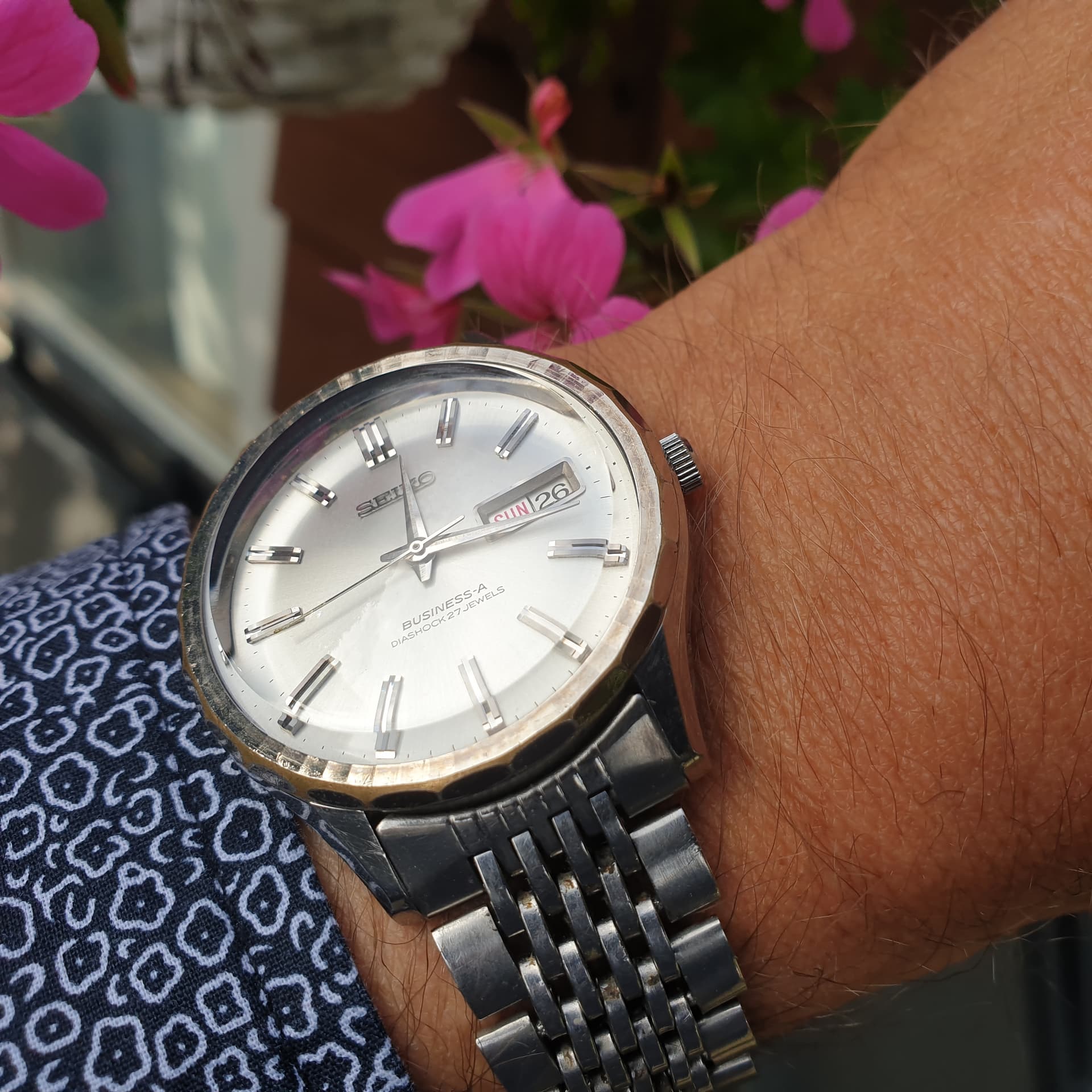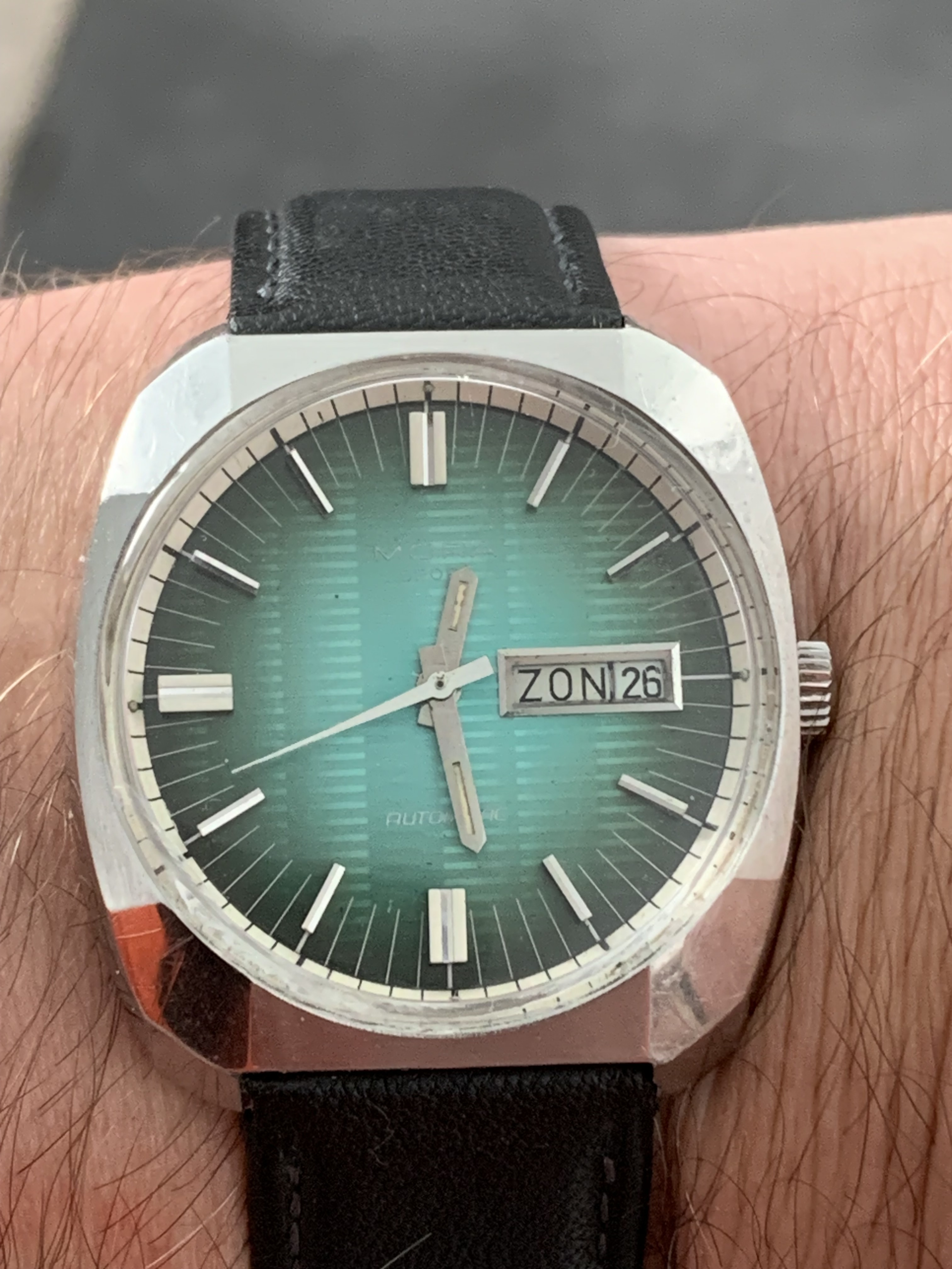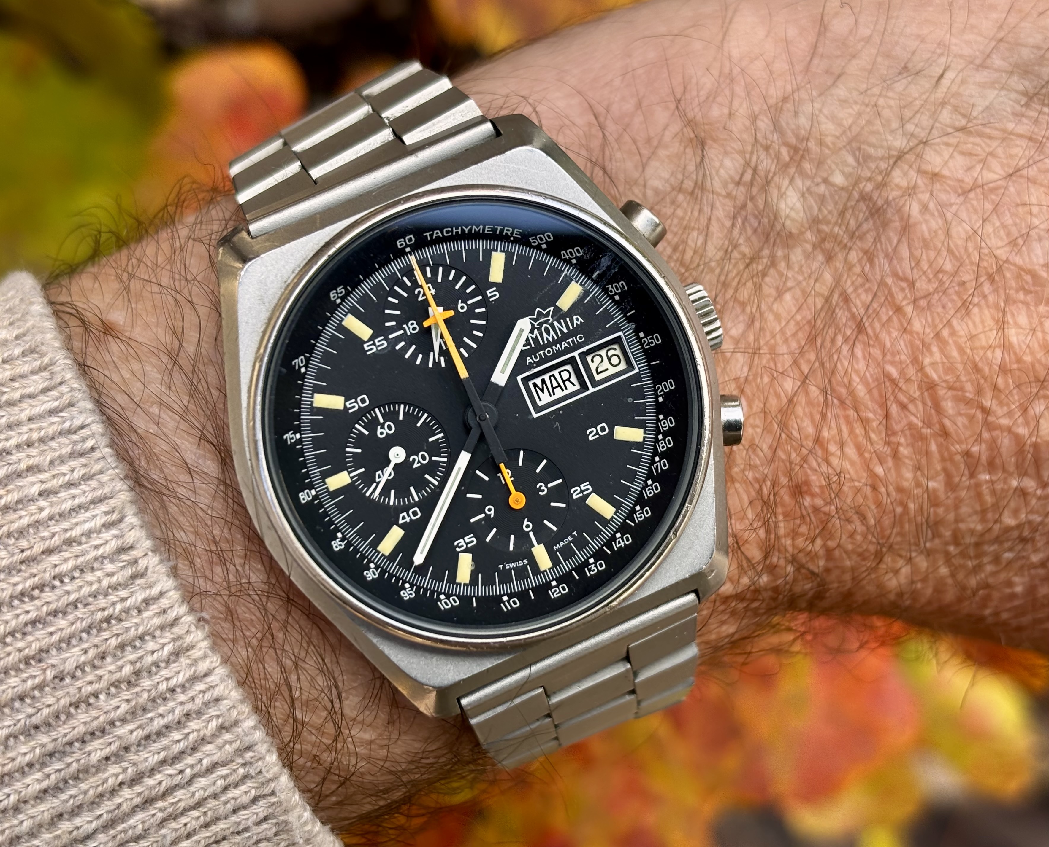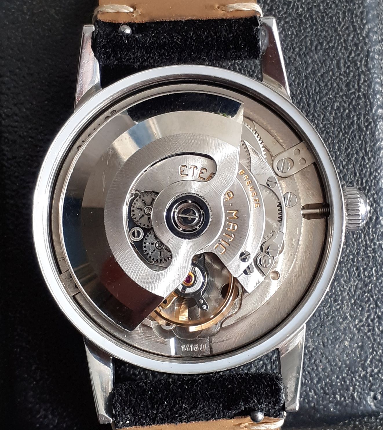 Vandaag draag ik deze mooie Eterna-Matic met het caliber 1416 U, uit de vroege jaren ’60. Het horloge komt uit een lot van zes stuks; ik heb de kast gereinigd en verder zo gelaten, want het uurwerk liep al keurig.