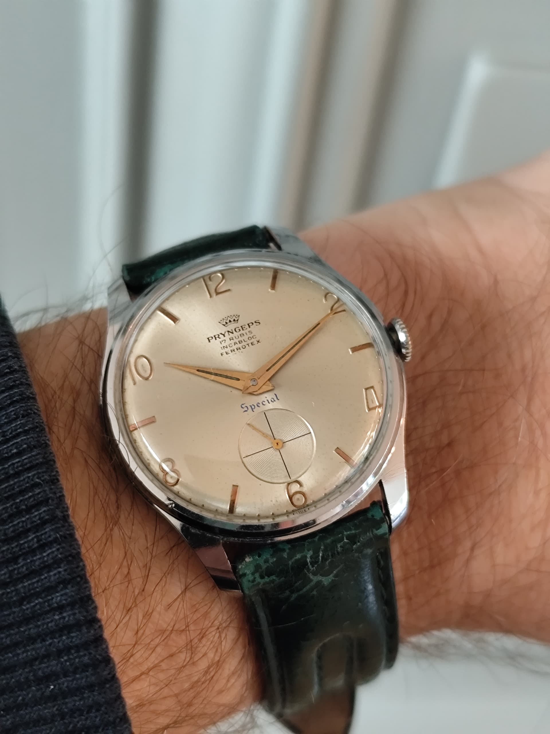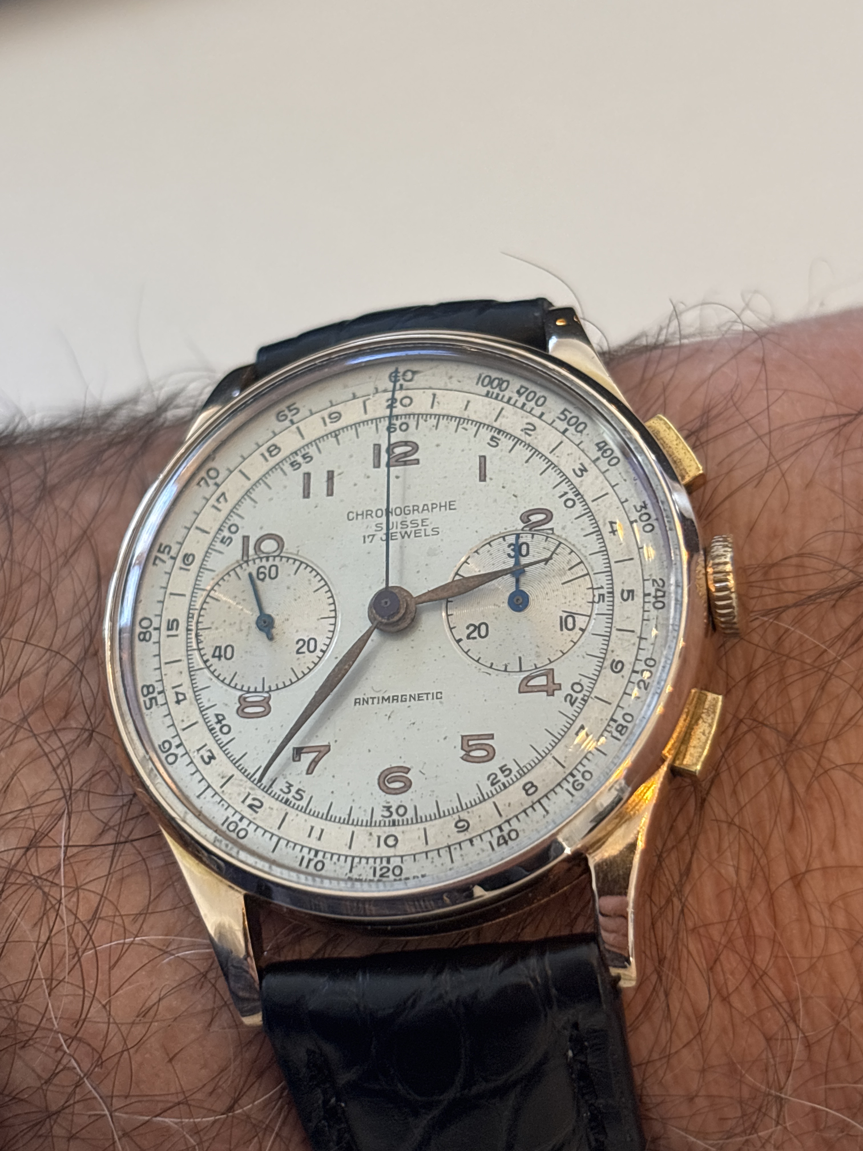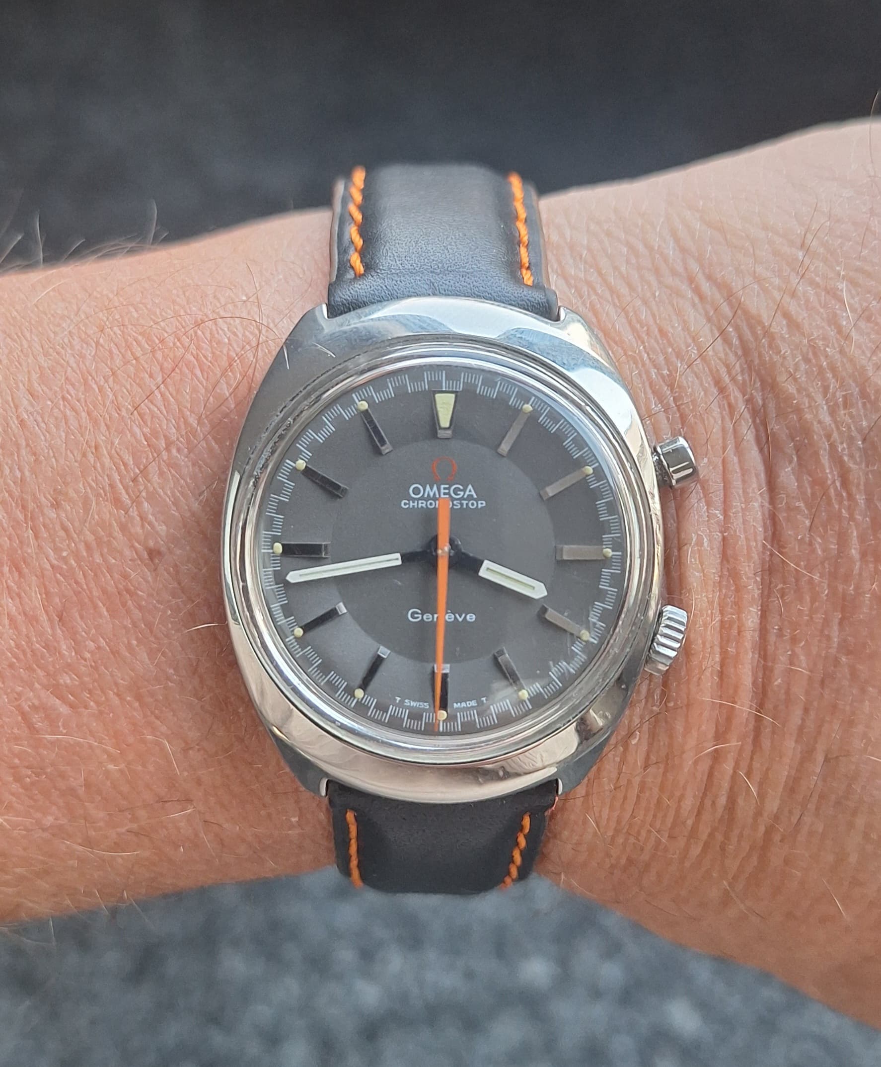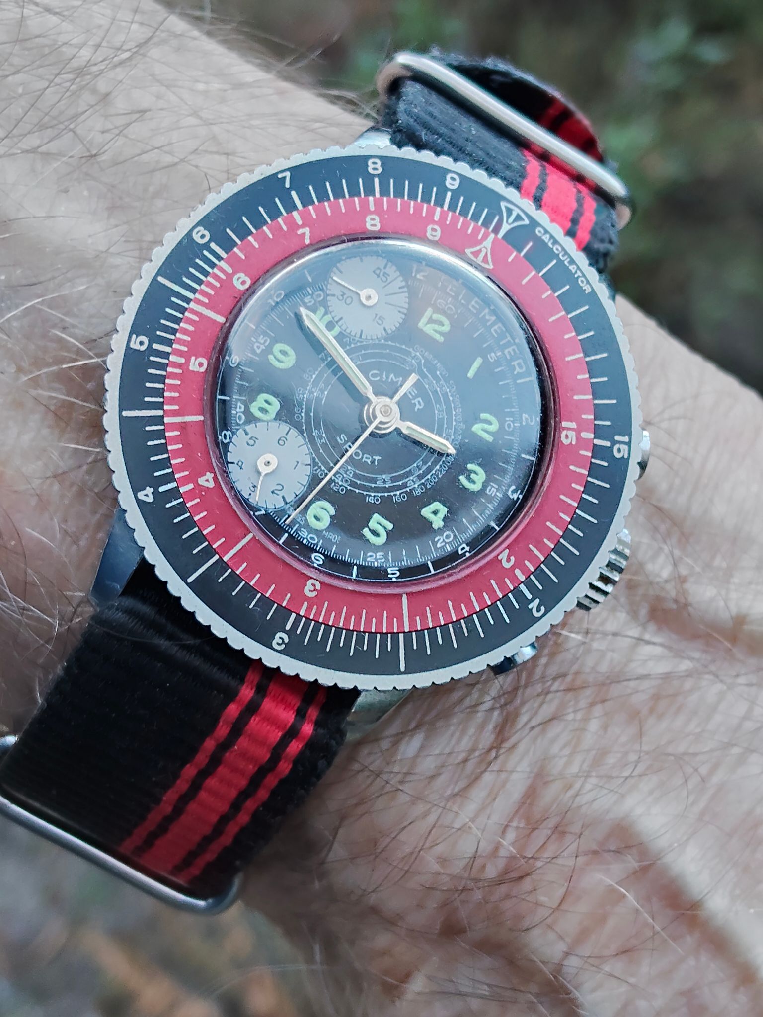 Vandaag draag ik deze opvallende Cimer-chronograaf. Het is een model dat je niet vaak tegenkomt, zeker niet met zo’n grote, felrode rekenring rond de kast. Binnenin zit een eenvoudig penanker-uurwerk.