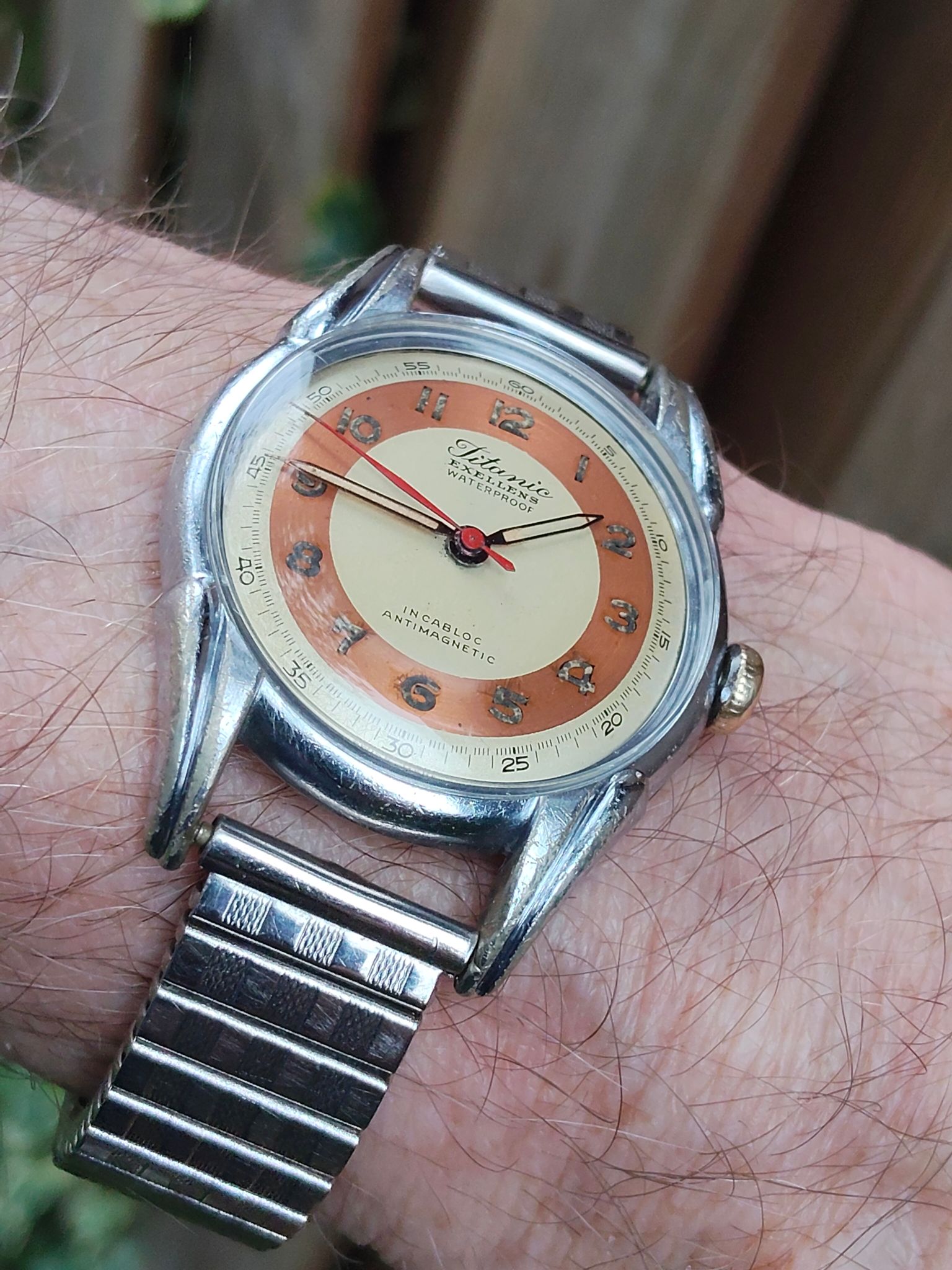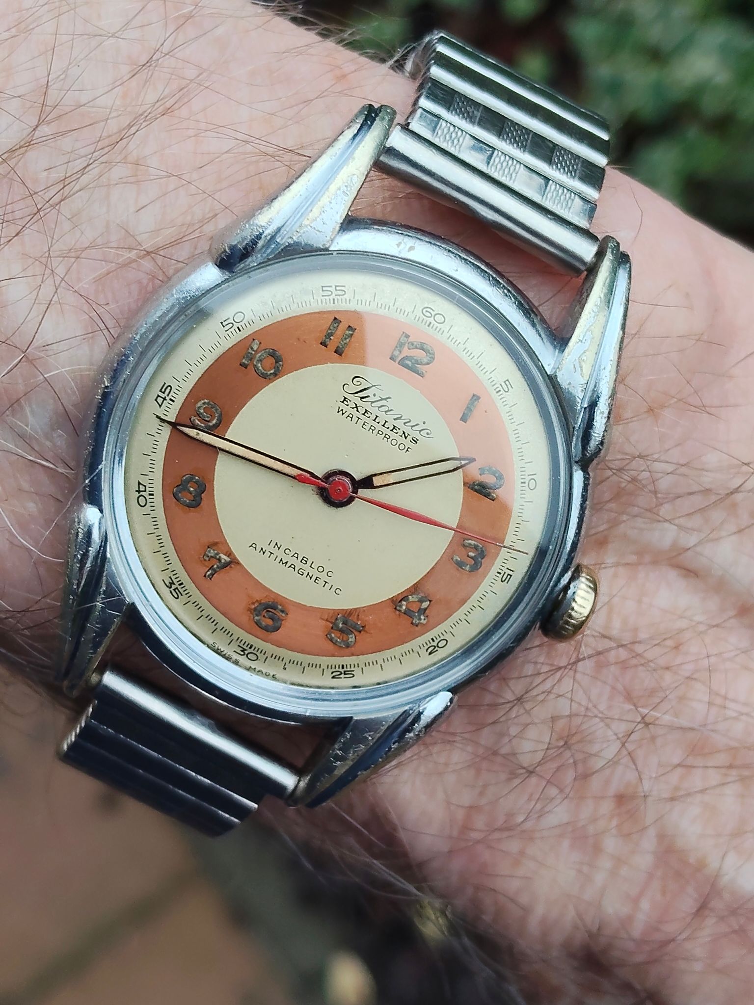 Vandaag draag ik een Titanic Exellens uit de jaren vijftig. Een vrolijk en typisch jaren ’50-design met een tweekleurige wijzerplaat en mooie gevormde lugs die het horloge echt karakter geven.