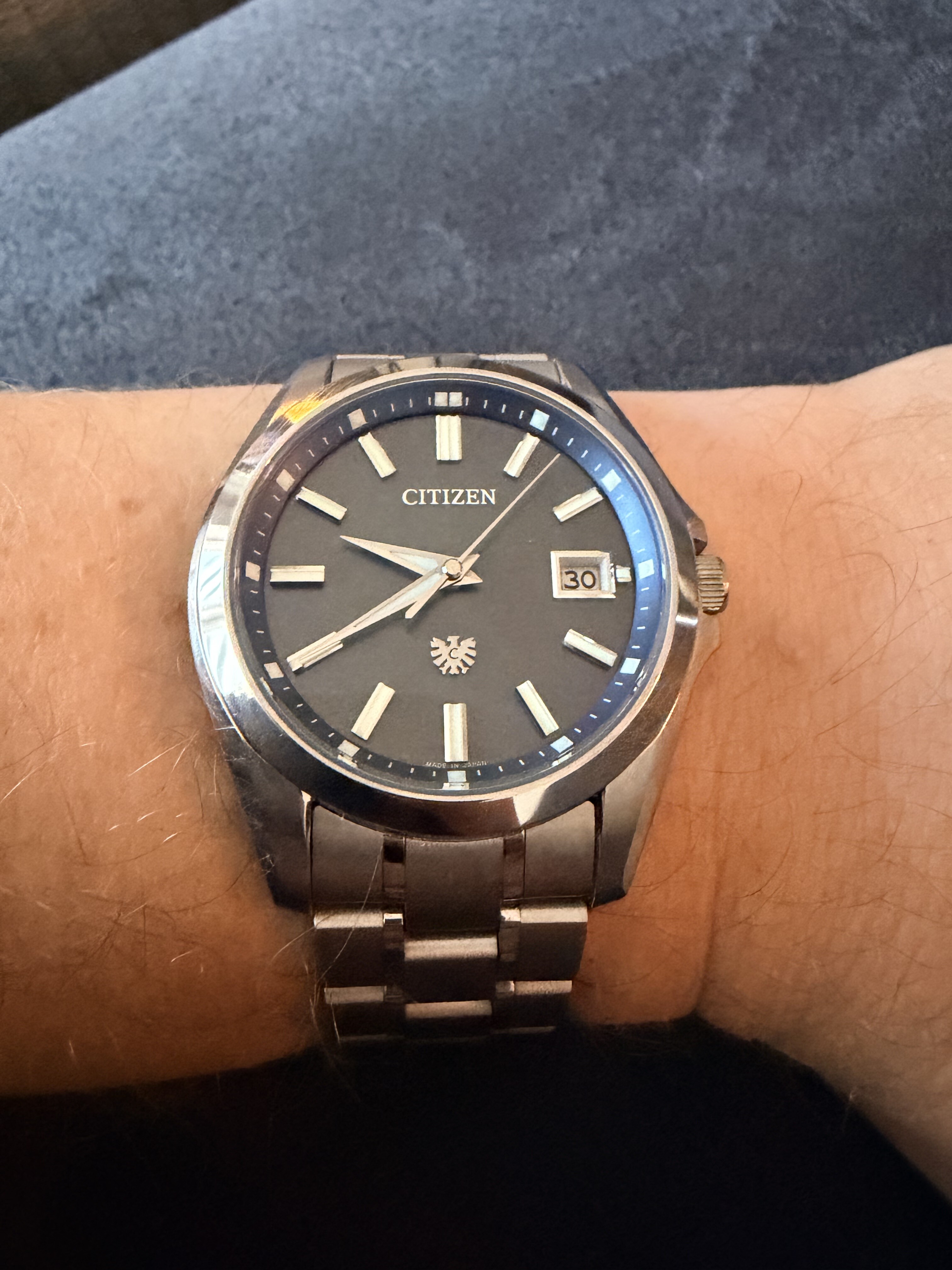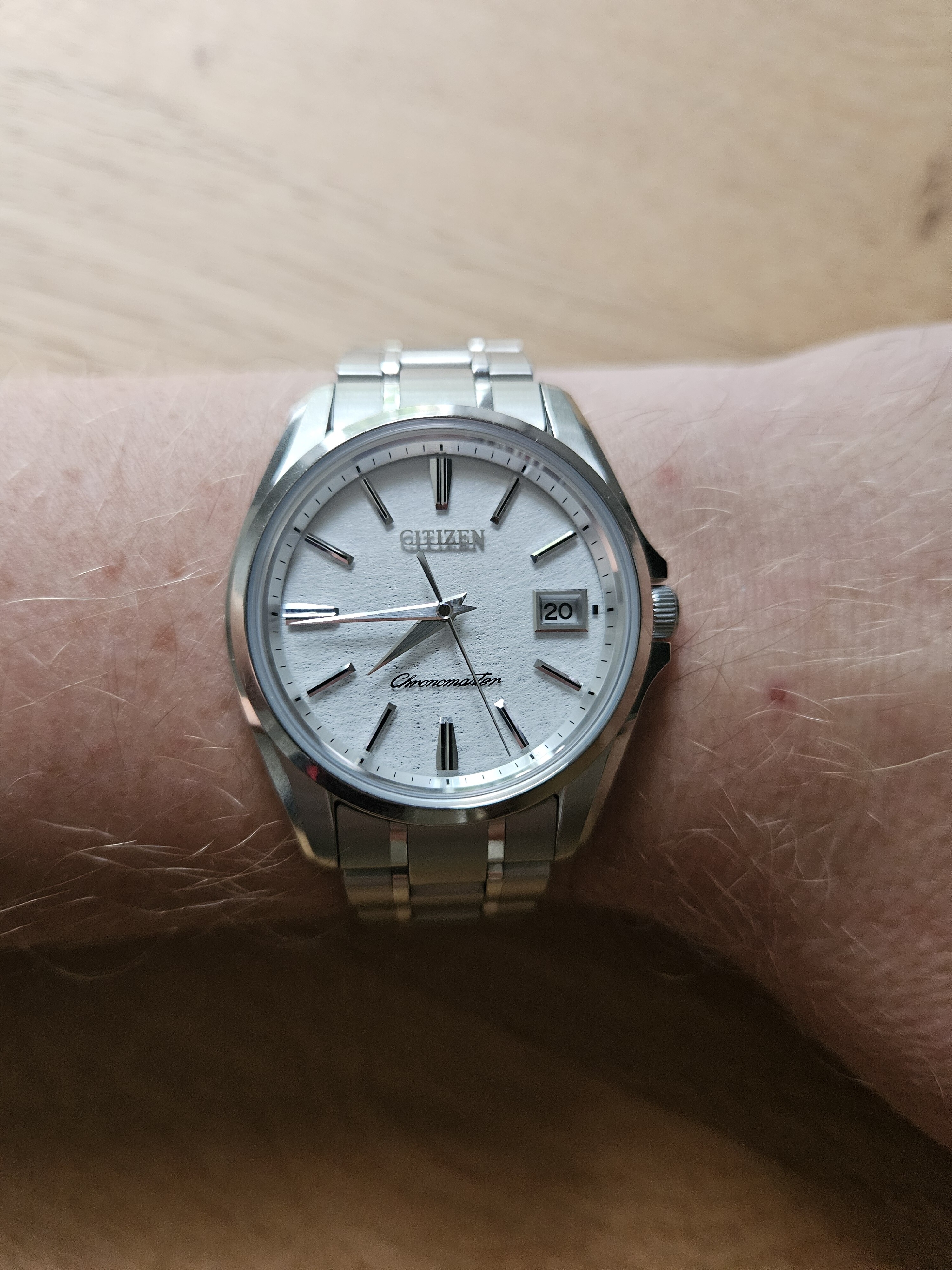 Allebei toppers - heel mooie en goed afleesbare horloges. De 44GS kast in 40 mm is wat hoog voor mijn (stokbroodvormig,16,75 a 17 cm) pols door de lange lugs en male endlinks. Dat is beter bij deze The Citizen. Plaatje: