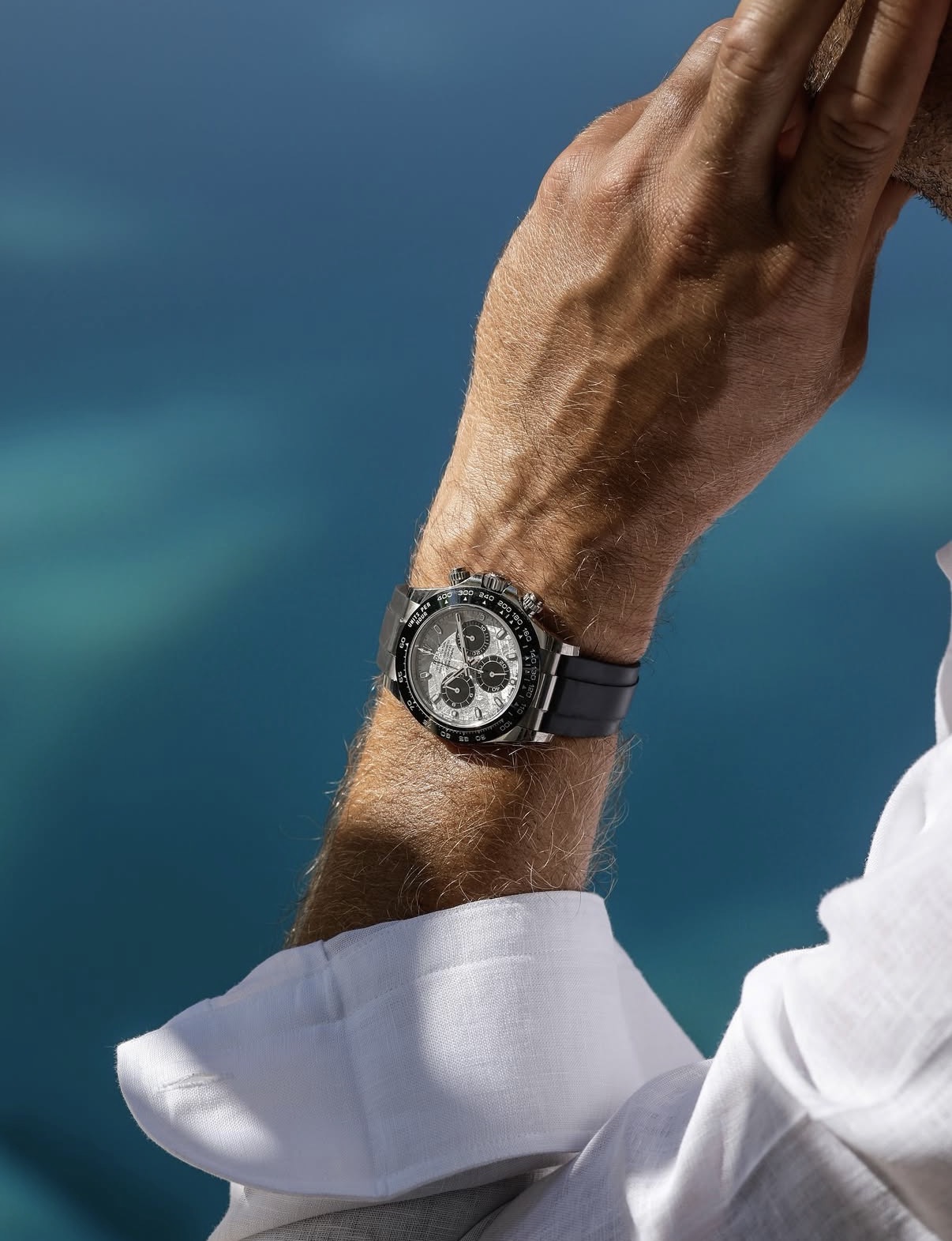 Dat zou een witgouden Daytona Oysterflex zijn met een meteorietplaat, wat een geweldig ding is dat zeg.