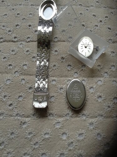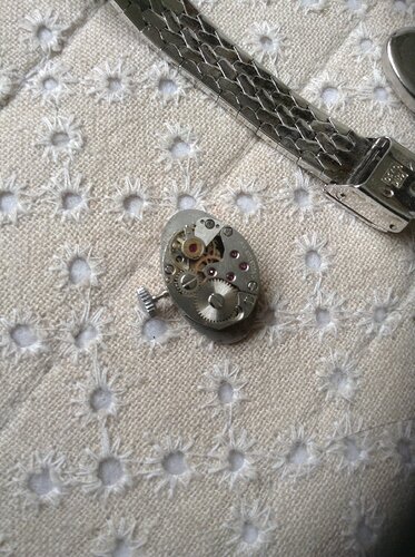 Lijkt me op het oog een FEF - uurwerkje. Zat vrijwel overal in destijds (wat betreft ovalen dameshorloges). In elk geval is 't geen Omega, veel te basic afgewerkt. Kan net niet goed het symbool onder de balans zien, heb een lijst waarin ik dit op kan zoeken - maar dan moet ik 'm wel goed kunnen zien. Werkje is wel behoorlijk oud, nog geen Incabloc.
