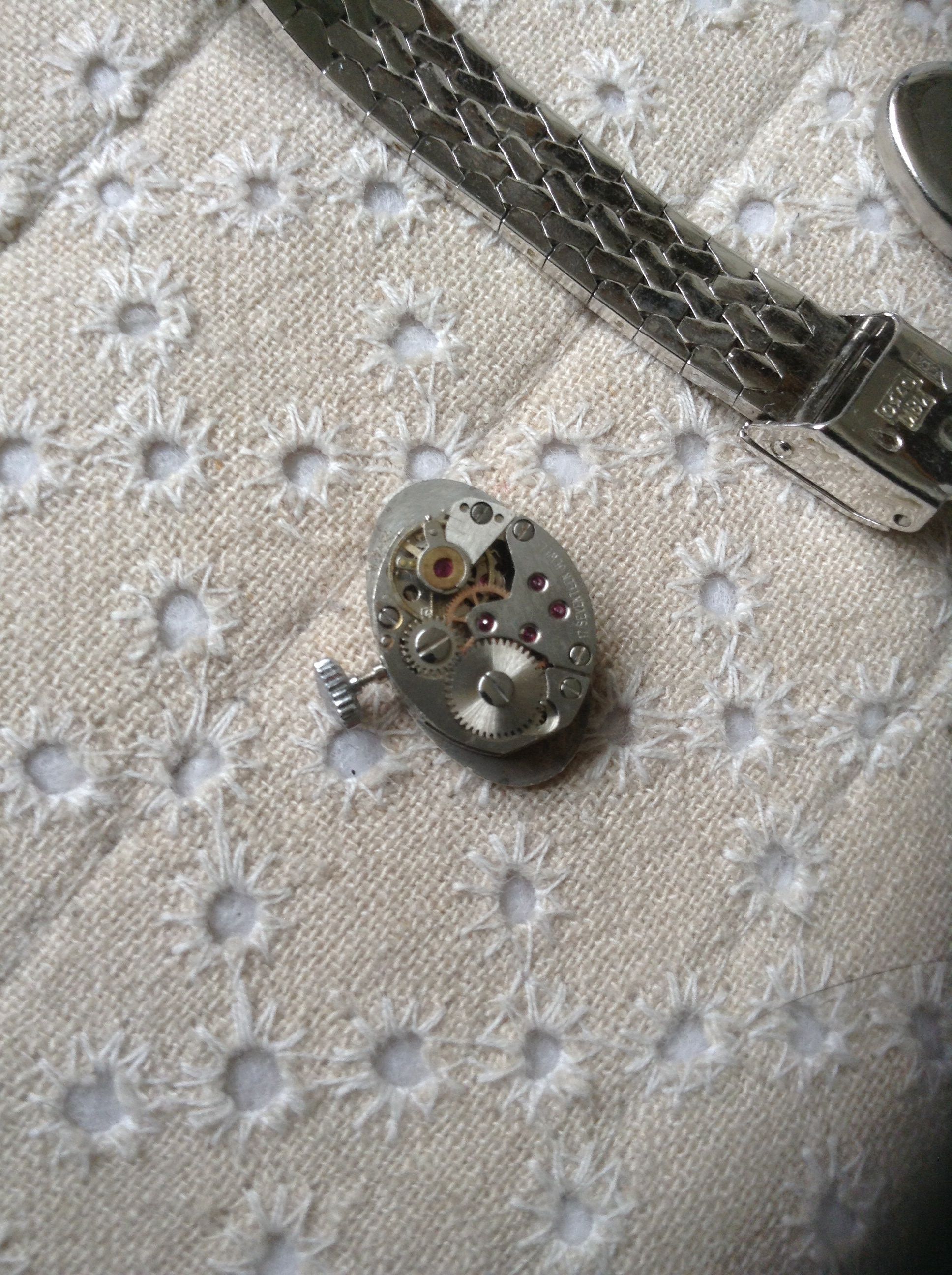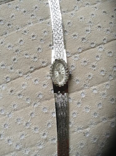 Allereerst is het mechanisch uurwerkje niet gesigneerd, de kroon heeft geen Omega logo, de nog overgebleven diamantjes zijn geen echte diamanten, maar de band en de kast zijn volgens een testje door sieraden atelier wel met wit goud bekleedt.