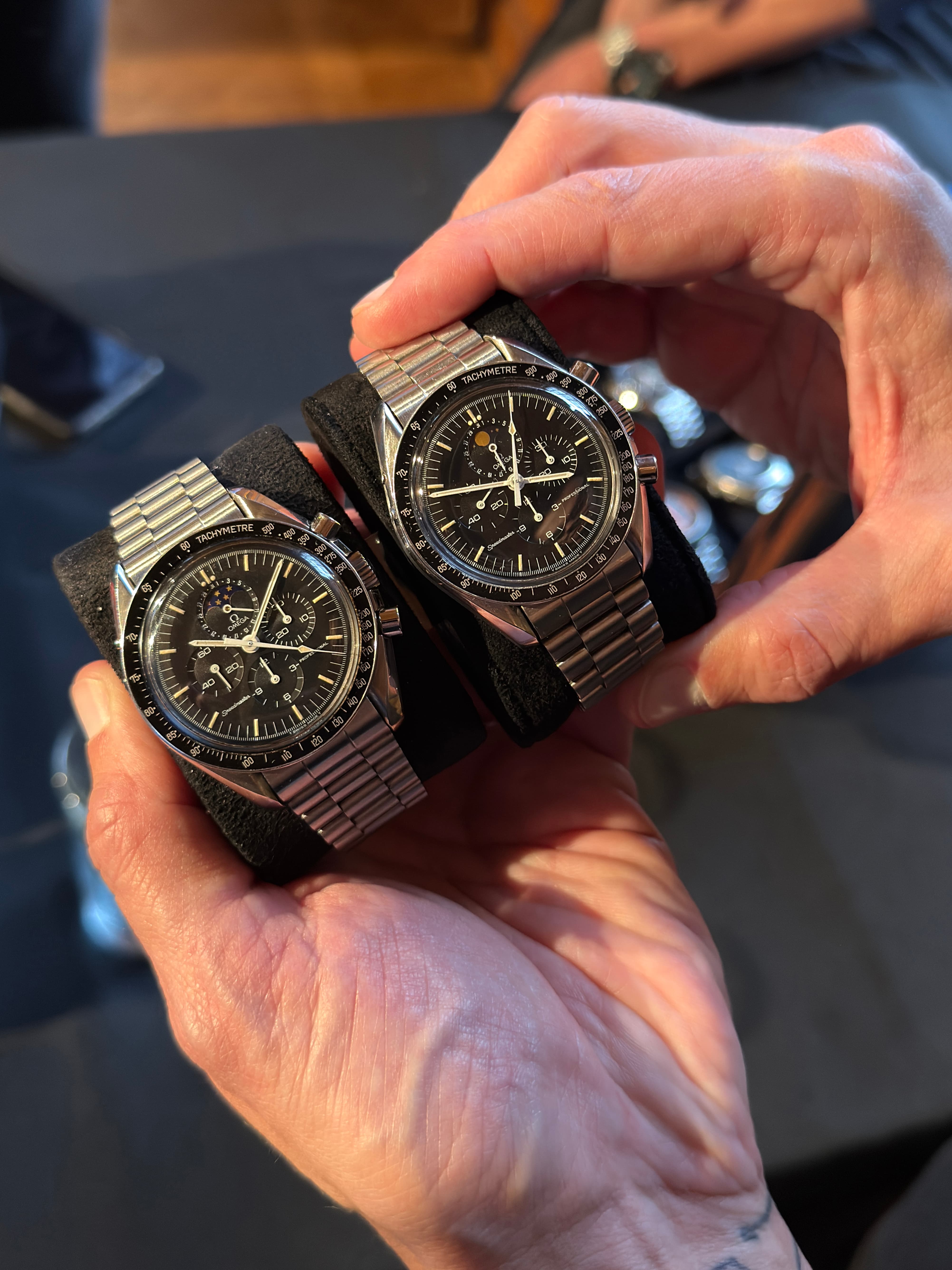 Twee Alaska 3’s! Deze wijzerplaat was voor de space shuttle missie gemaakt en later zijn de overgebleven wijzerplaten in reguliere Speedmasters gezet. Een heel kostbare mod, die door Omega in de archieven zijn geregistreerd en dus legitiem!