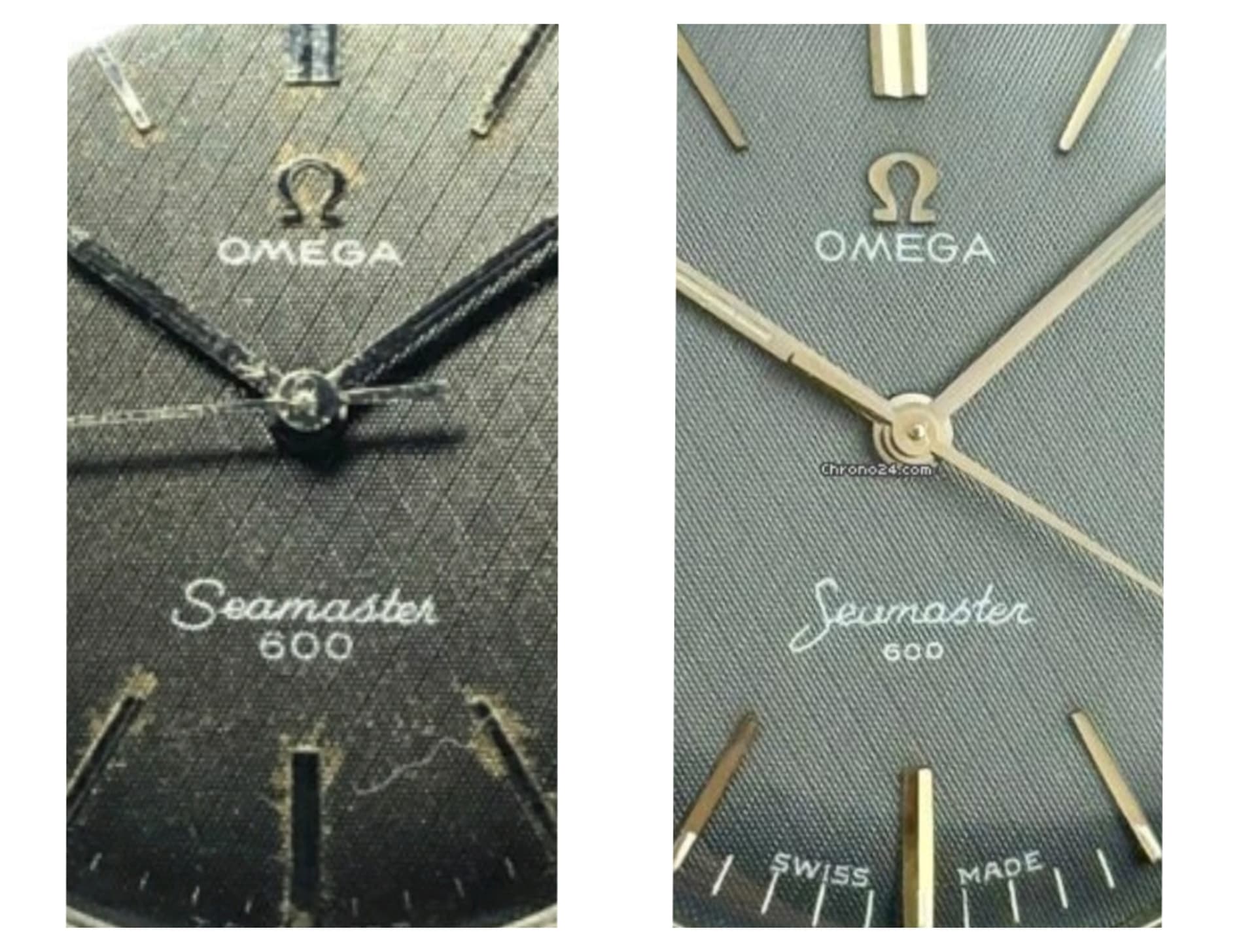 Er zijn mensen die gruwelen van een opnieuw opgemaakte plaat, anderen moeten helemaal niets hebben van patina. Maar als een vintage horloge niet grotendeels in een donkere la heeft gelegen dan is het vaak één van deze twee opties. Of de hoofdprijs betalen voor de donkere la variant.