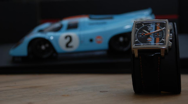 Hoewel het horloge in deze vorm niet voorkomt in een film, is het wel een ode aan een acteur die een soortgelijk horloge draagt in de film Le Mans. Het gaat natuurlijk om de Tag Heuer Monace, in de Steve McQueen-uitvoering. Op de achtergrond een model van de Porsche 917, de auto die naast McQueen de hoofdrol speelt in de film.