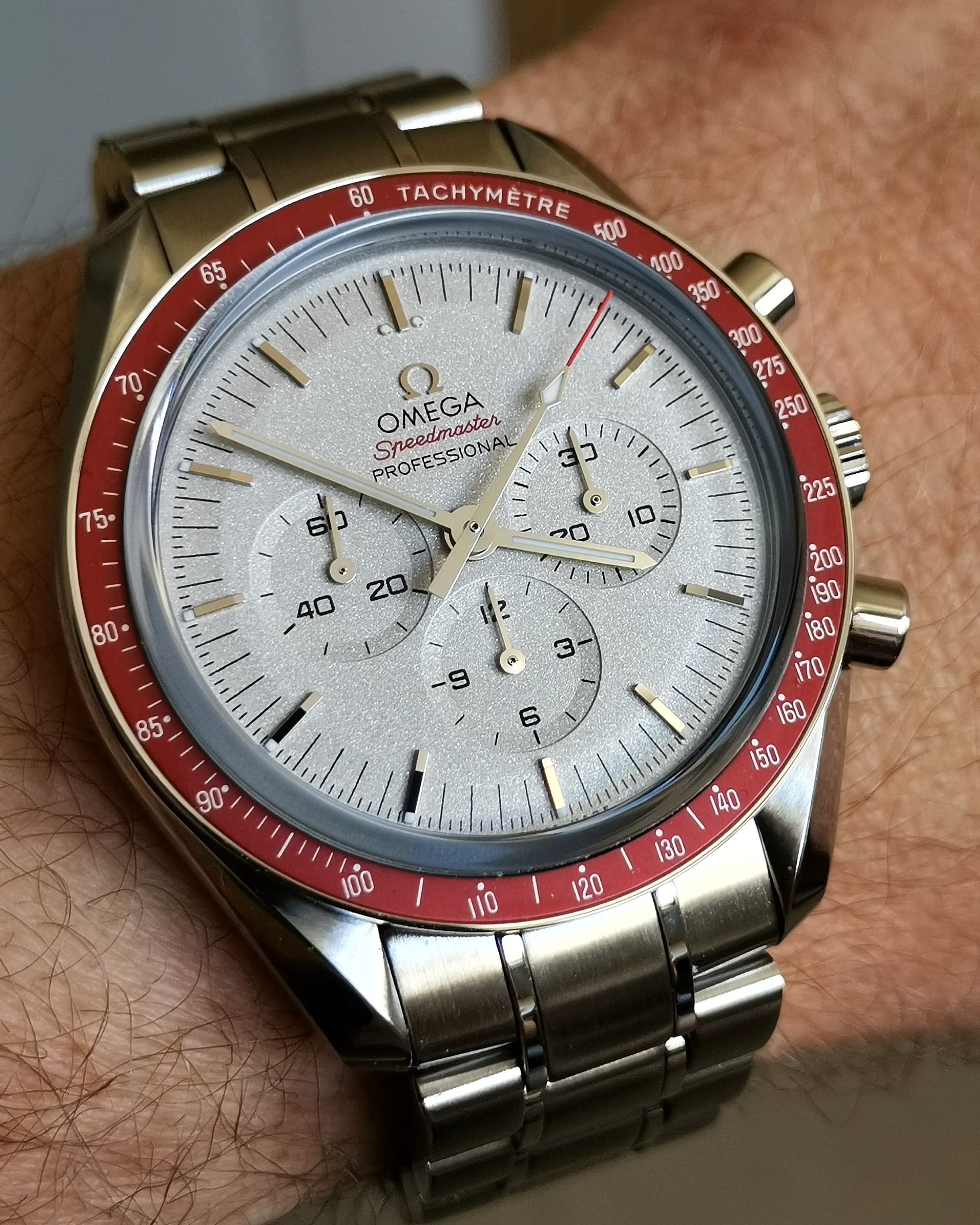 Die wijzerplaat vind ik dan weer wel premium vanwege kleur compositie door de rode tekst, de gepolijste uurmarkers en de “niet plastic” wijzers ivm de standaard moonwatch.