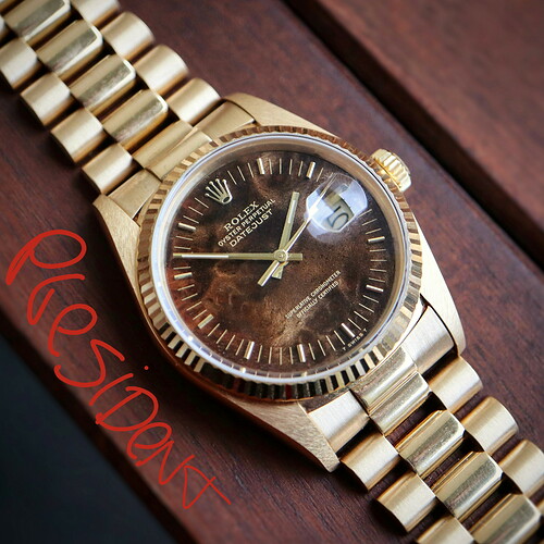 Ik wilde een donkerbruine croco of vintage band beginnen, maar jij komt aankakken met zo’n rare… eh, wacht… lumpy? President. Juist. Maar goed, ik mag dan ook graag doen alsof jouw DJ / DD een Cellini is.