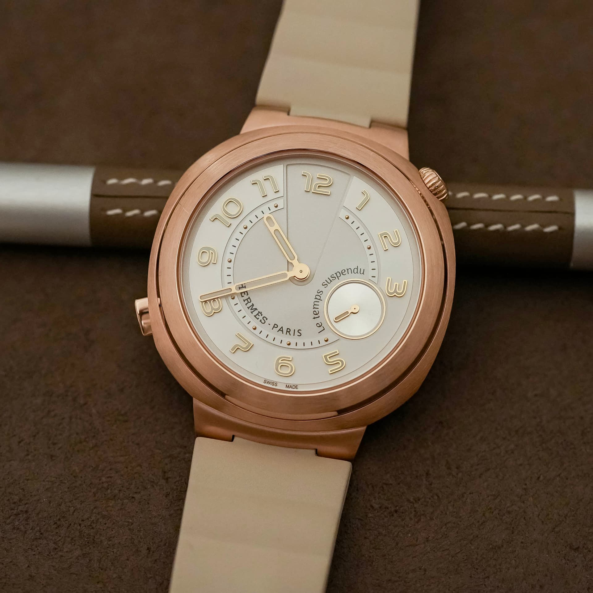 Misschien is een Hermes le temps suspendu iets voor je? Nog steeds rosegoud, maar wel wat sportiever. En een complicatie om de vingers bij af te likken.