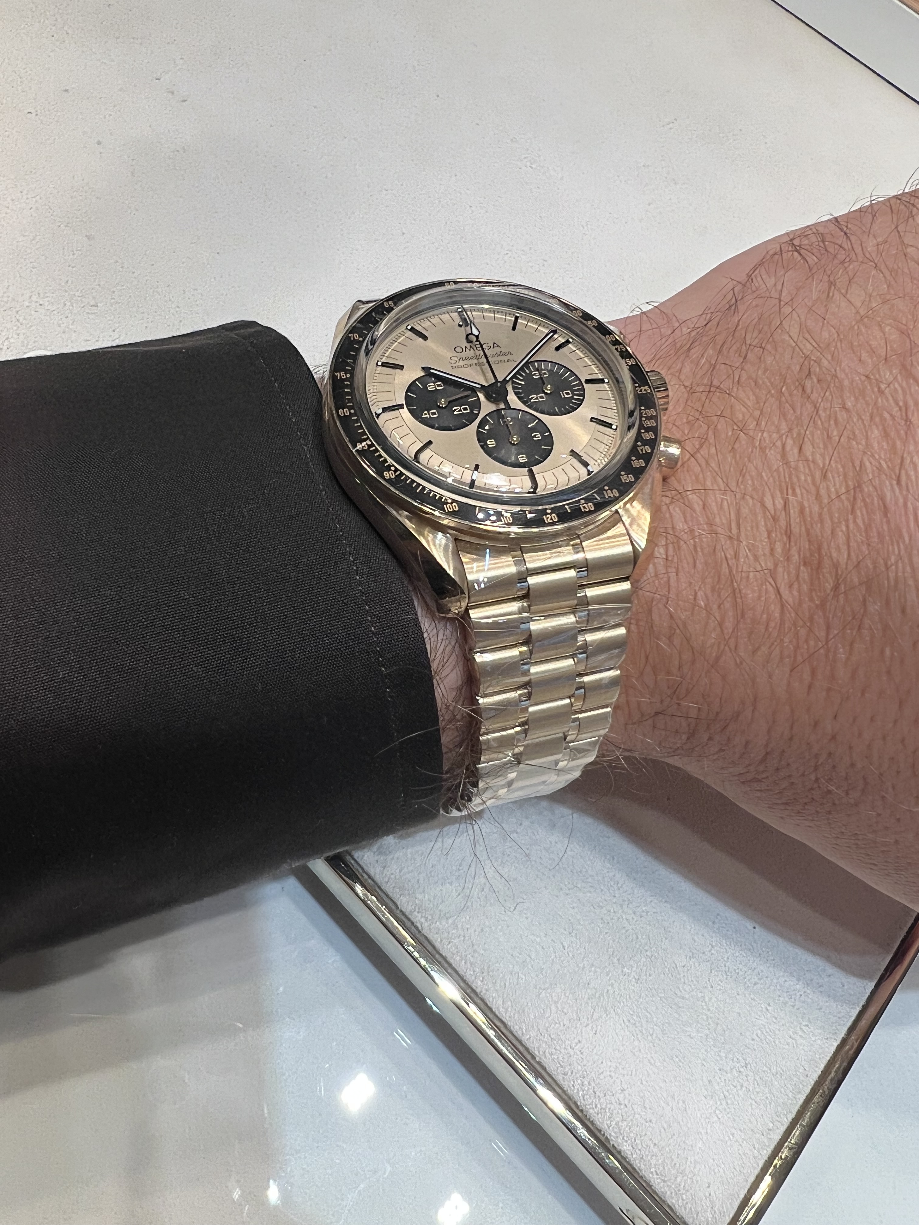 Je moet bij GS nadenken over welke de juiste voor jou is, dat is punt één. Ik heb gemerkt dat alles boven de 12,5mm moeilijk is. Als het dan groter dan 37-38mm is moet het voor mij quartz of titanium zijn, want dan is het nog een beetje plat of licht. “Gedrag op de pols” is zo anders van model tot model, da’s best intimiderend.