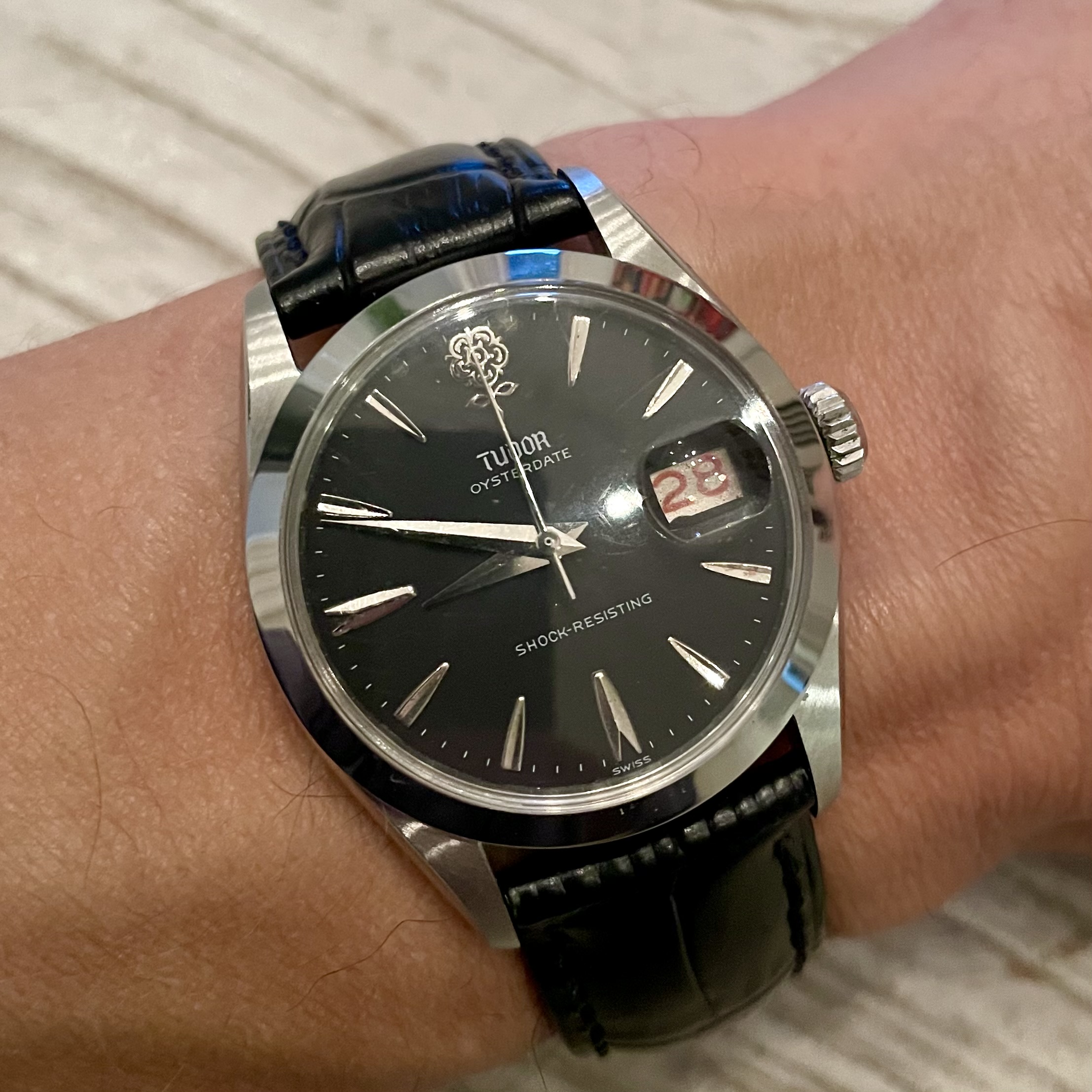 Normaliter heb ik ook niet zo veel met gevoerde zwart lederen (lak)bandjes, maar op de “sexy” oyster cussioncase met verhoogd plastic glaasje, vind ik het echt wel een plaatje.