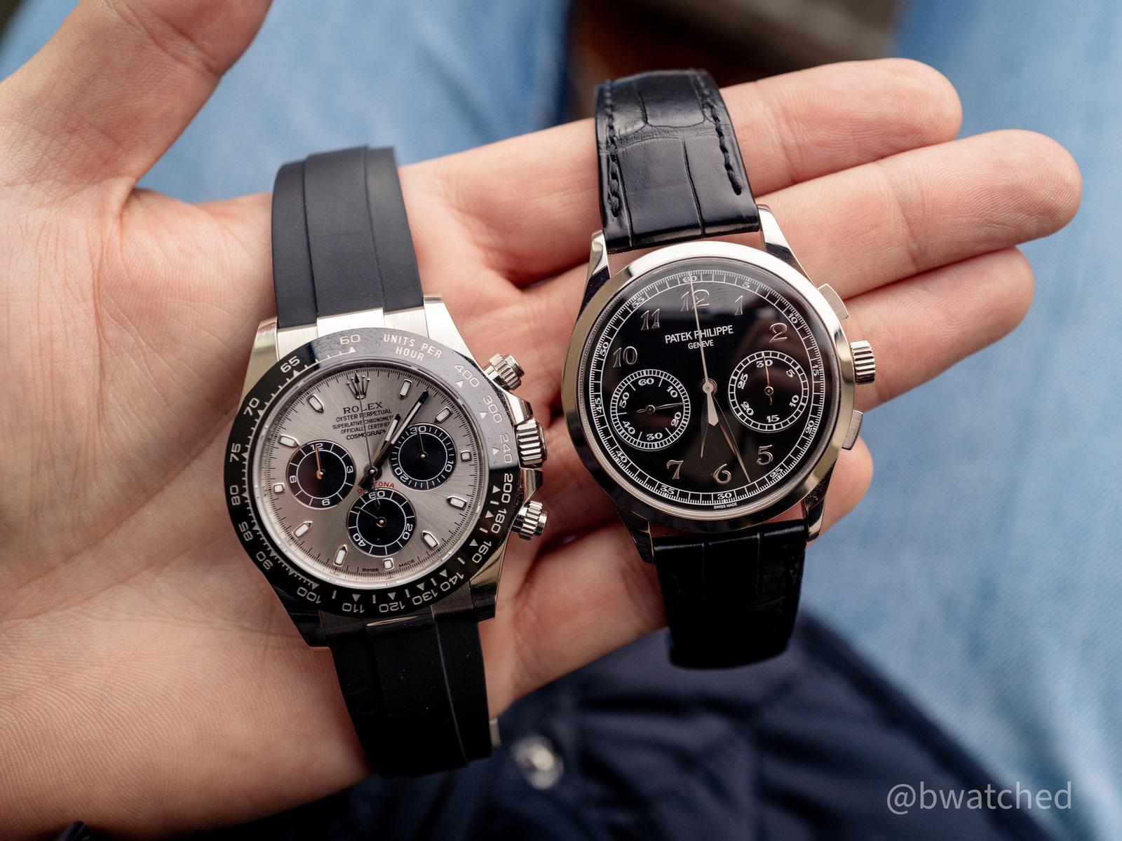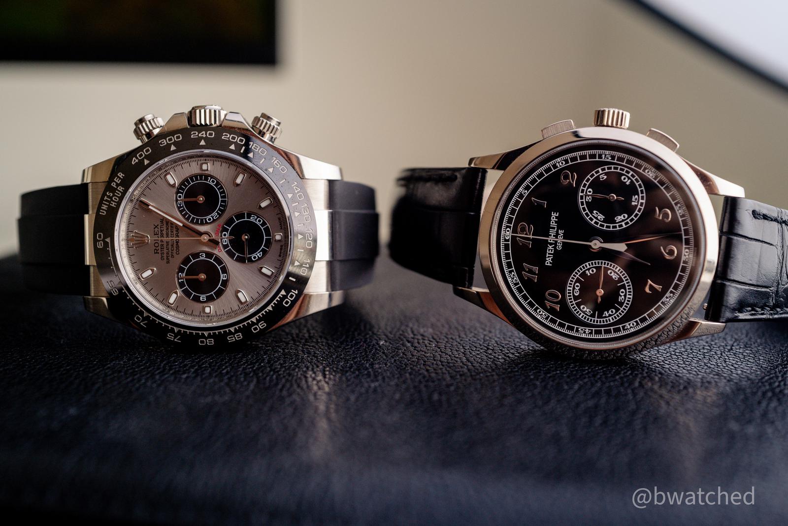 Dat is geen battle, dat is gewoon een slachting. Ik vraag me bijna af hoe je zo’n mooie Patek durft te vergelijken met die tweedehands autoboer- of kermisexploitanten-toestand. Het begint al bij die end-links van die Rollie, en tegen de tijd dat m’n ogen van die verschrikkelijke wijzerplaat naar die geschroefde lugs zijn gegleden staan de tranen al duimdik in m’n tequila van ellende.