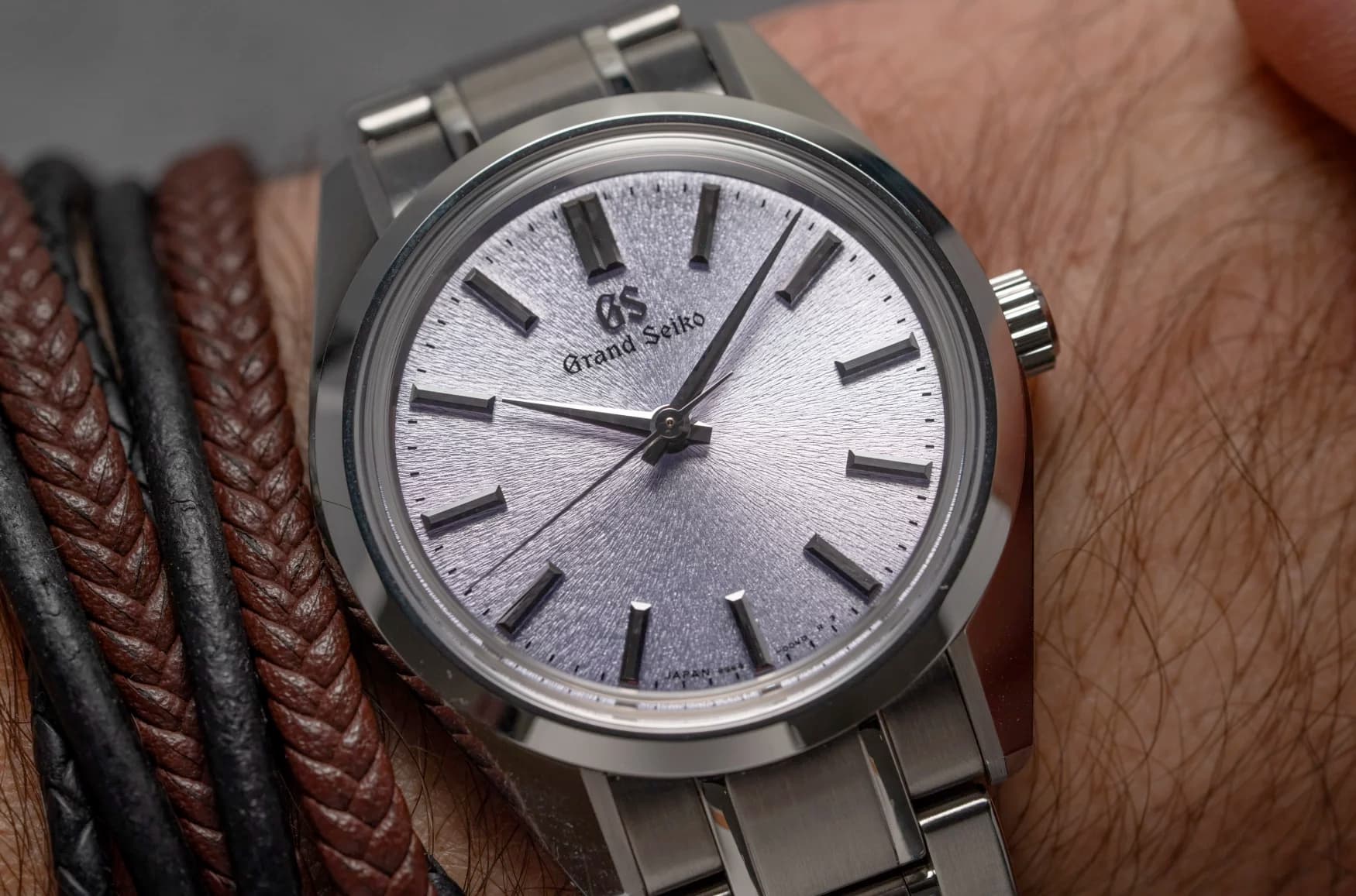 De 36,5mm grote Grand Seiko SBGW323 “Kiri”. Met een licht paarse Mt Iwate dial. Vergeef deze man z’n leren vetertjes in deze foto. Daar kan hij niks aan doen, het is een Australiër.