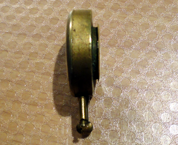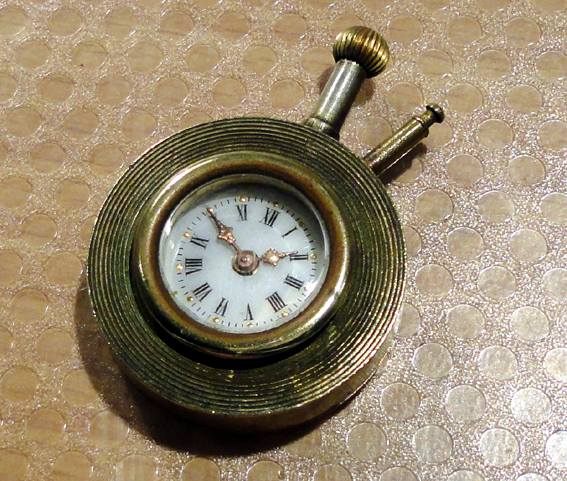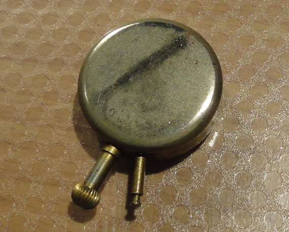 Het is maar een klein ding, 28 mm slechts, en ik moest denken aan zo’n revers klokje. Je steekt het er doorheen en de hele werld behalven jijzelf kan zien hoe laat het is. Maar waarom zit er dan die extra lange verstelknop (is vast niet de juiste benaming) op? Dat zou niet logisch zijn want het zorgt voor een extra zwakke plek. Daarom heb ik het idee dat dit ding een meer permanente plaats innam.