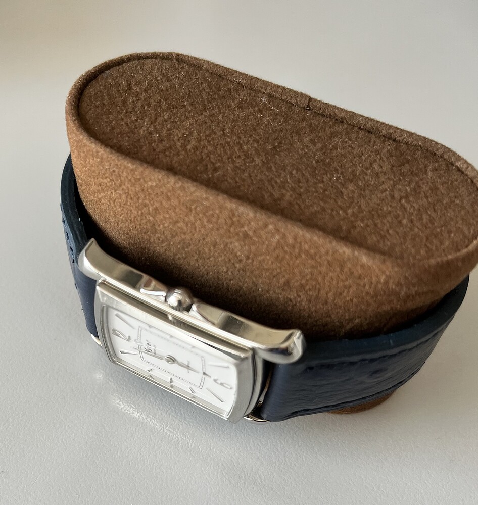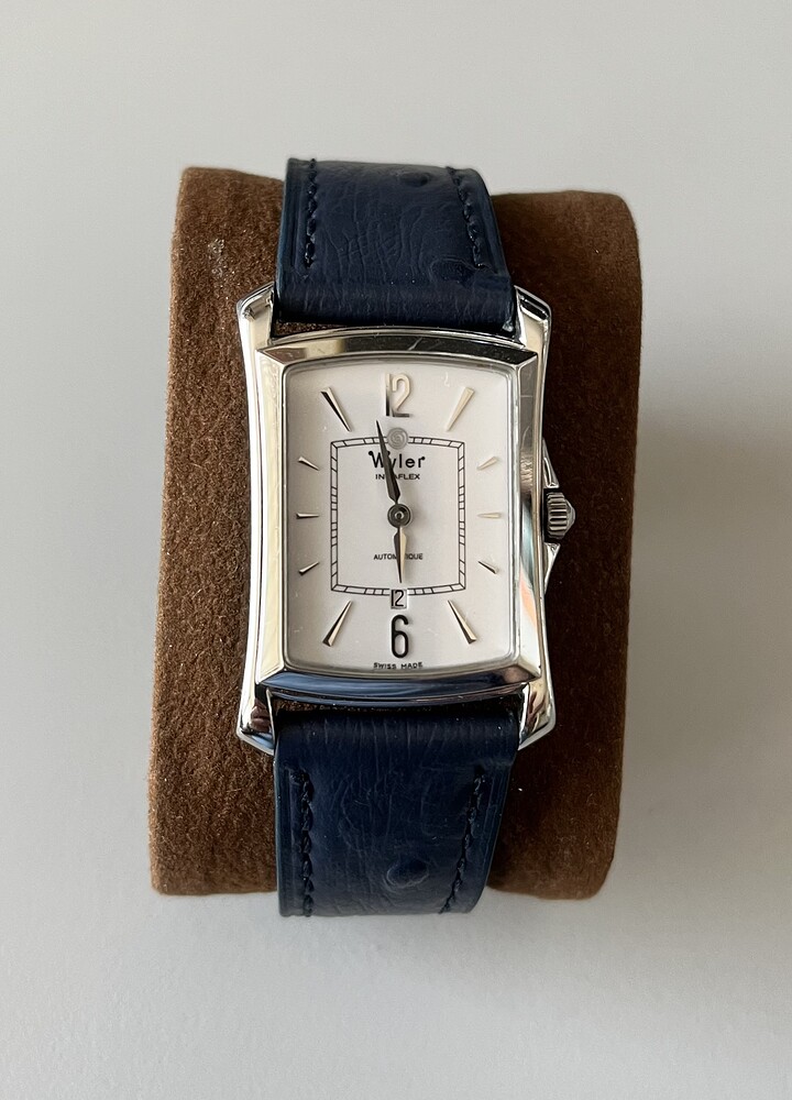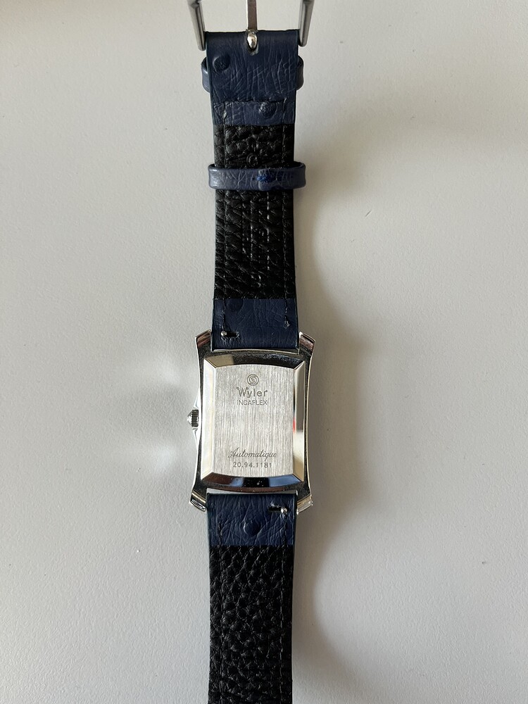 Ik heb wat anders op het oog, dus moet mijn mooie Wyler Incaflex Dynawind vertrekken om ruimte te maken. Mooi Zwitsers merk waar veel over is te vinden op internet. Tegenwoordig in Italiaanse handen onder de naam Wyler-Vetta. Het is een automaat en vermoedelijk van begin jaren ‘90. Ik heb ‘m een jaar geleden als New Old Stock gekocht en hij is in perfecte staat en loopt zeer precies. Paar kleine haarlijntjes op de bezel, maar die zijn met het blote oog nauwelijks zichtbaar. Bandje was verouderd en ik heb er een nieuwe struisvogelprint op gezet. Oude bandje met originele gesp zit er nog bij.