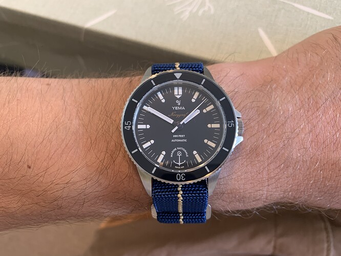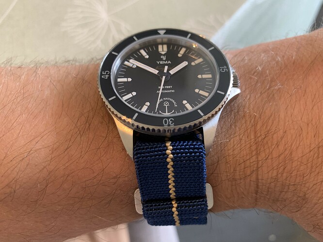 De Navygraf Marine National. Betere foto’s volgen van ‘t weekend. Ik heb ‘m zoals gezegd net opgehaald en geen horlogemakers gereedschap bij me om de band op maat te maken of te wisselen.