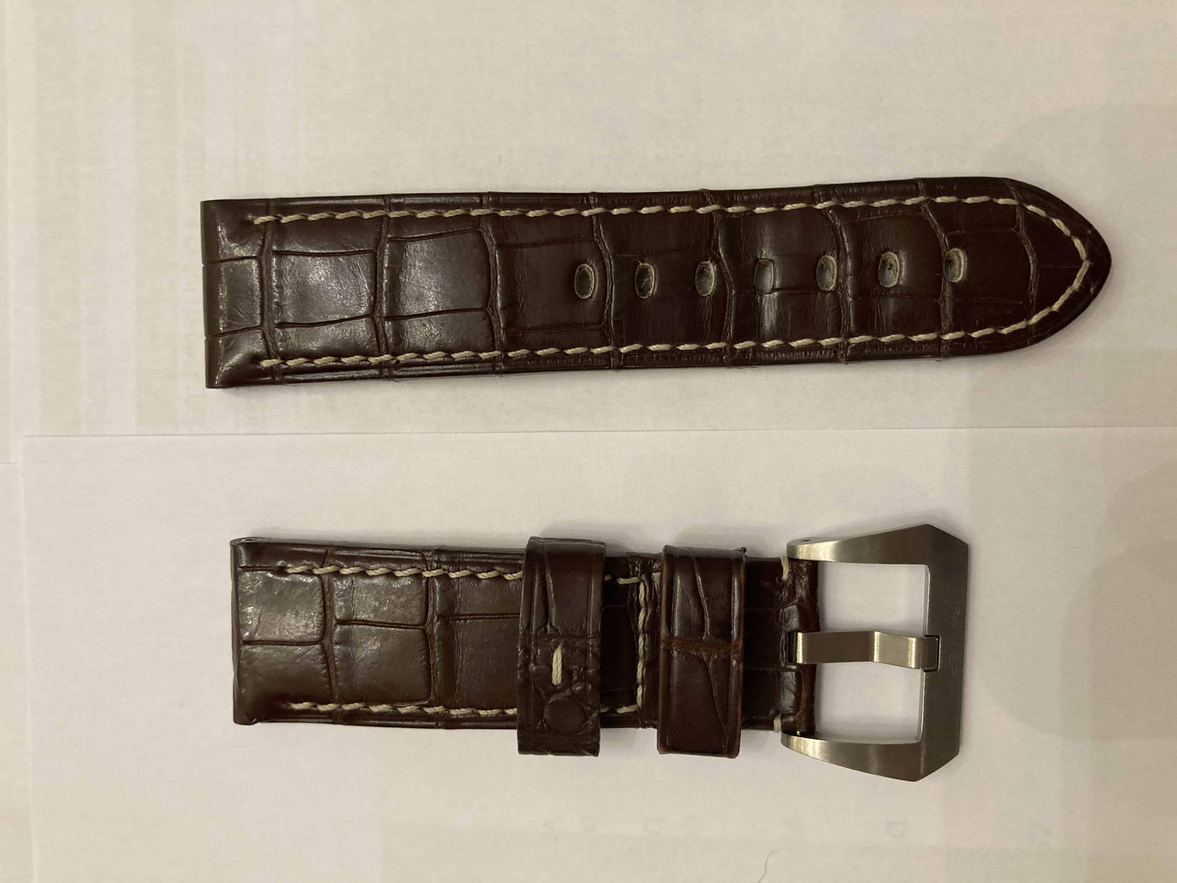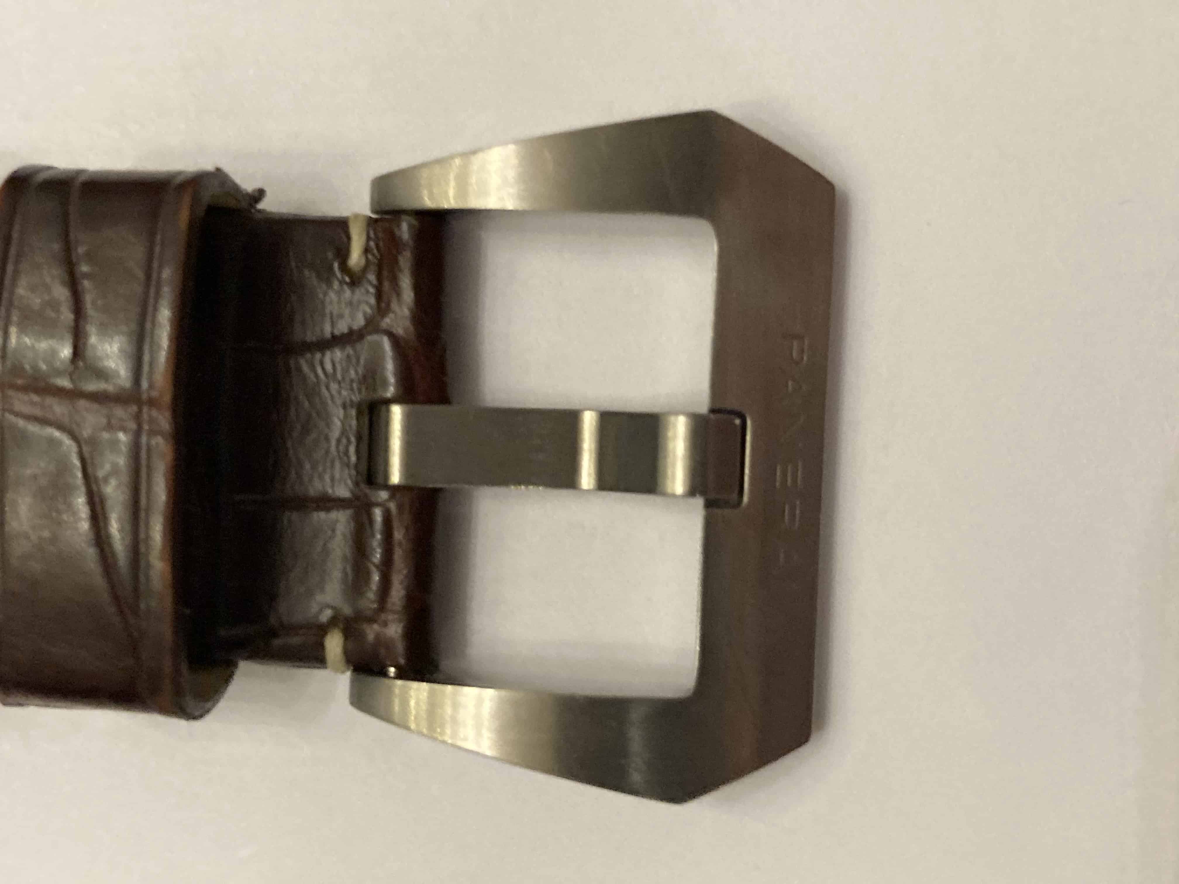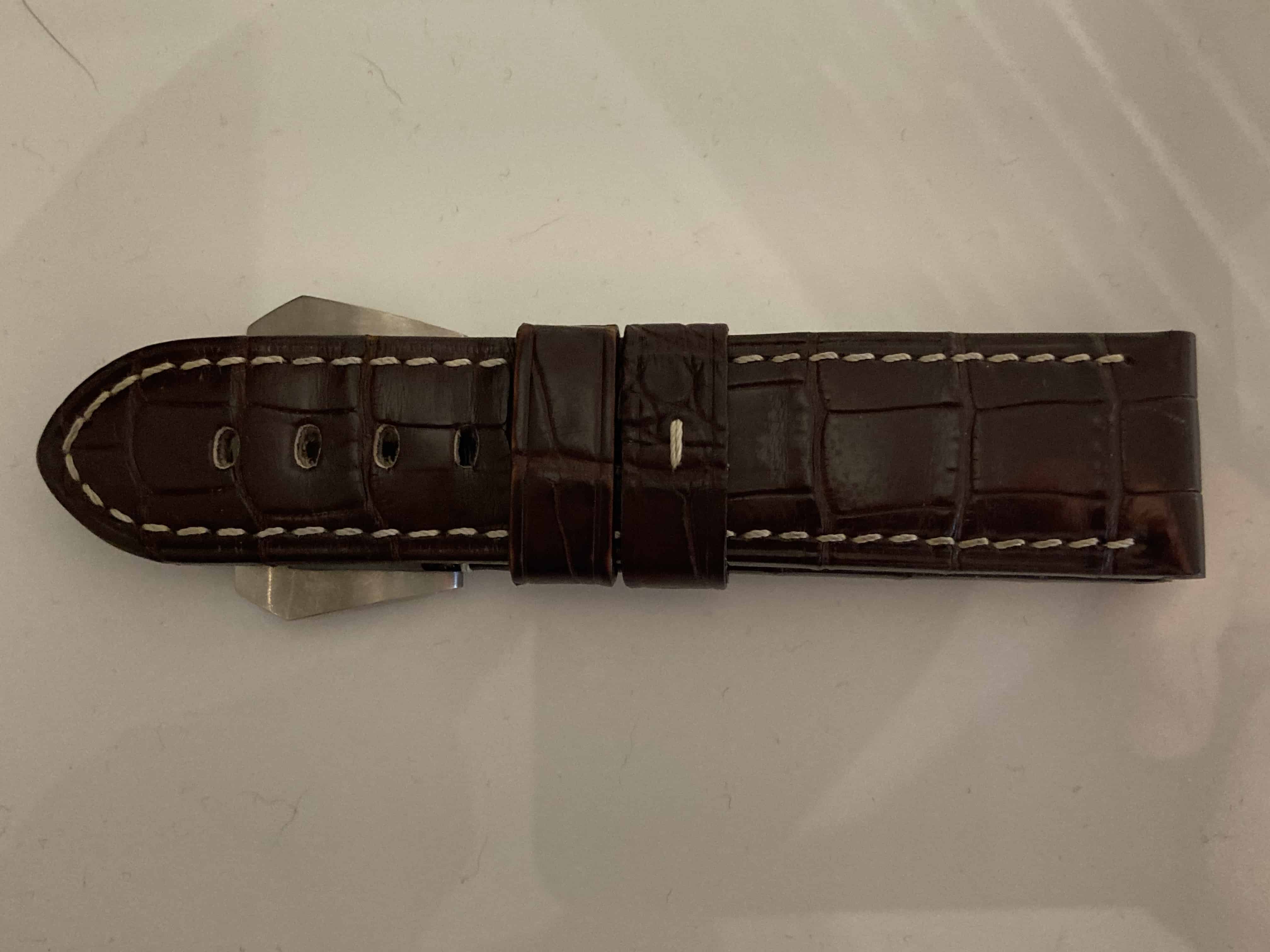 Nagenoeg ongedragen originele Panerai donkerbruine alligator band met originele Panerai matte pin buckle.