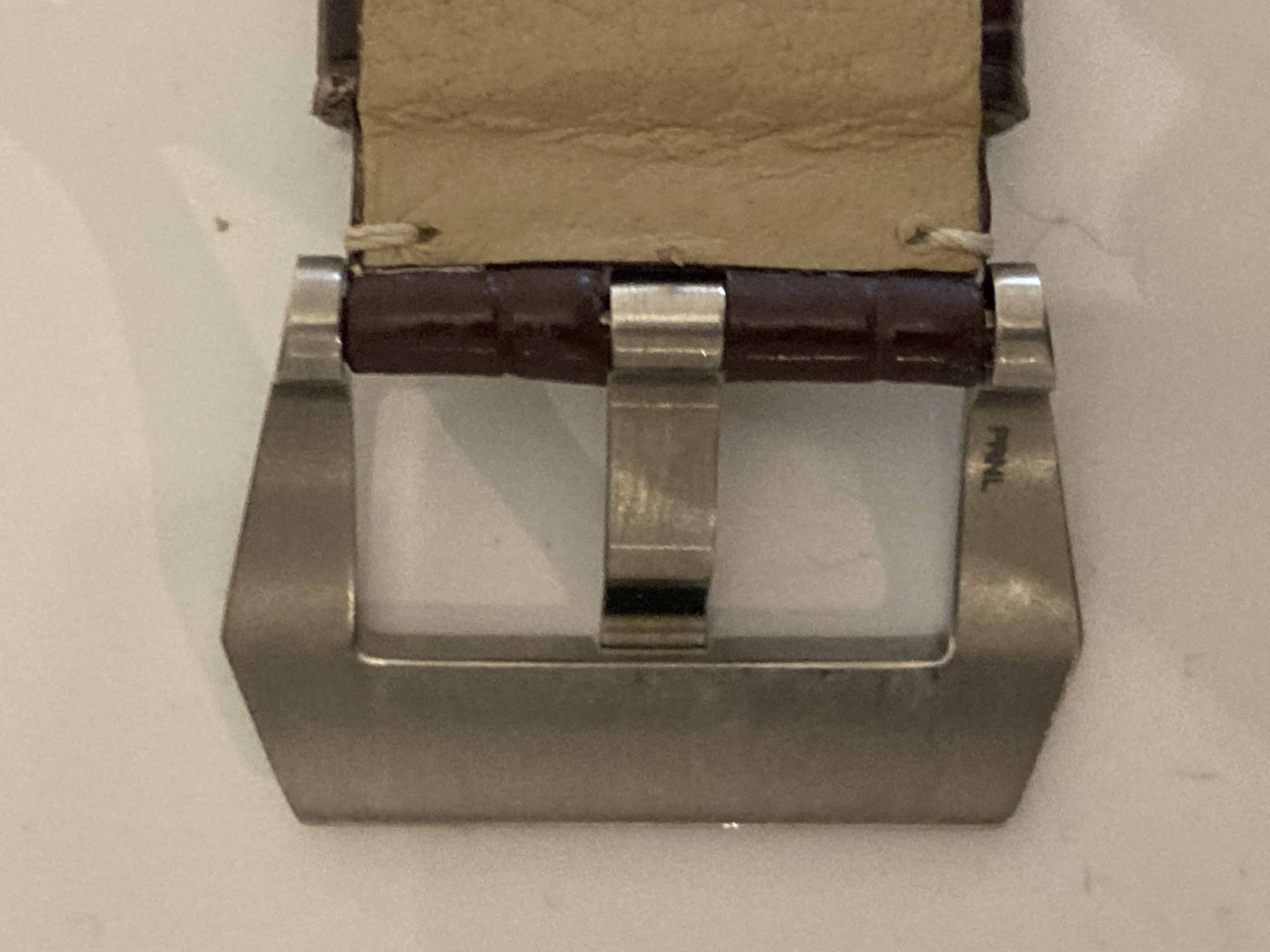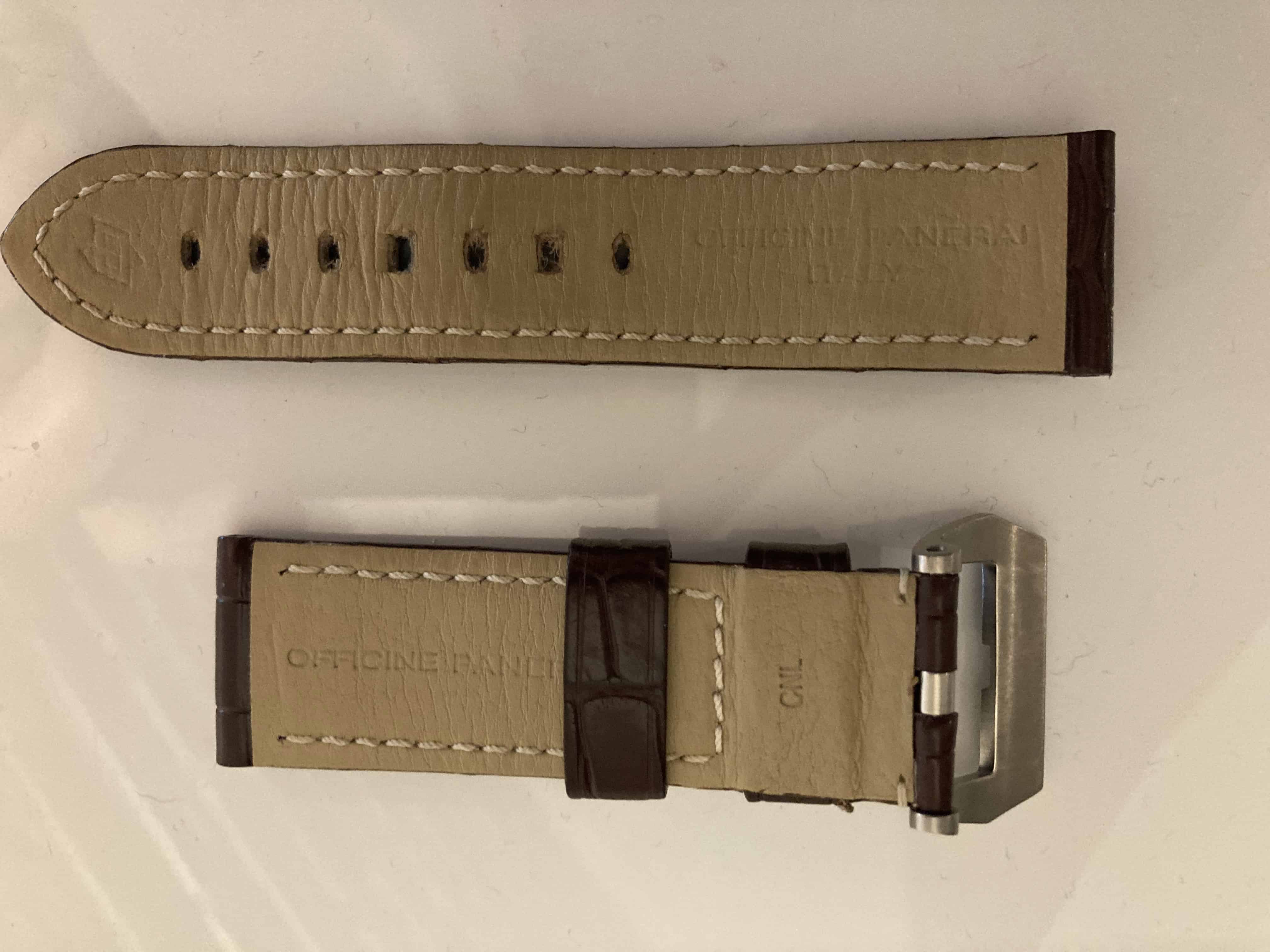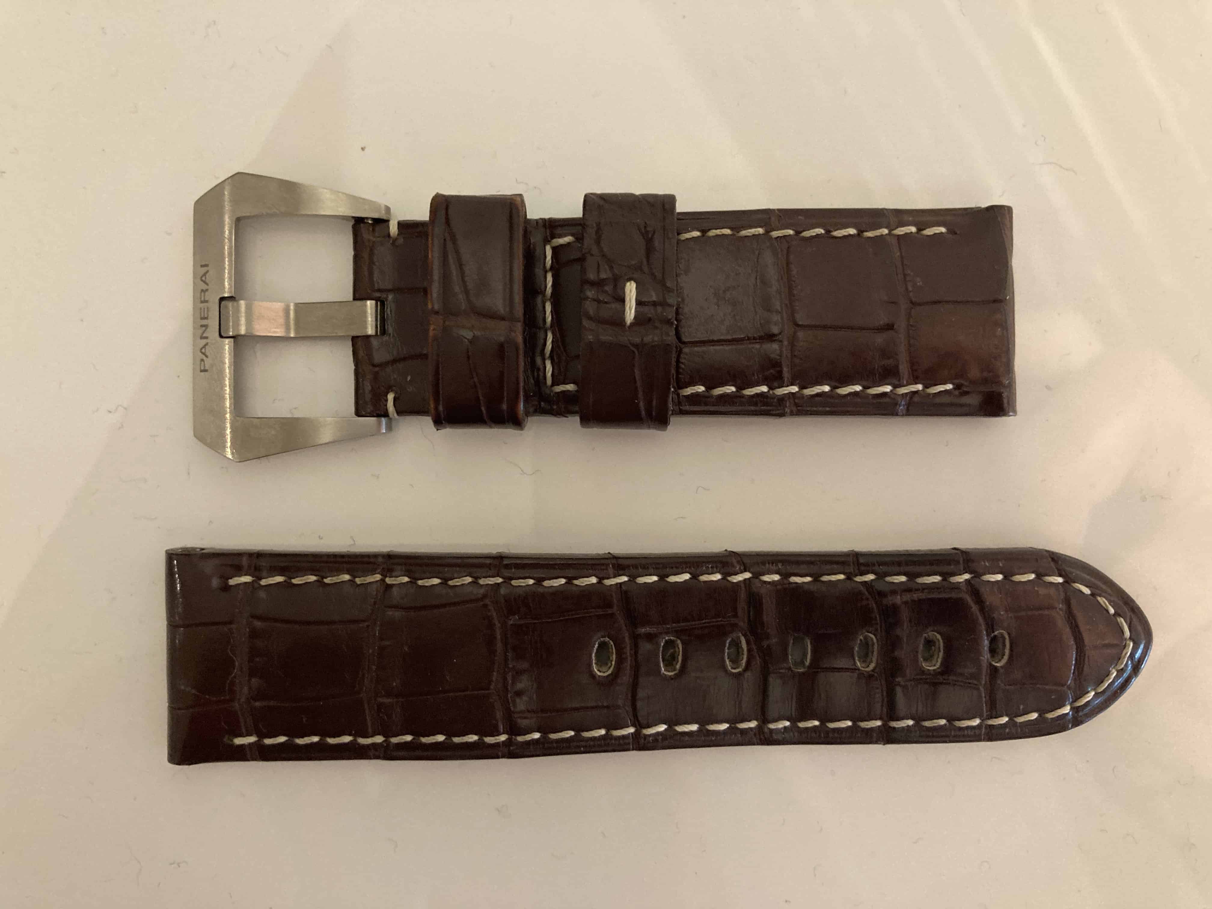 Nagenoeg ongedragen originele Panerai donkerbruine alligator band met originele Panerai matte pin buckle.