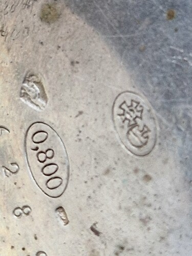 De 0,800 geeft de zilverhoeveelheid aan (80%). Dit is bij mijn weten het laagste gehalte waarbij er nog over een zilveren voorwerp mag worden gesproken.