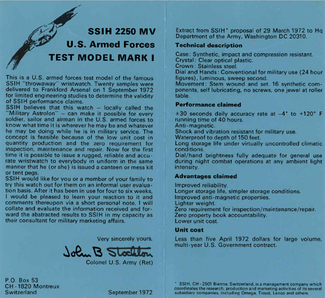 Samen met de onderstaande brief zijn die 20 stuks aan verschillende mensen uitgedeeld met de vraag het horloge een periode (informeel) te dragen en daarna hun bevindingen kenbaar te maken. In de kop van de brief staat SSIH 2250 MV U.S. Armed Forces TEST MODEL MARK I en aan de hand van de omschrijving kun je er vanuit gaan dat het om bovenstaande horloge moet gaan! Alleen het ontbreken van de tekst U.S. Armed Forces doet mij iets twijfelen maar ik denk dat dit te verklaren is omdat het (nog) geen horloge was van de U.S. Armed Forces en het er daarom niet eens op zou mogen staan. Verder is het uiterlijk ook duidelijk een militair horloge en komt de omschrijving overeen met de omschrijving in de brief.