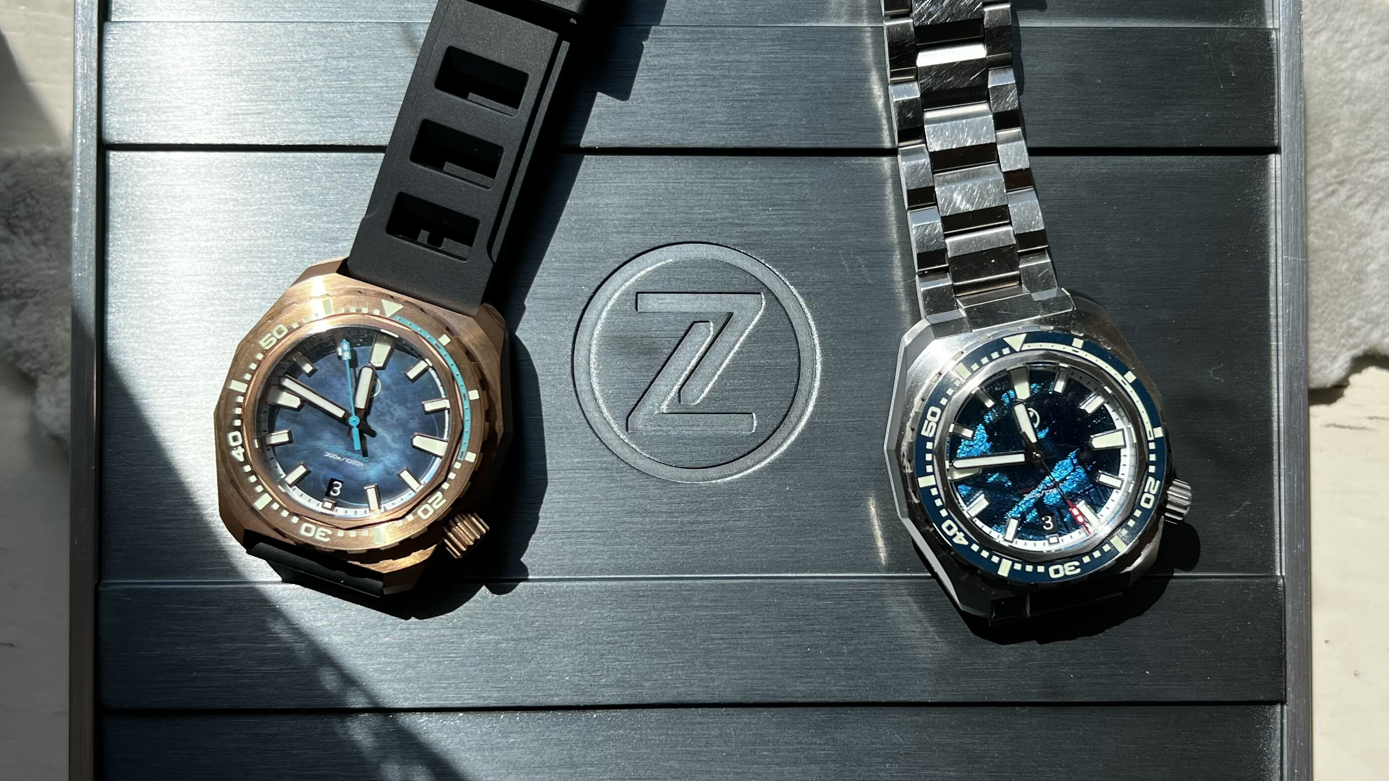 Na mijn eerste aanschaf vorig jaar van een Zelos Hammerhead 3 Meteorite (60/300), dit jaar de bronzen met mother of pearl (006/300) aangeschaft. Fantastisch horloge. Een mailtje naar Elshan voor een extra rubber strap was zo geregeld. Paypal betaling. Ook de exacte afmetingen van de springbars werden prompt beantwoord. (22mm 1.8mm dia, voor de geïnteresseerden)