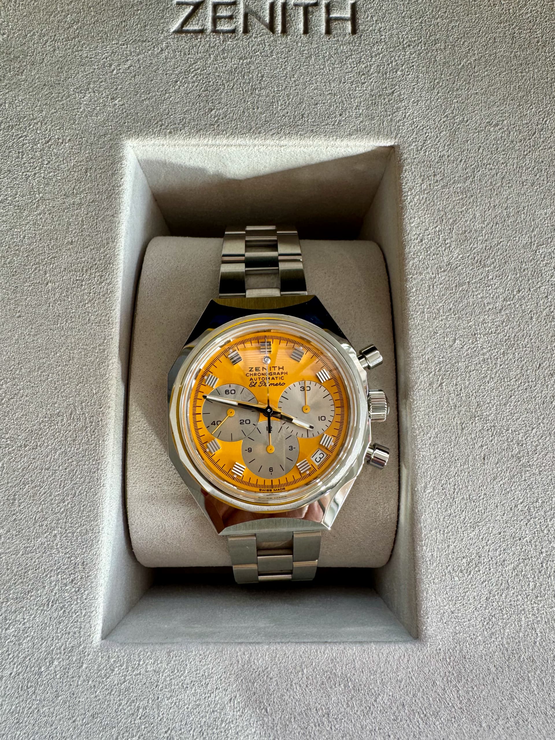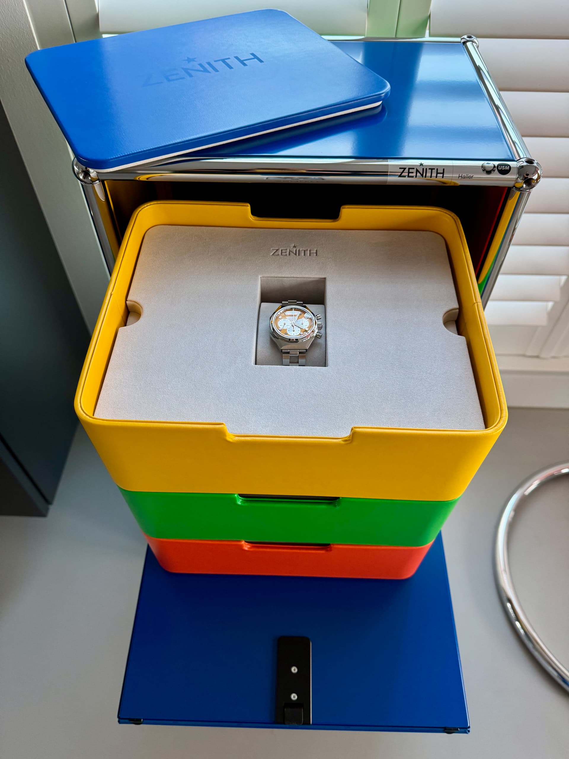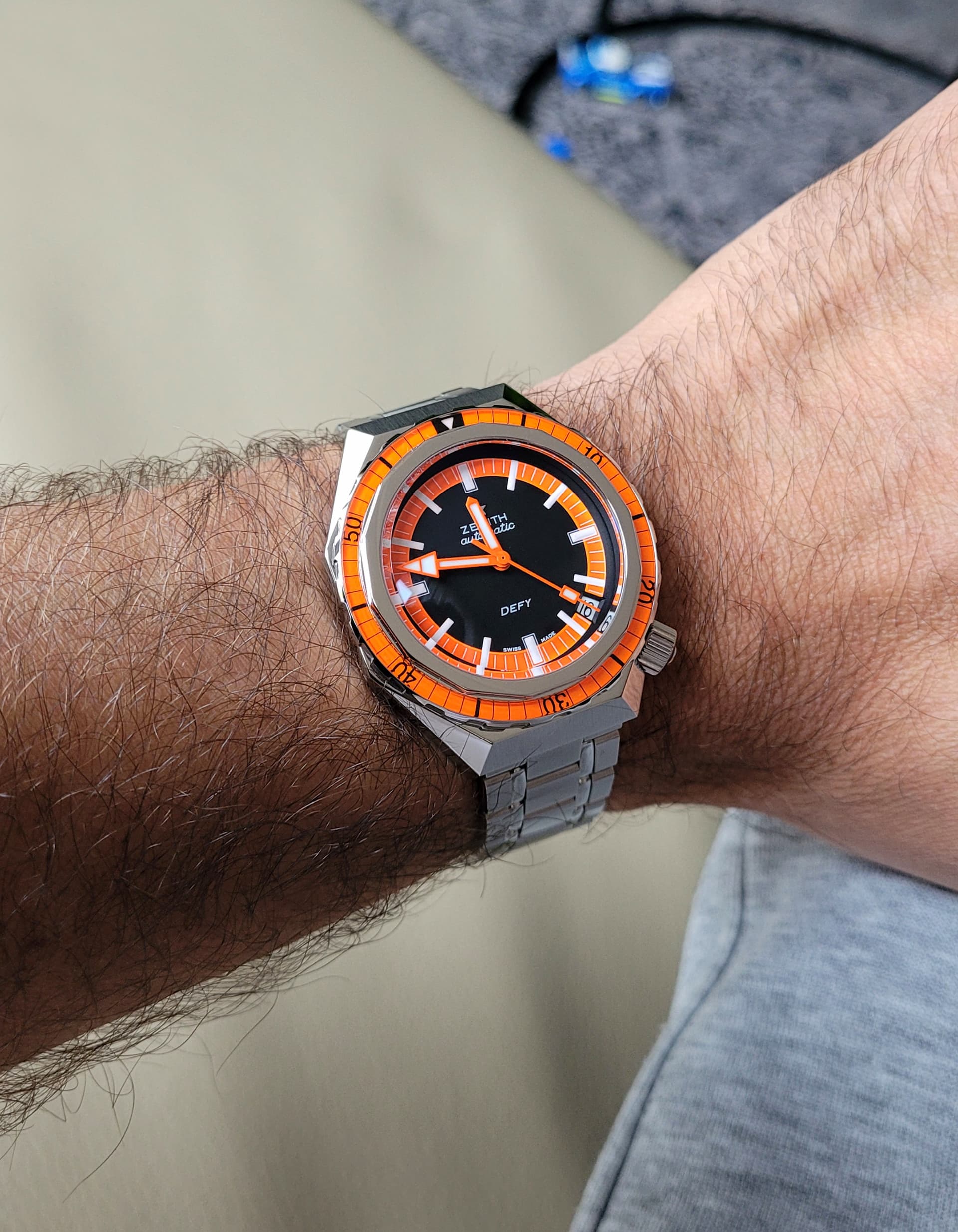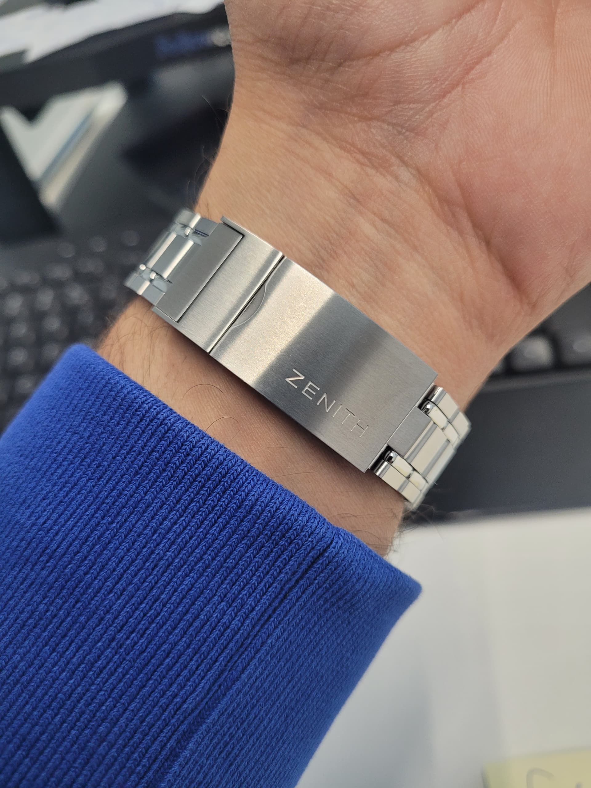Ik was onlangs bij S&C in Amsterdam om eens een paar Zenith horloges te passen. Ik had mijn zinnen gezet op een Defy Revival a3691. Die viel me erg tegen, horloge droeg een stuk groter dan verwacht en de wijzerplaat was erg vlak. De Defy Skyline (36mm) verraste me daarentegen en die wil ik op een ander moment nog eens passen in de donkerblauwe variant.
