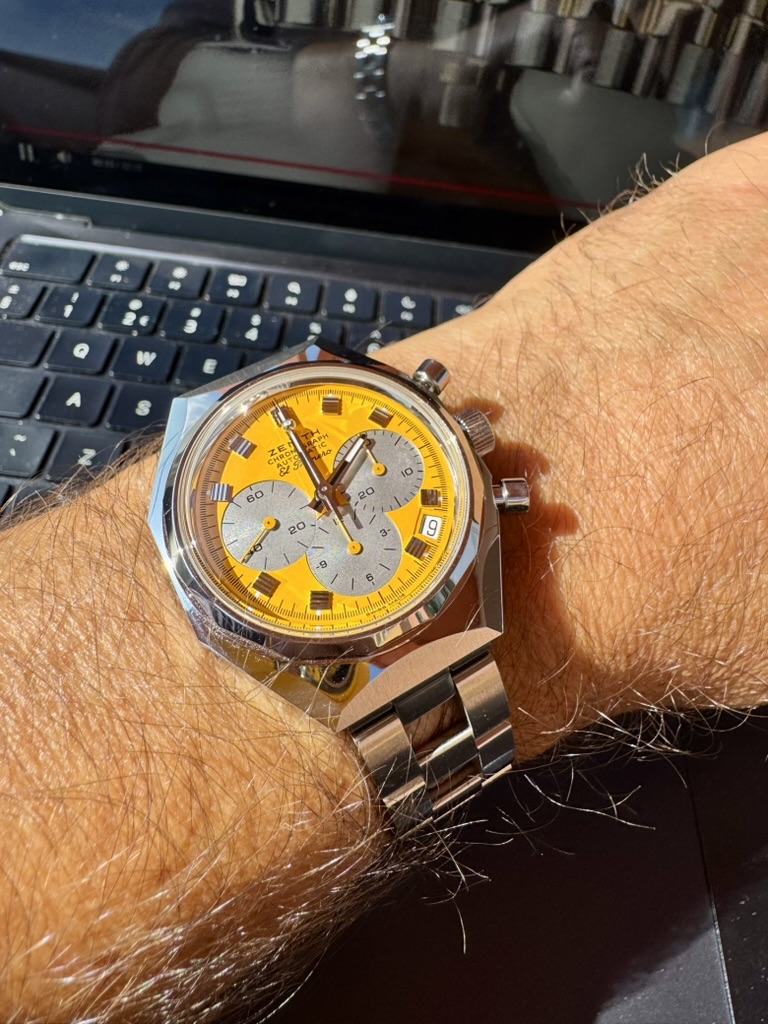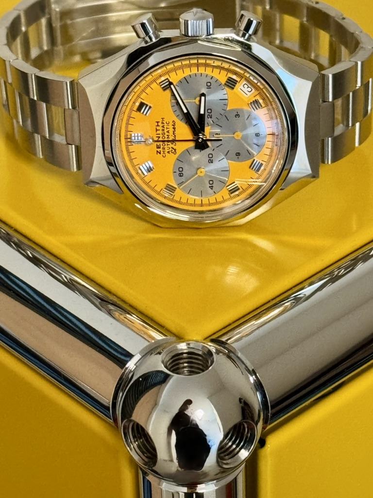 Wat een mooi exemplaar! Defy kast, El Primero caliber en (bijna) mango plaat (met ook weer die Defy indices). Heel heel bijzonder!