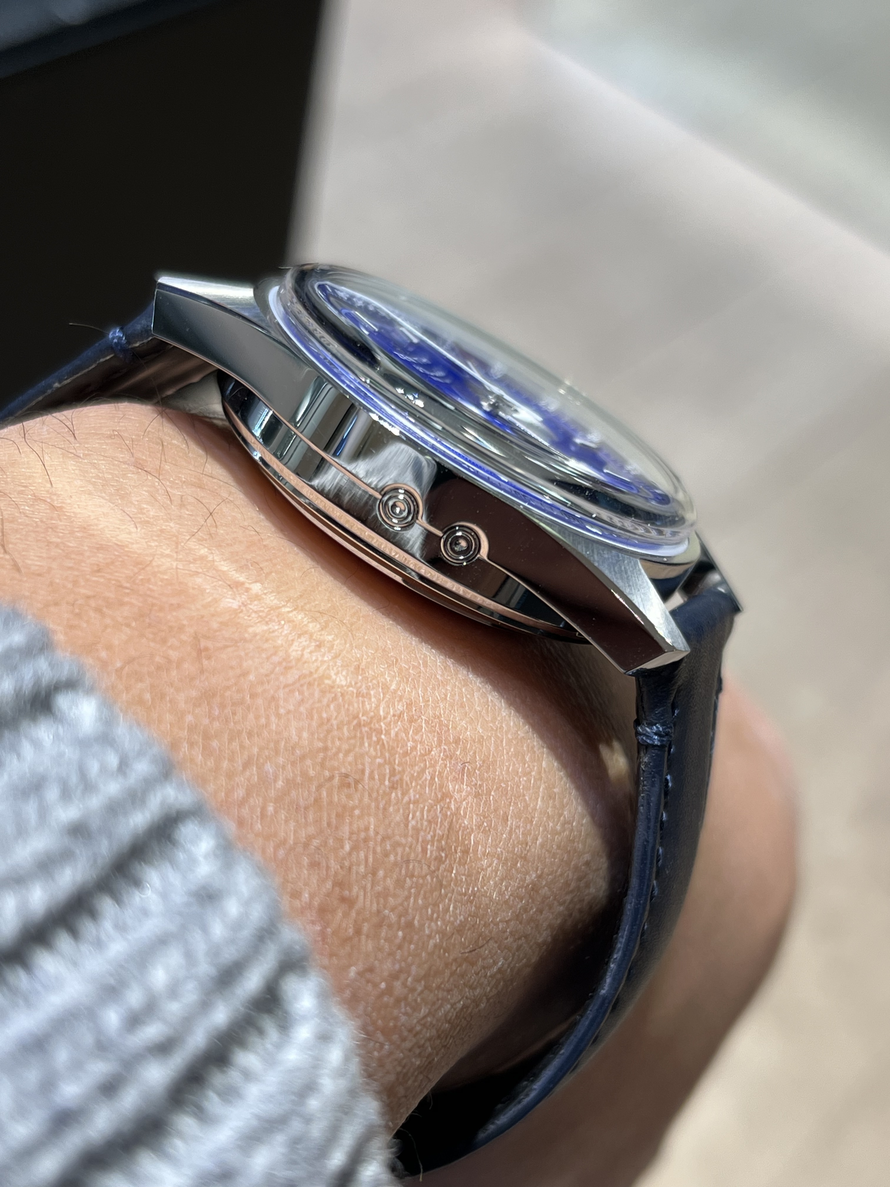 Echter: het blauw van de op zich prachtige lapis lazuli wijzerplaat met goudkleurige spikkels/glitters erin (NB de dial is dus niet van aventurijn!) is best wel ‘hard’ en aanwezig/in your face. Ik ben wat minder hard blauw gewend (bijv. Datejust/Navitimer blauw (beide met sunray), AP RO blauw met patroon en BB58 onverzadigd blauw) en deze tint deed me wat vrouwelijk aan.