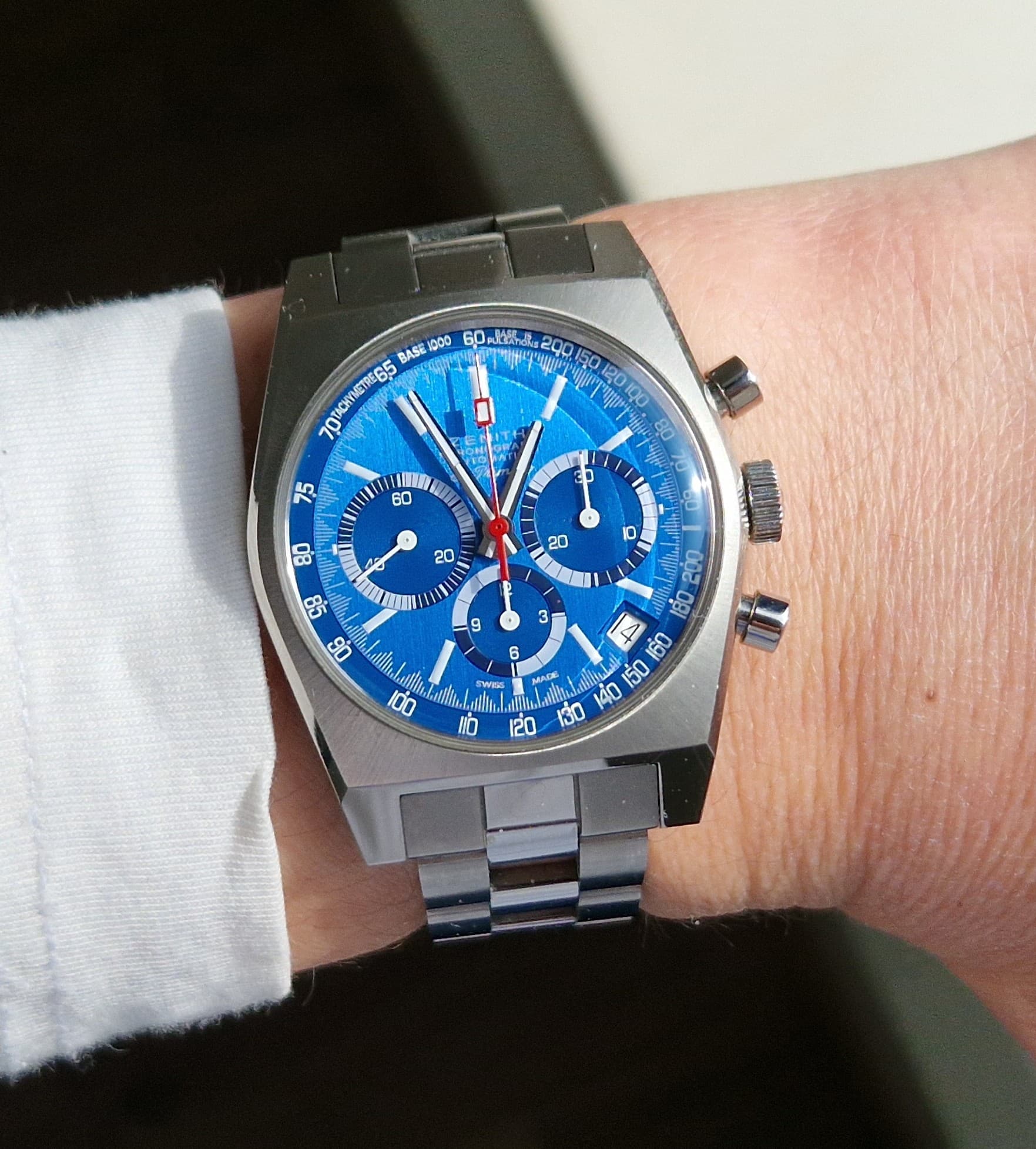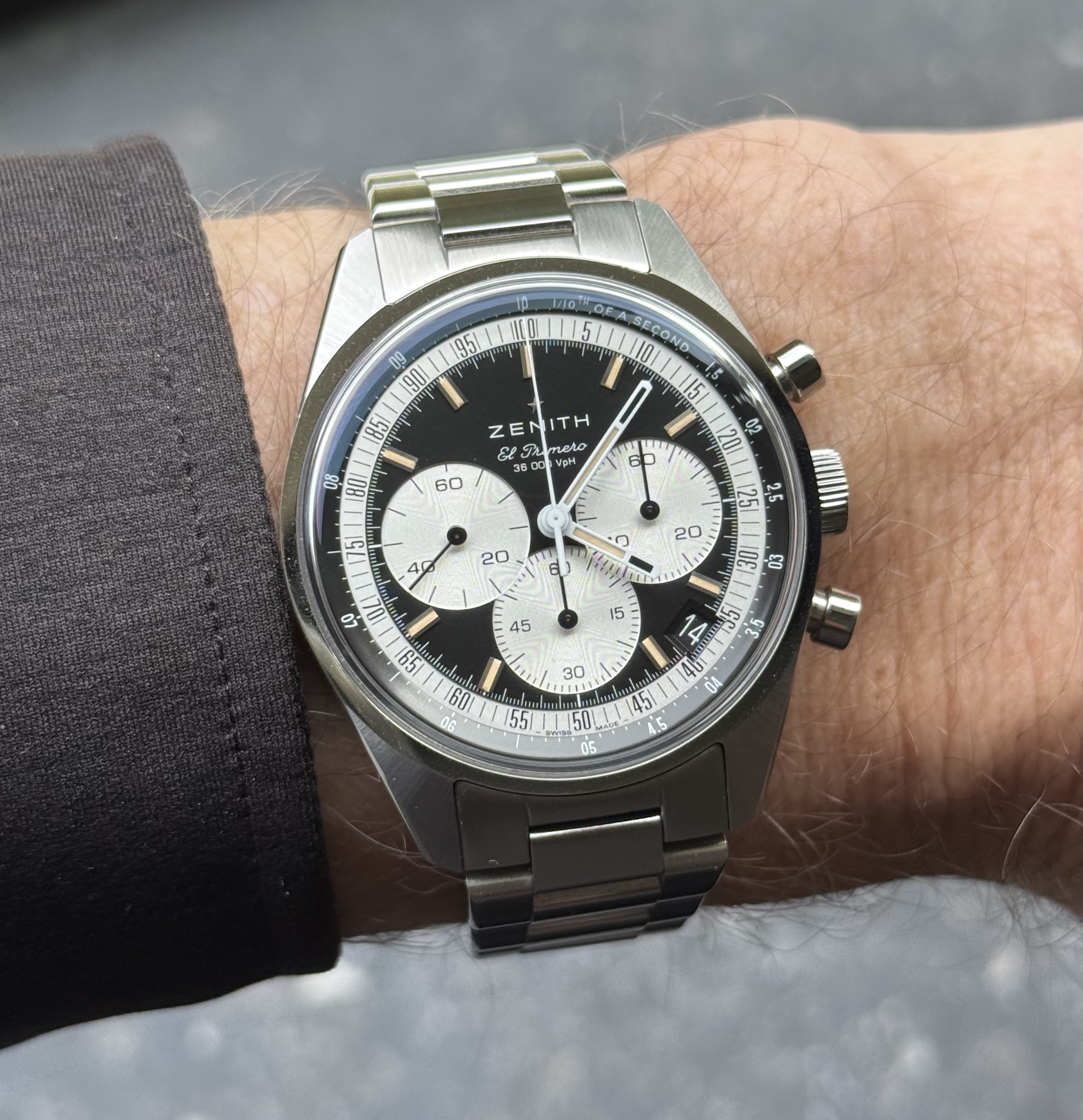 Hij staat je uitstekend. Dat zwarte datumwiel in deze configuratie is een goede move van Zenith.