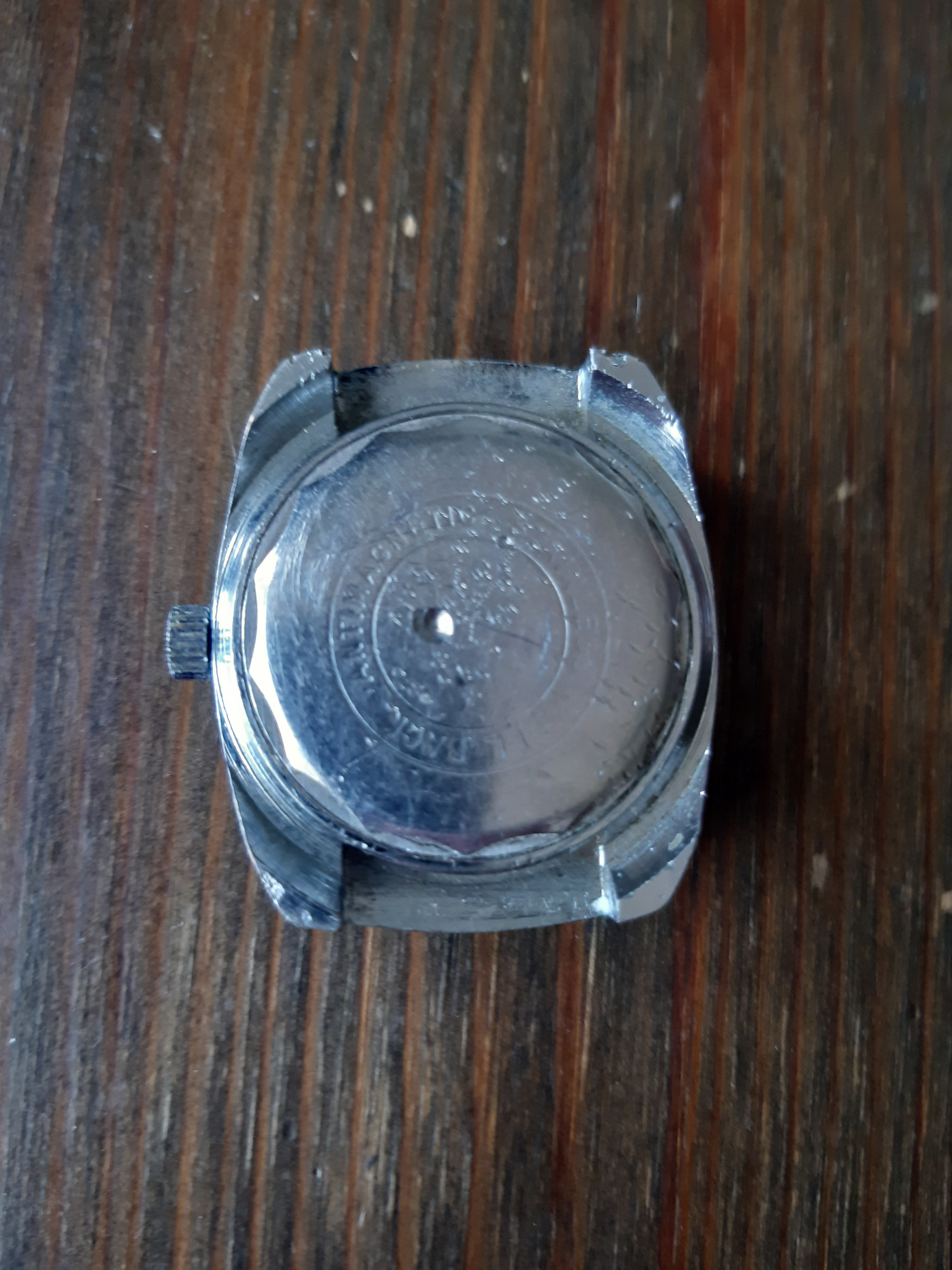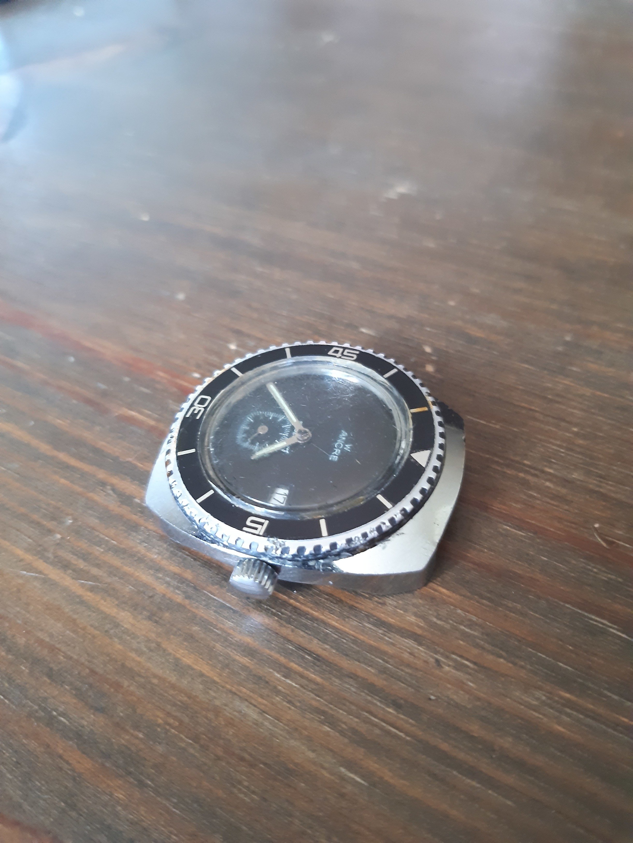Hoi allemaal, binnenkort gaan we verhuizen dus het is tijd om te gaan ruimen… Vandaag heb ik met mijn dochter een begin gemaakt met het opruimen van de zolder. Er staan daar spullen die daar al 20 jaar liggen, waaronder een klein kistje met wat spullen uit mijn jeugd. Daar zat onder anderen dit horloge in, ik heb het denk ik ooit eens van mijn opa gekregen. Na een paar slagen aan de kroon begon het meteen weer te lopen, maar helaas lijkt de minutenwijzer een beetje los te zitten. De lunette en achterdeksel zitten muurvast, die ga ik nog wel proberen los te krijgen. Maar de wijzerplaat valt me op. Geen enkele index? Het enige wat er staat is een W, ancre en shockproof. Als ik er met een felle lamp op schijn, dan zie ik wel iets van opgelegde indexen maar het is net alsof iemand (toen al?) een mod heeft uitgevoerd en met zwarte verf ofzo de wijzerplaat heeft ‘gestript’. Er is een licht kleurverschil tussen het zwart om de letters en de rest van de wijzerplaat. Op de lunette lijken wat oude lijmresten te zitten. Dat moet zeker meer dan 30 jaar geleden zijn gedaan dan, maar zeker niet door opa. Die was niet zo van priegelwerk. Van de achterkant wordt je ook niet wijzer, daar staat alleen ‘antimagnetic - stainless steel back’. Grappig om te vinden!