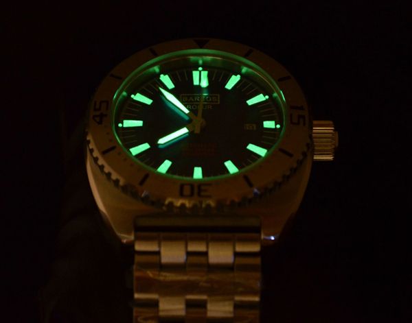 Bovendien heeft het automatische Miyota-uurwerk hacking en is handopwindbaar, ook al zo solide. Door de bijna afwezige lugs draagt dit forse horloge (46 mm zonder kroon!) probleemloos op mijn dunne polsje. Hij is wel wat hoger dan ik gewend ben, nl ruim 16 mm , maar omdat hij probleemloos mijn pols volgt heb je daar geen last van.