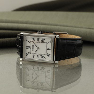 Seiko Tank, past onder iedere mouw, aan het altaar denkt men dat je een Cartier draagt, en mocht je nette pak onder de champagne en taart zitten dan koop je zo een nieuwe.