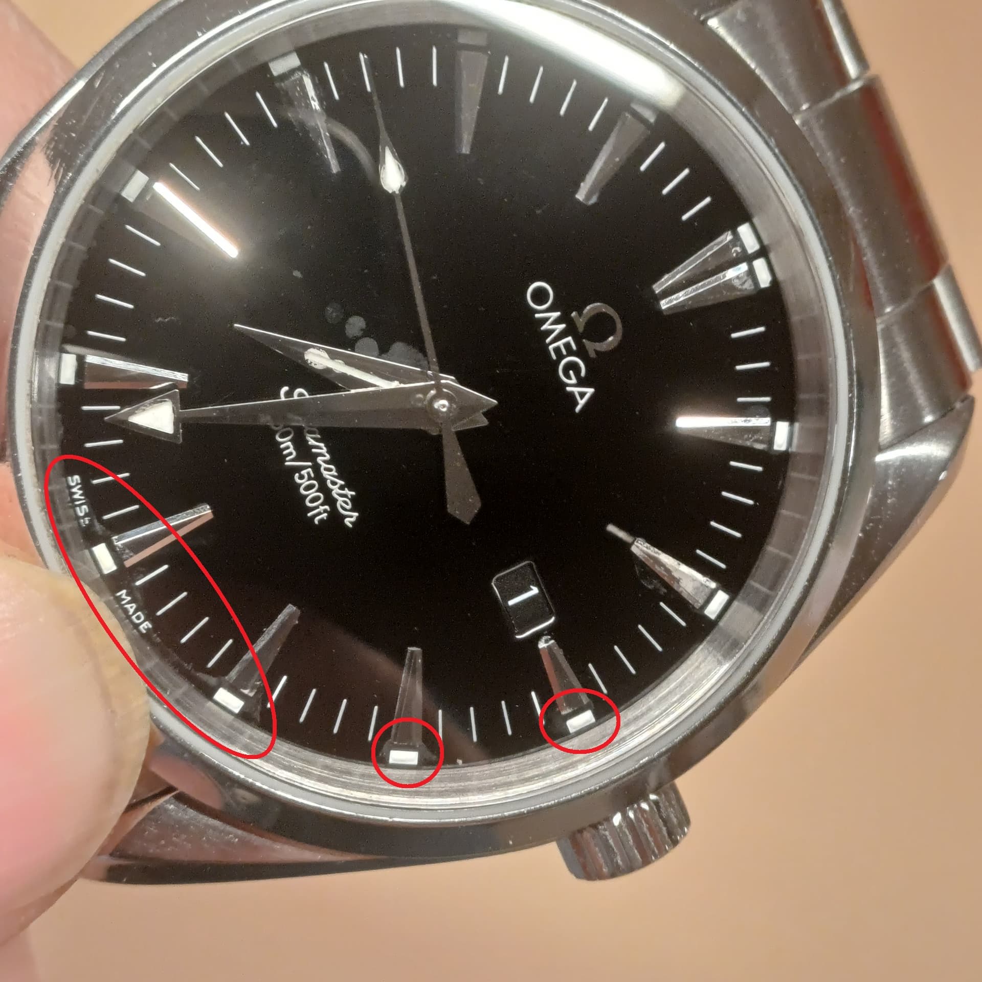 Ja, dat is duidelijk te zien. Wat een domper. Ik zou denken dat dit vochtschade is. Rondom het Swiss Made en bij de 5 minuten markers van 3, 4 en 5 uur lijkt het ook niet helemaal kosher.