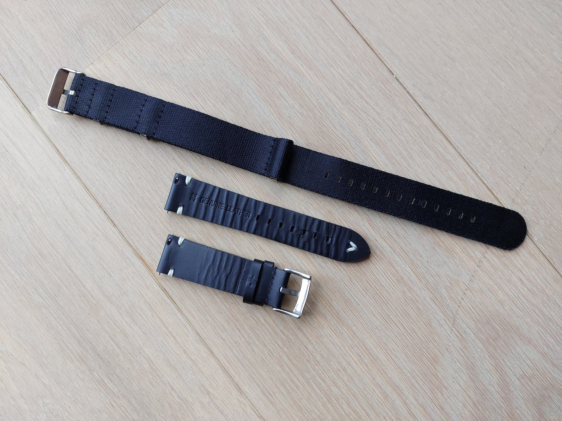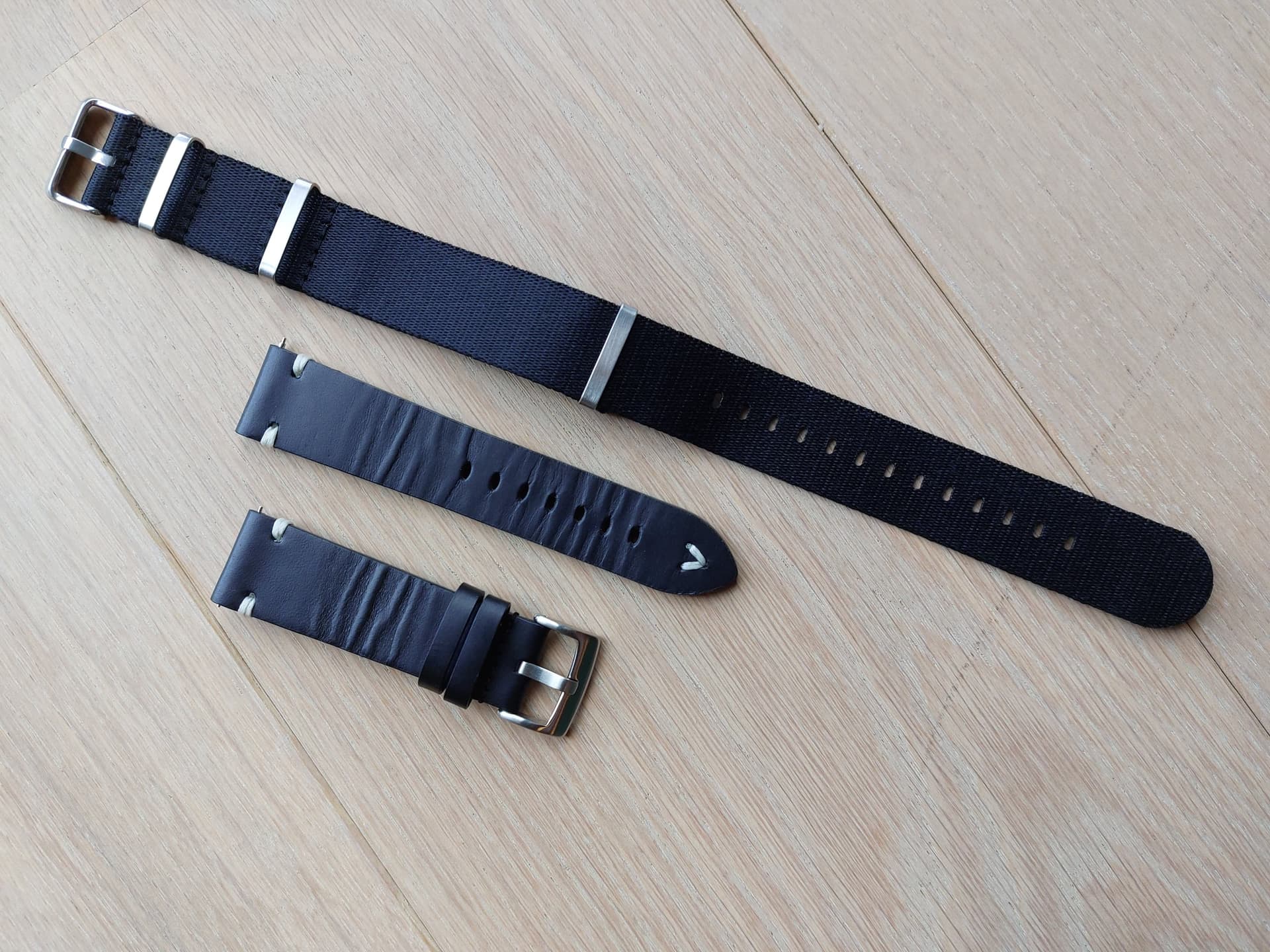 Ongebruikte zwart (wax) leder bandje, NATO en mesh in 22 mm: 50 EUR incl. verzending naar pakjespunt (thuisadres met T&T: 55 EUR).