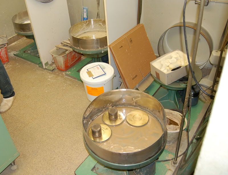 Een geweldige verzameling mineralen liggen her en der verspreid door de werkplaats, in het “stoffige” gedeelte, waar gezaagd en gepolijst wordt.